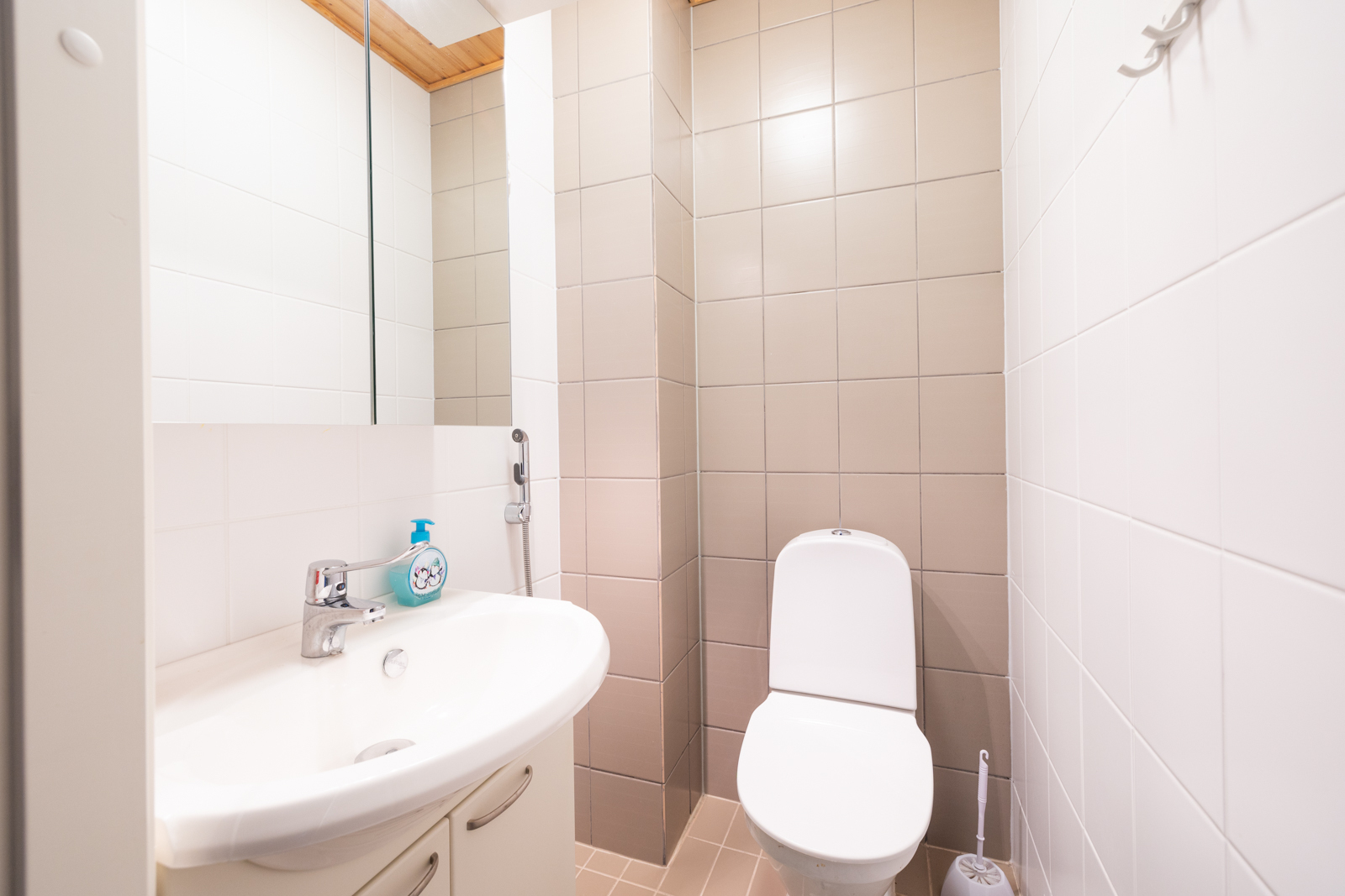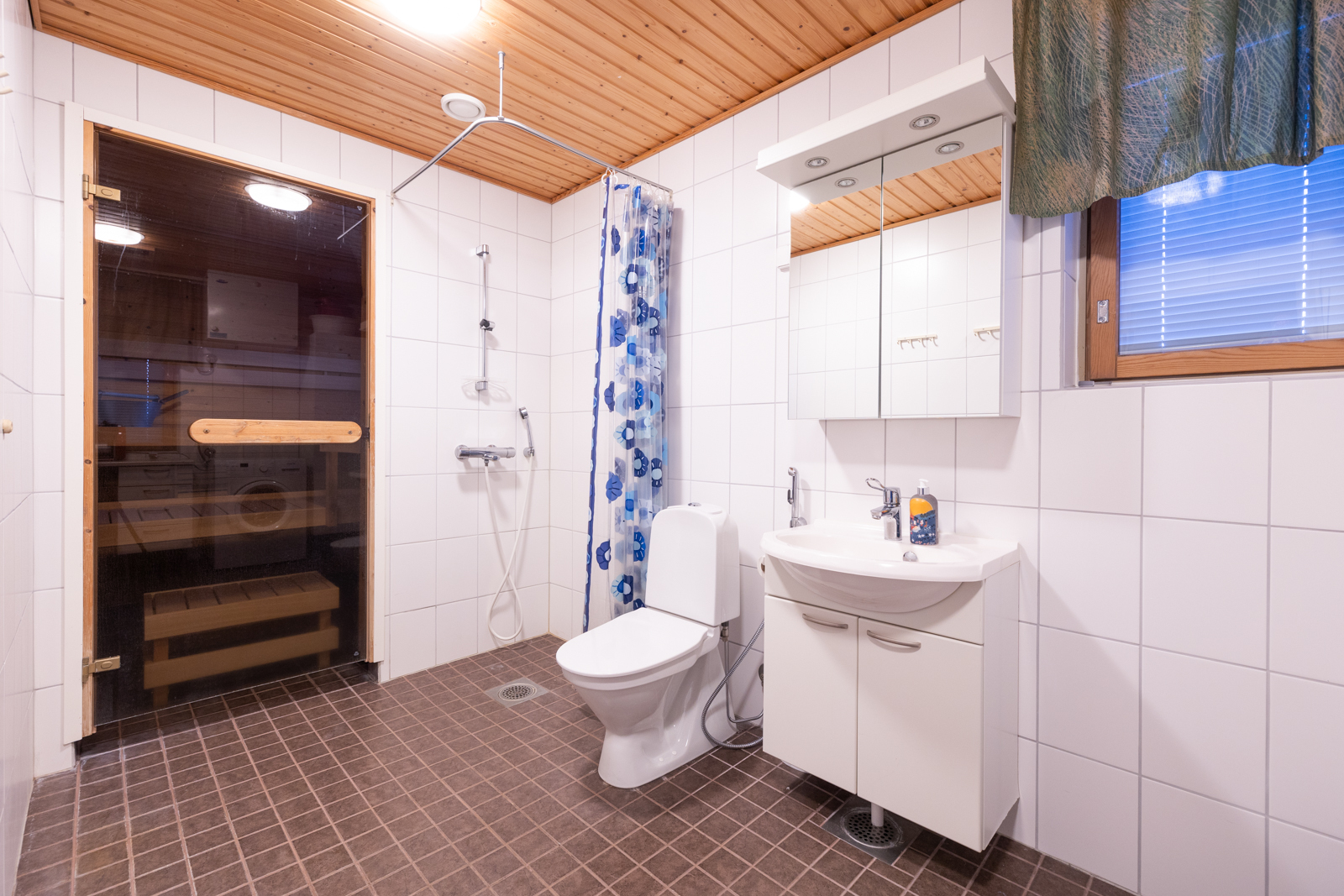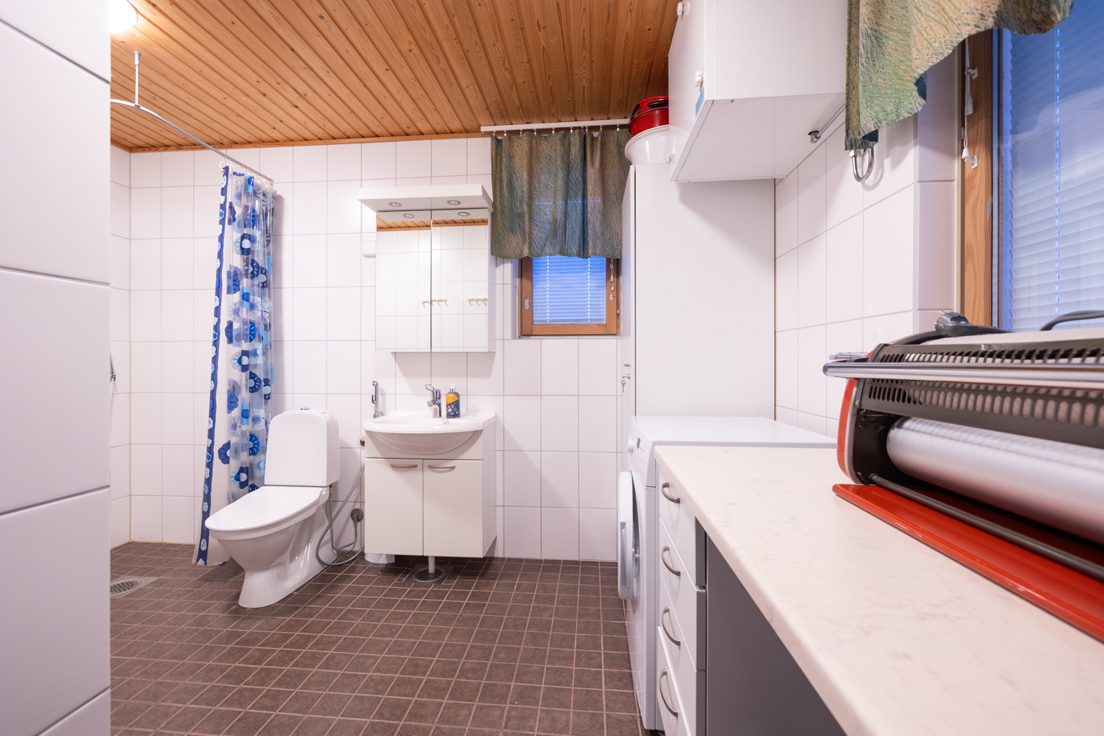 | Kylpyhuoneen kuvaus | Suihku, lattialämmitys, wc-istuin, peilikaappi ja kiinteät valaisimet, seinät (kaakeli), lattiat (laatta) |