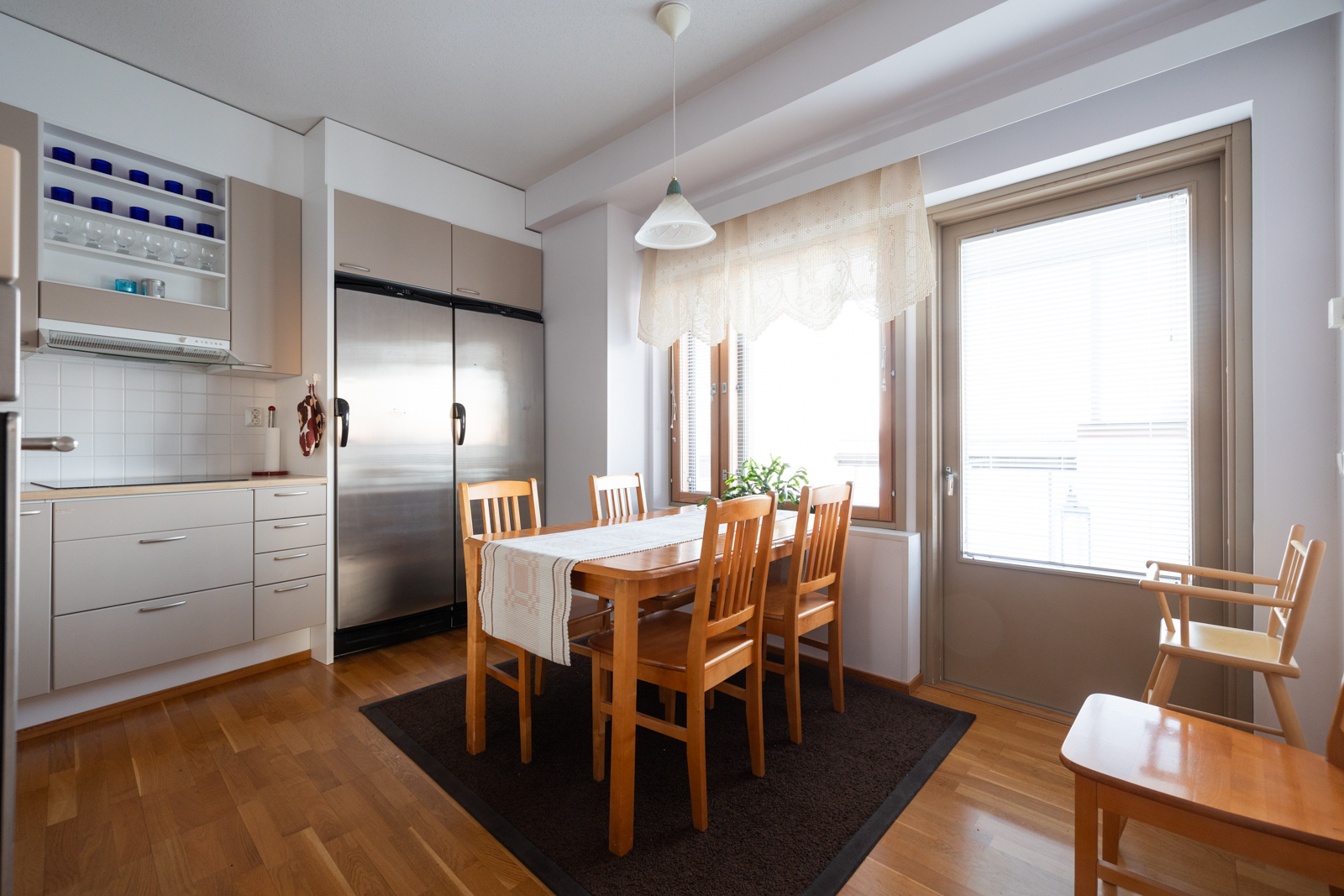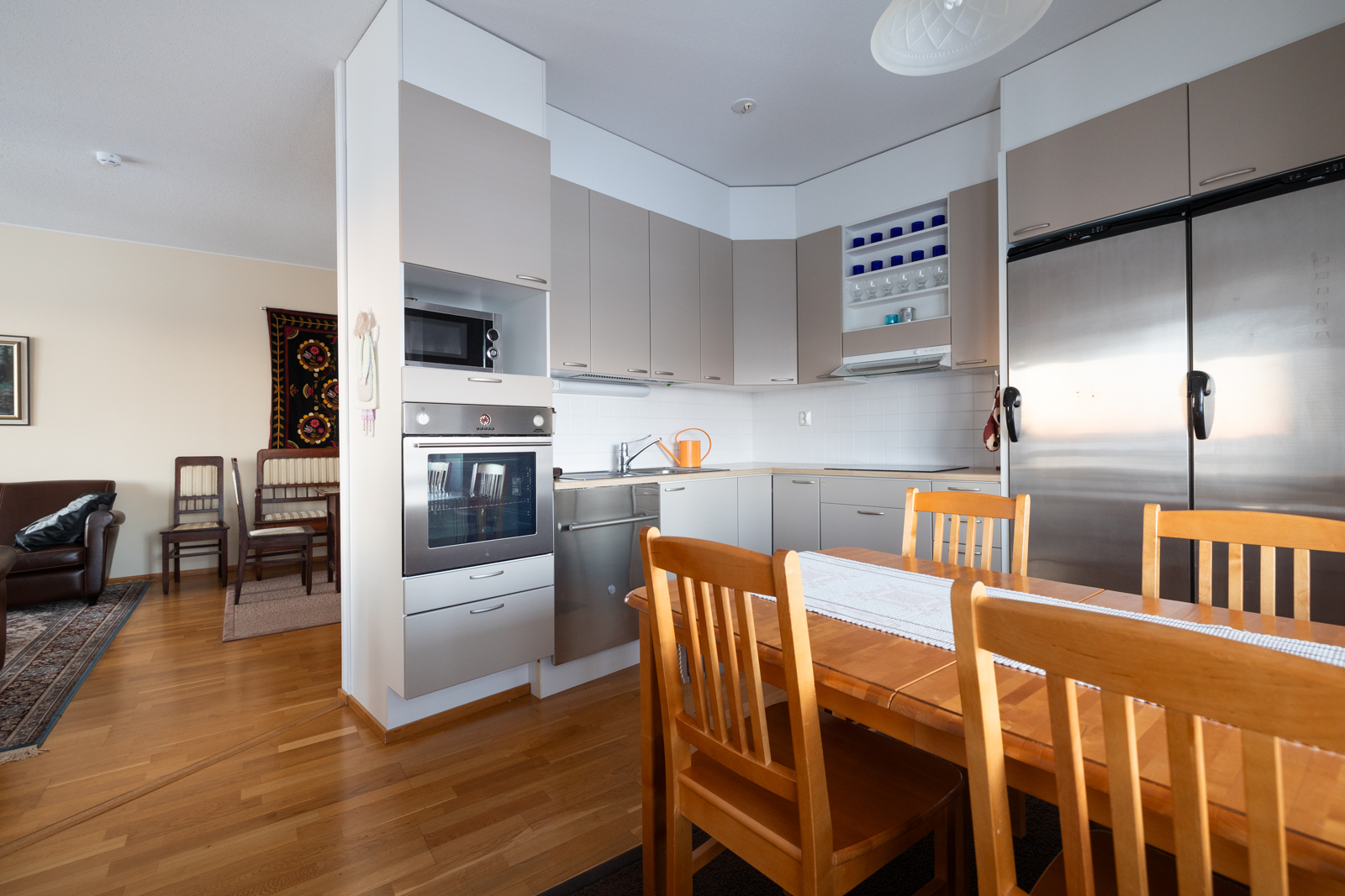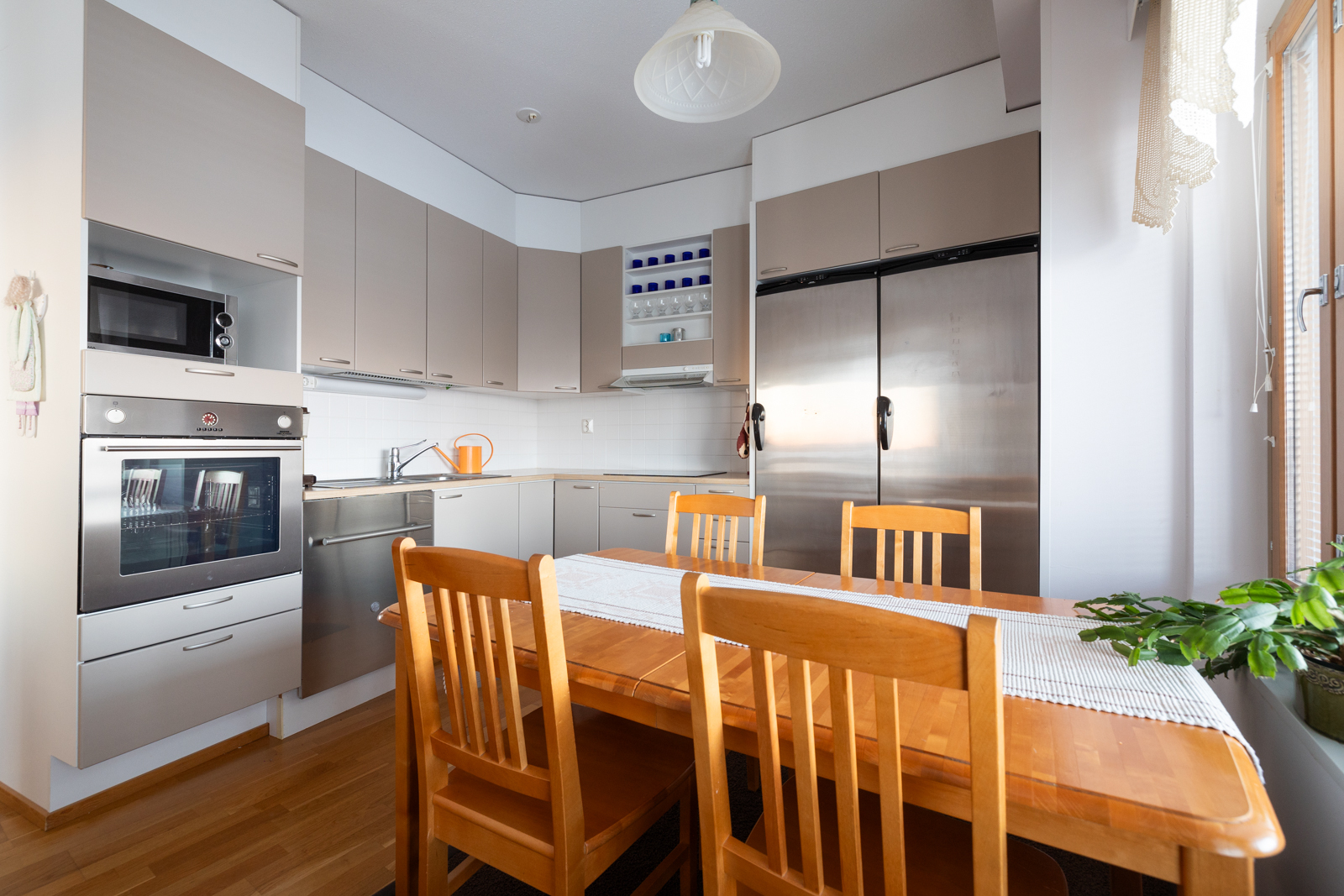 | Keittiön kuvaus | Liesi (erillisuuni, liesitaso), seinät (maali), lattiat (parketti), erillisuuni, jää-viileäkaappi, erillinen pakastin, liesituuletin, astianpesukone ja liesitaso |