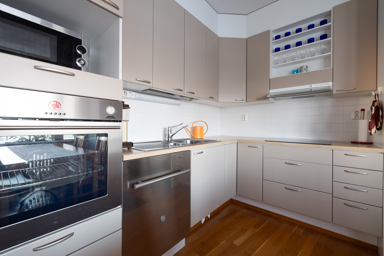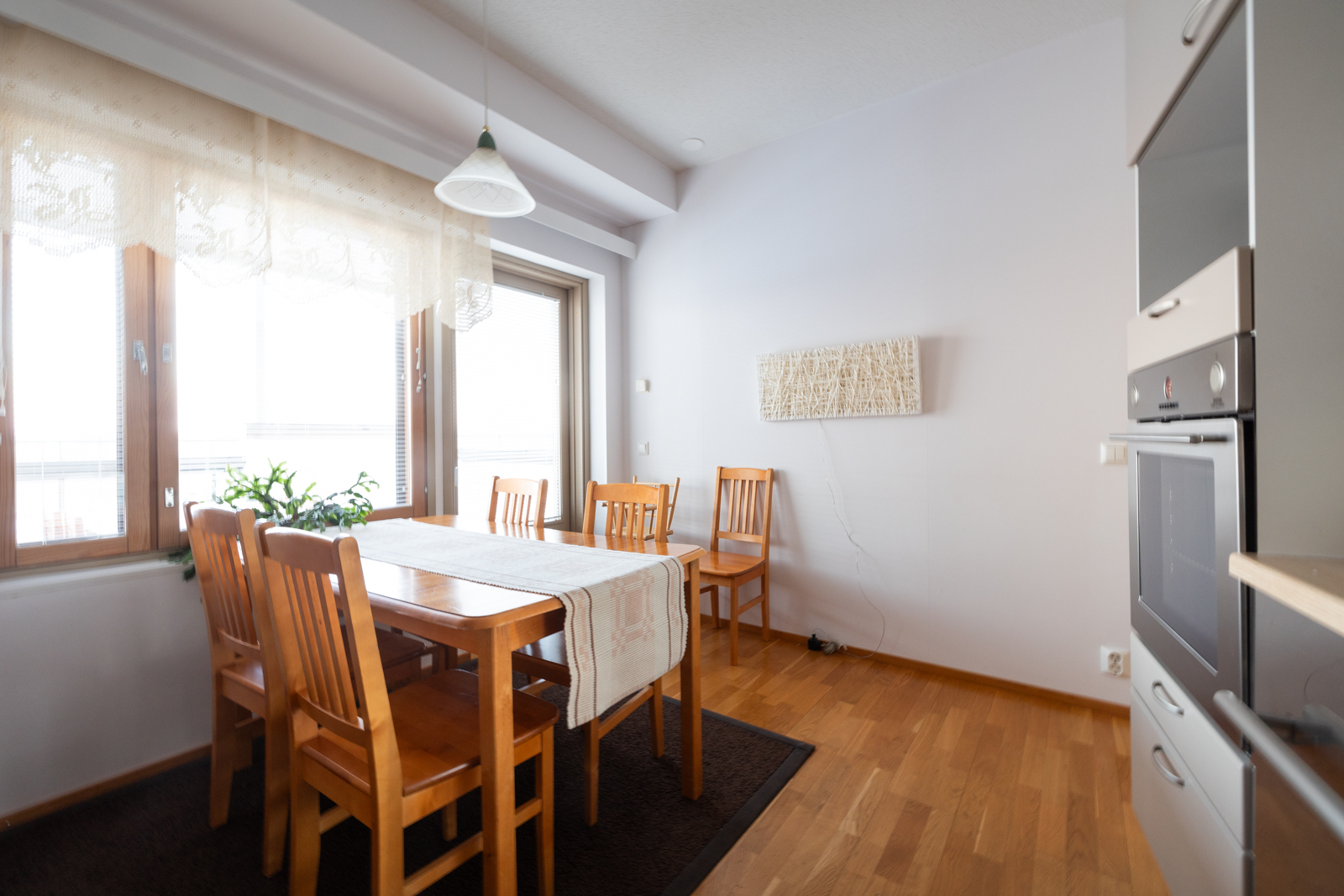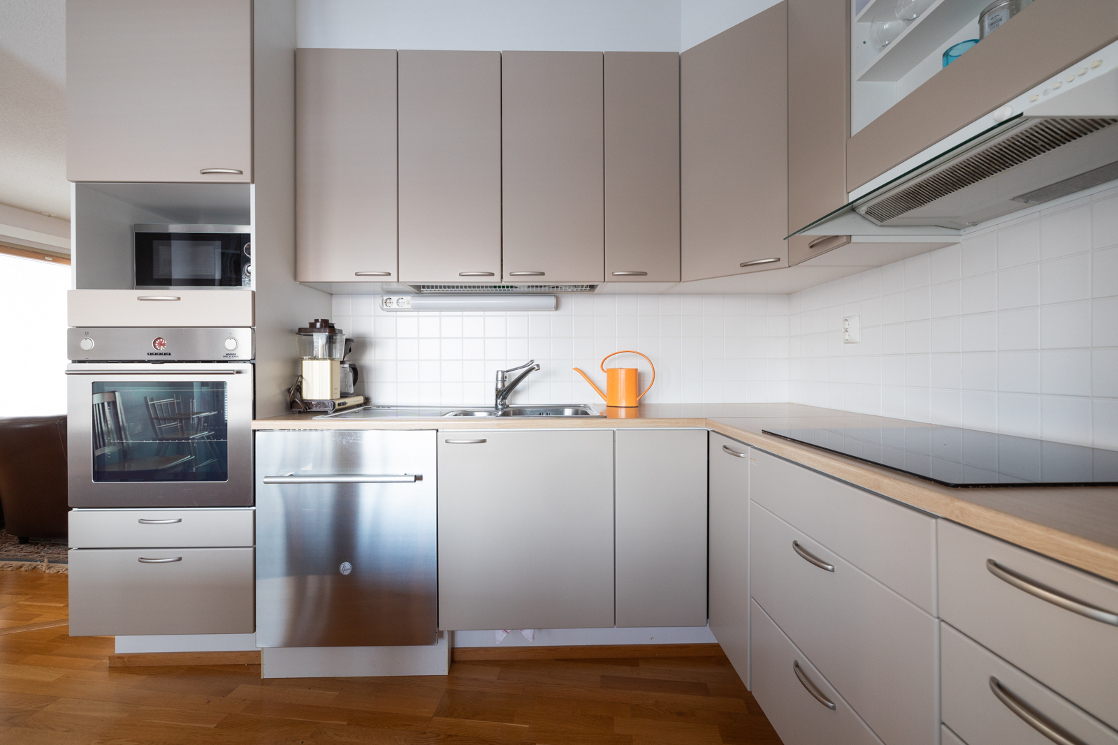 | Keittiön kuvaus | Liesi (erillisuuni, liesitaso), seinät (maali), lattiat (parketti), erillisuuni, jää-viileäkaappi, erillinen pakastin, liesituuletin, astianpesukone ja liesitaso |