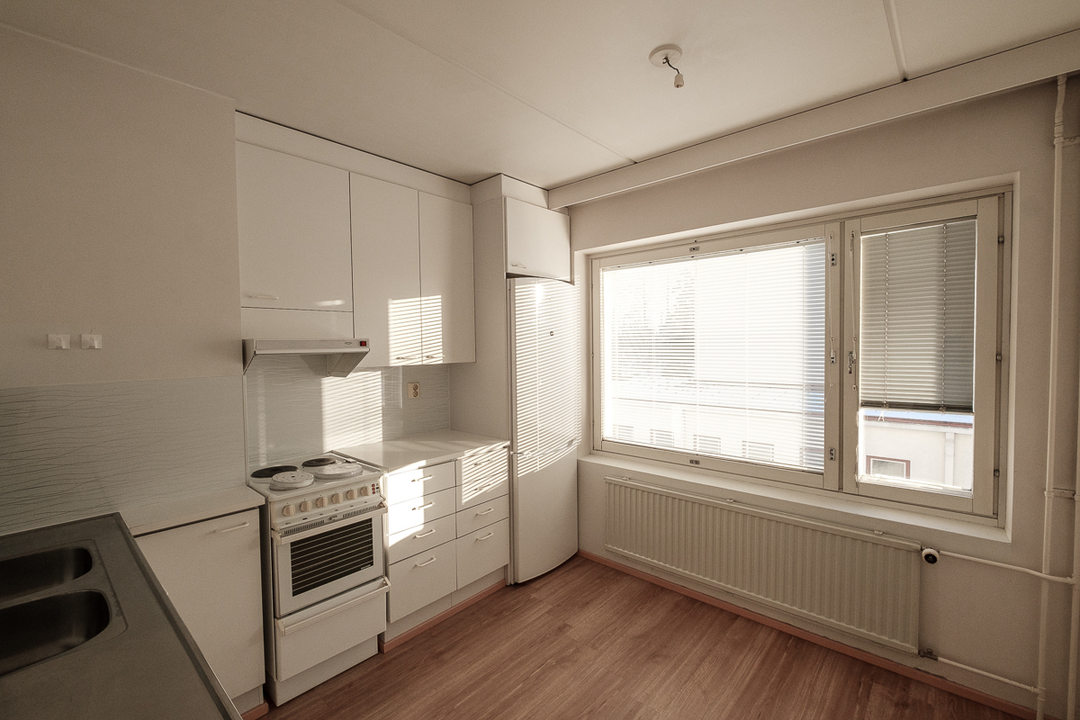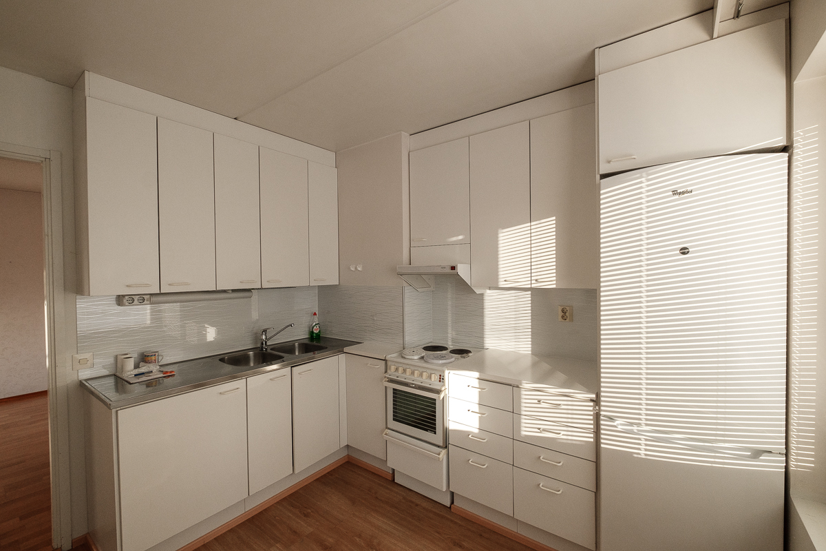 Liesi (sähköliesi), työtasot (laminaatti), seinät (maali), lattiat (vinyyli), jääkaappipakastin, liesi ja liesituuletin / hormi |