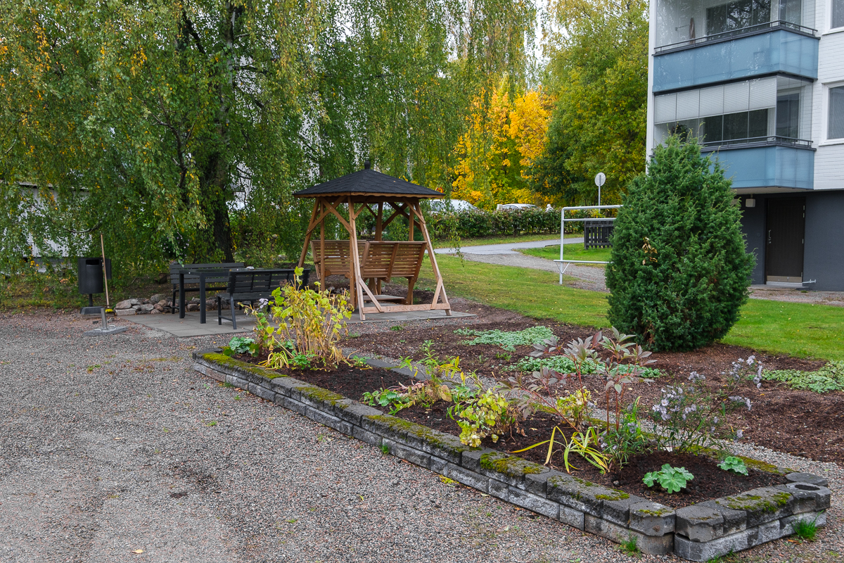 päälle asennettiin hatut, sisäpihan muurit pellitettiin ja parkkipaikalle levitettiin mursketta