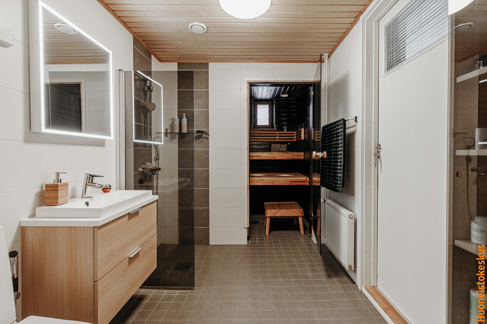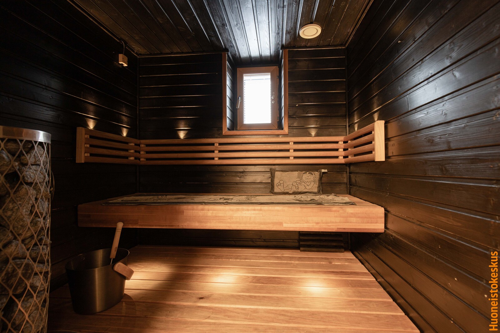 | Saunan kuvaus | Seinät (puu), lattiat (laatta), Sähkökiuas |