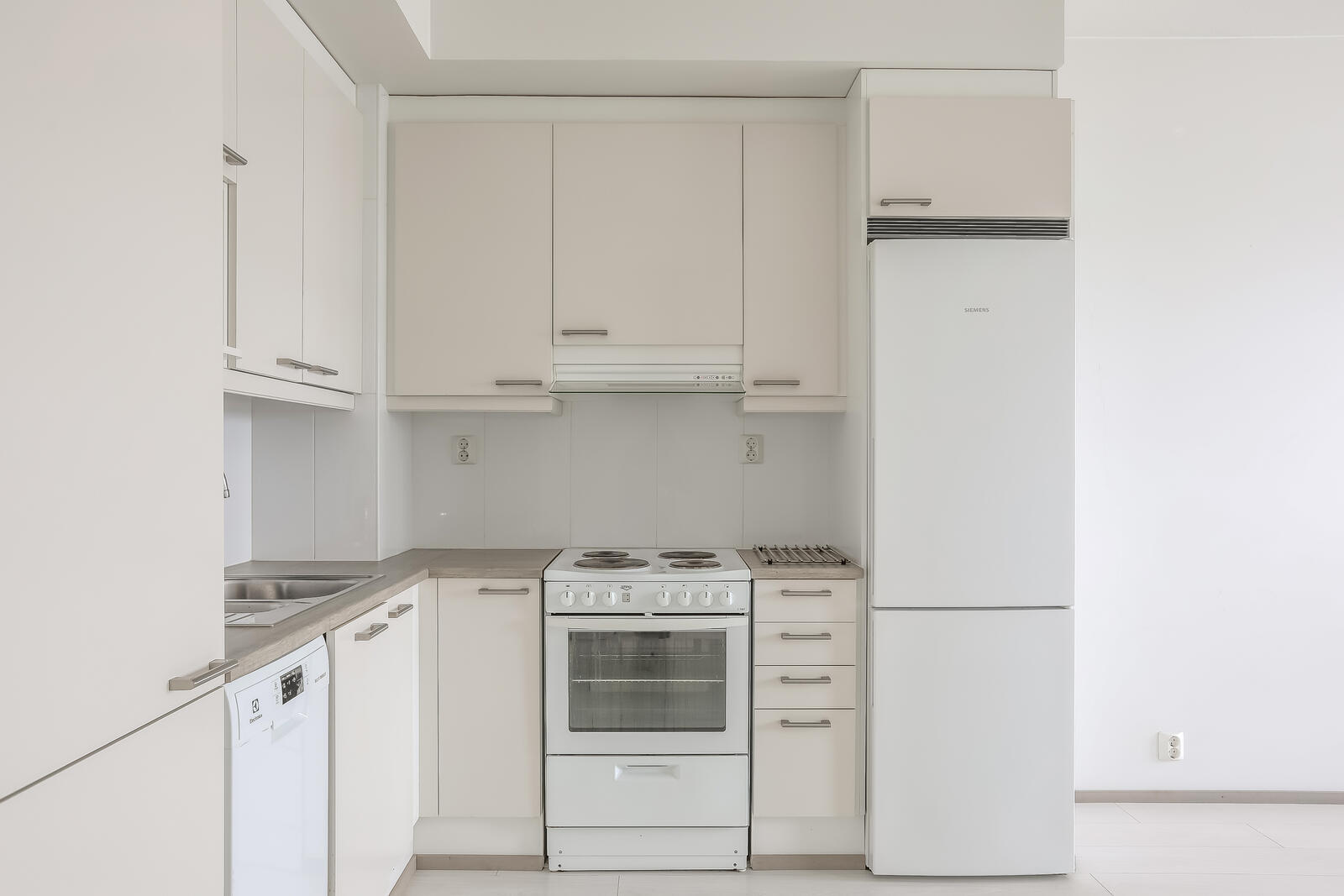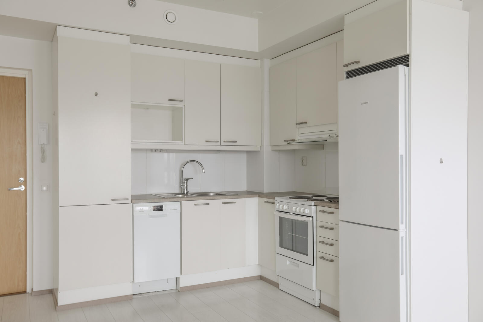 Liesi (sähköliesi), seinät (maali), lattiat (laminaatti), liesi, astianpesukone, jääkaappipakastin, liesituuletin ja kiinteät valaisimet |