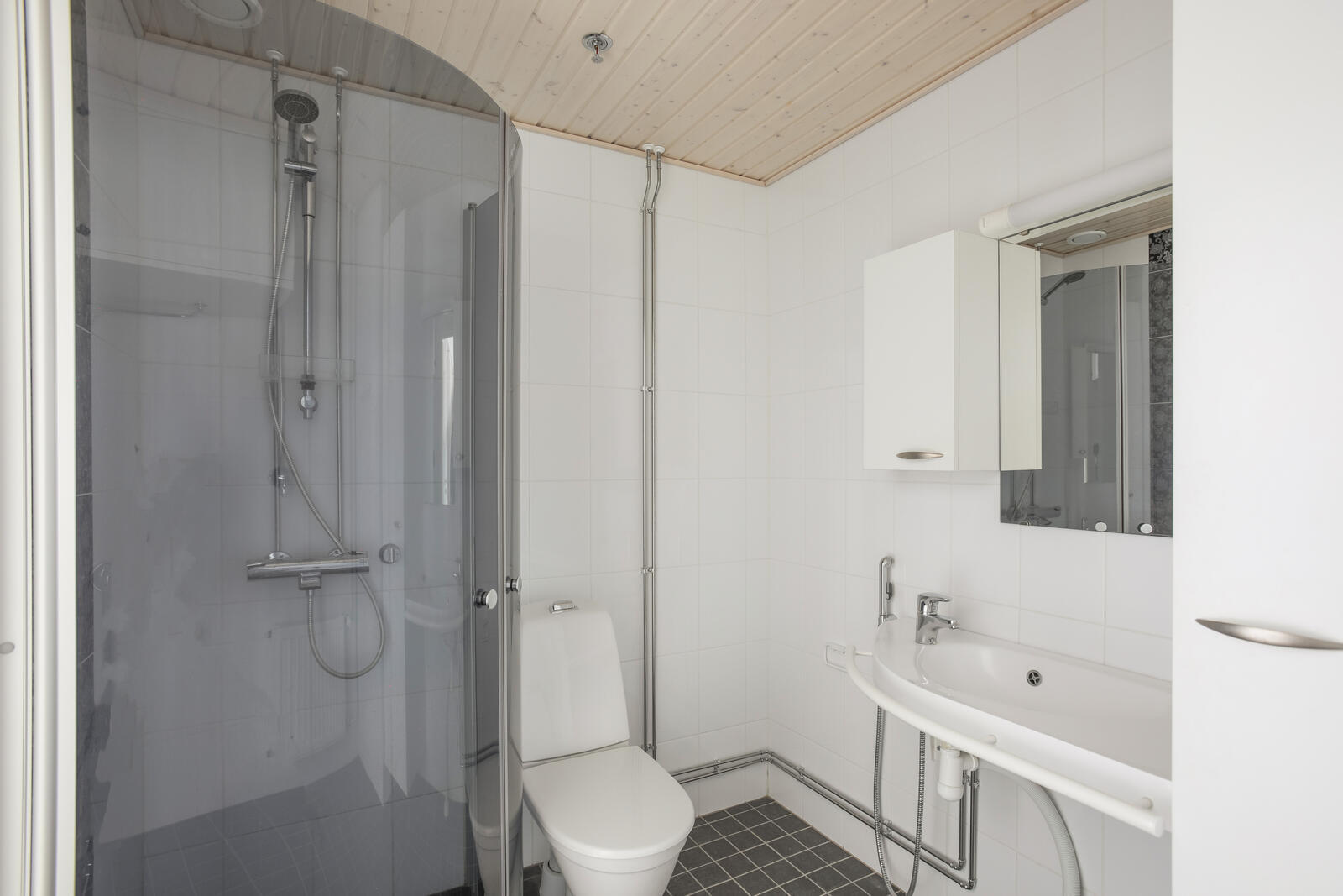 Peili, pesukoneliitäntä, suihkuseinä, allaskaappi, suihku, wc-istuin ja kiinteät valaisimet, seinät (kaakeli), lattiat (laatta) |