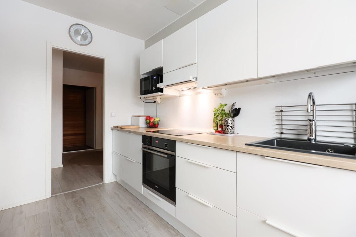 | Keittiön kuvaus | Työtasot (laminaatti), seinät (maali), lattiat (vinyyli), erillisuuni (Kiertoilma), liesituuletin (Aktiivihiili), jääkaappipakastin (Side by side (jääpalakone)), liesi (Induktio) ja astianpesukone, Vinyylilattia, maalatut seinät, maalattu betonikatto. |