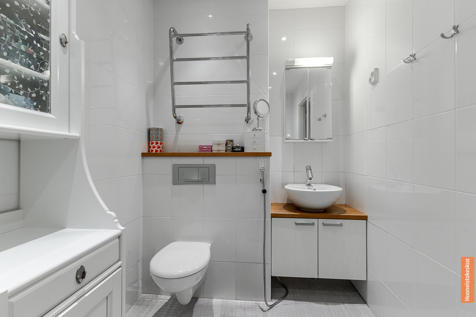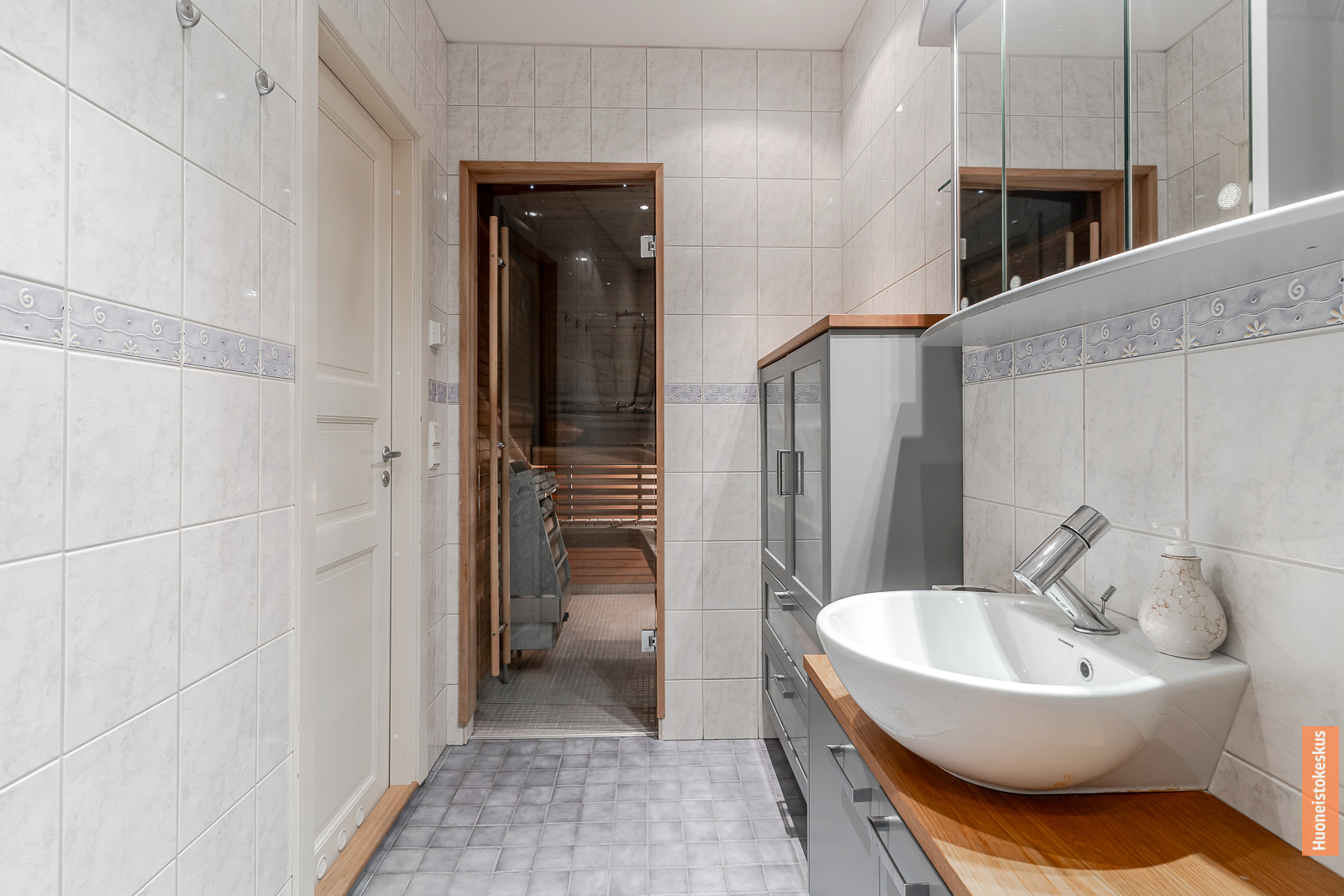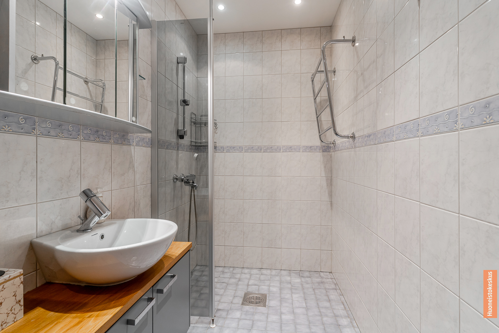 | Kylpyhuoneen kuvaus | Suihku, suihkuseinä, peilikaappi, pesuallas ja lattialämmitys, seinät (kaakeli), lattiat (laatta) |