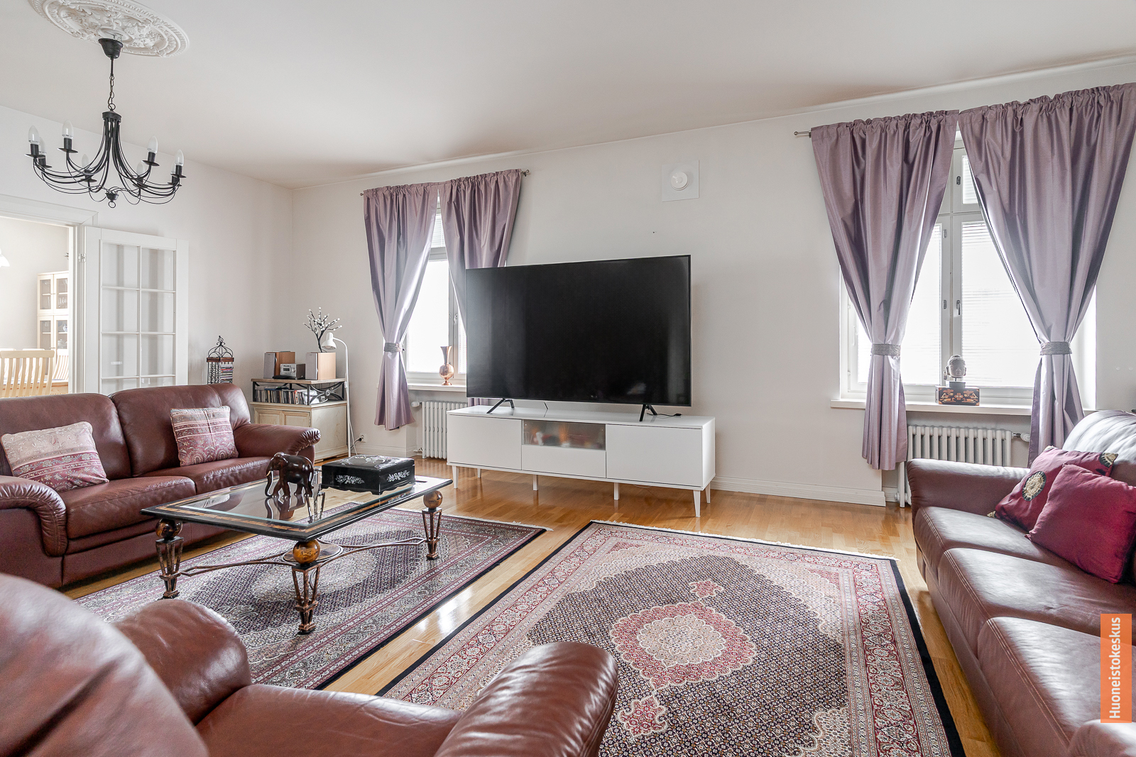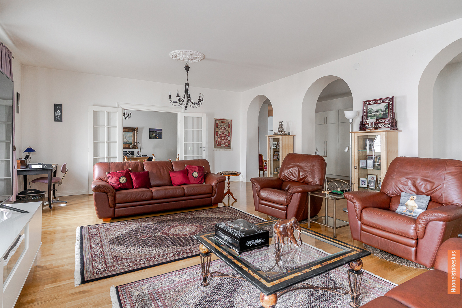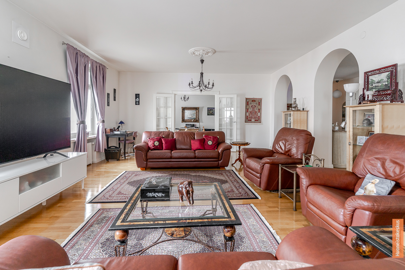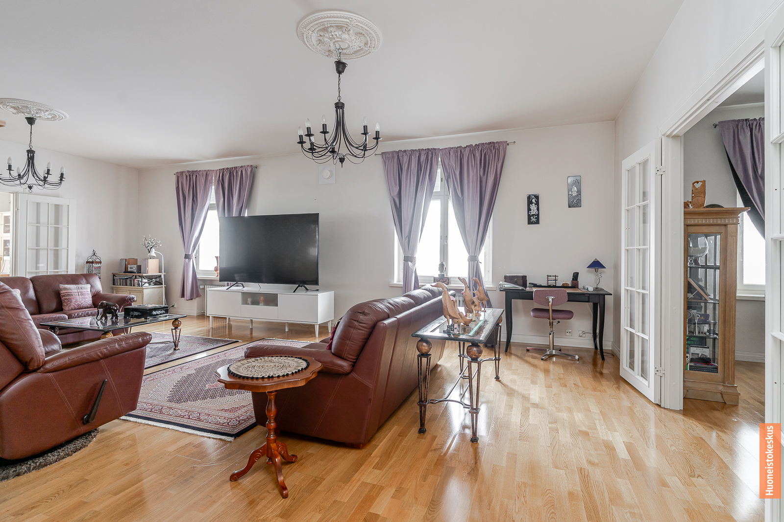 Tämä poikkeuksellinen, Jugend-talon kolmannessa kerroksessa sijaitseva 162 m² edustusasunto yhdistää upealla tavalla 1920-luvun arvokkuuden, suurten huoneiden tunnelman ja modernit asumismukavuudet. Koti avautuu poikkeuksellisen suureen olohuoneeseen, joka tarjoaa juhlavat puitteet vieraille tai vaan nauttimaan arjesta ylellisissä puitteissa. Korkeat huoneet, kauniit yksityiskohdat ja runsas luonnonvalo luovat ylellisen sekä kutsuvan ilmapiirin.