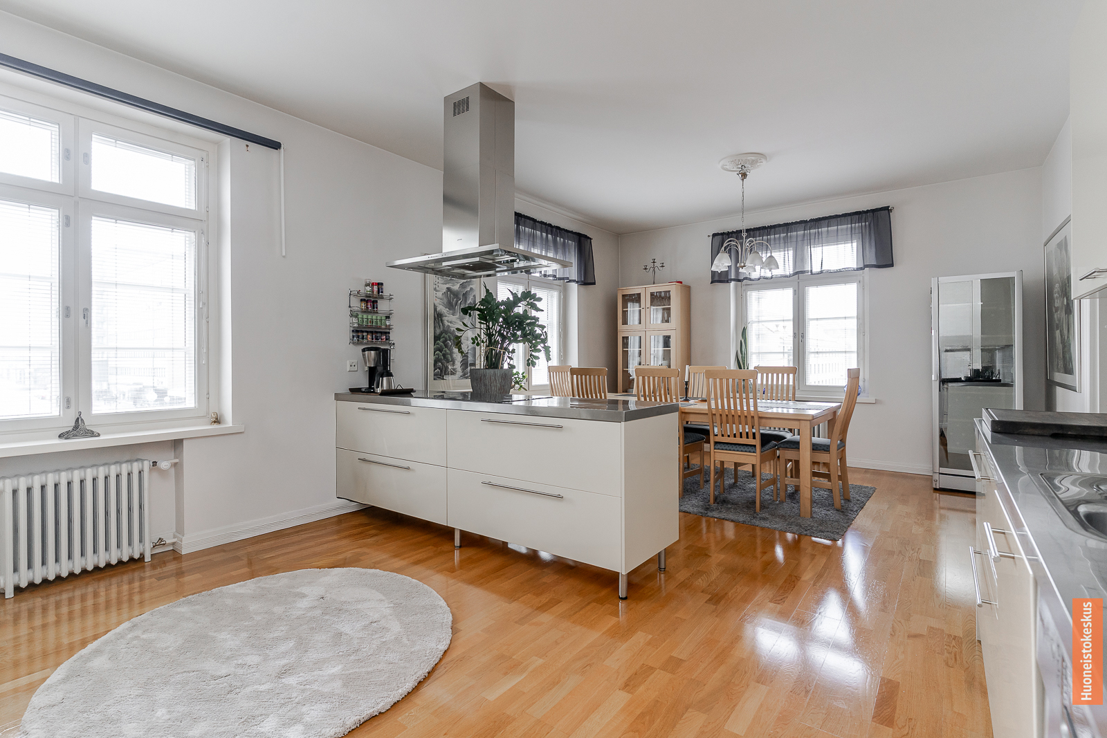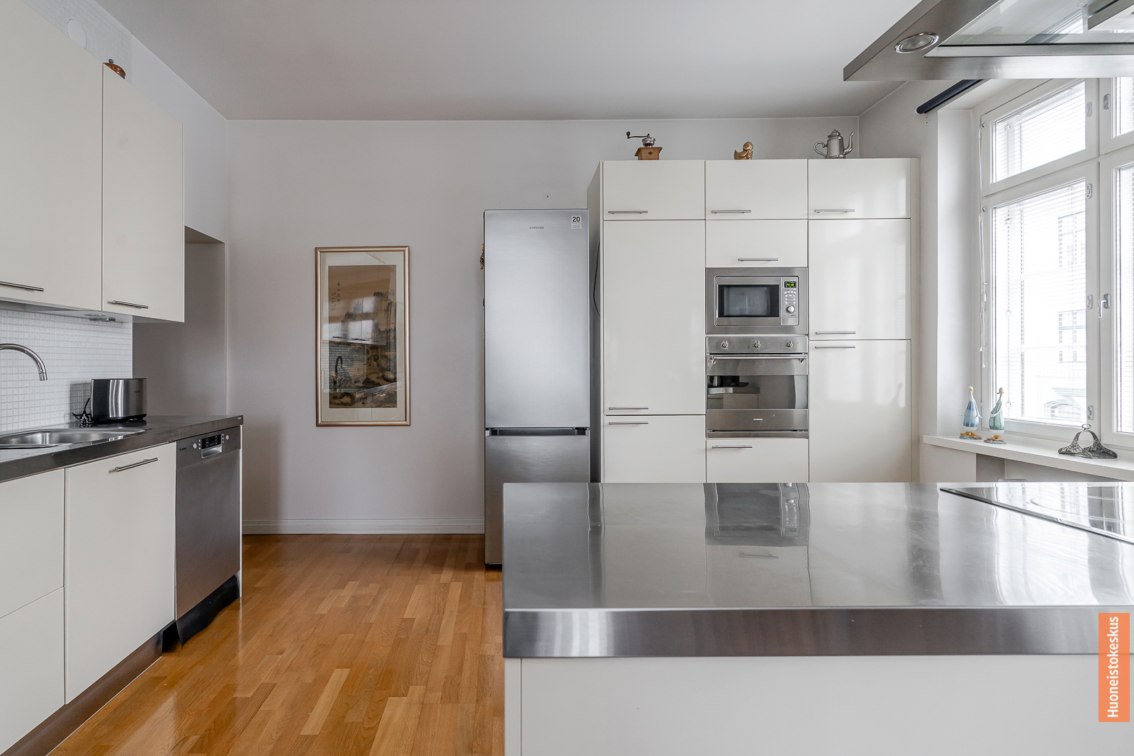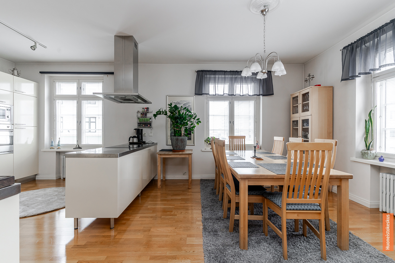 Kodikas ja avara keittiö on arjen unelma ja täällä on tilaa kokkailla. Ison ruokailutilan ikkunat kehystävät upeat näkymät aina Kauppatorille saakka. Tila kutsuu kokkaamaan, kokoontumaan isollakin porukalla ja nauttimaan kaupungin tunnelmasta omassa rauhassa.