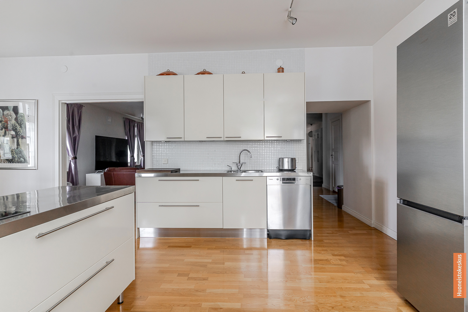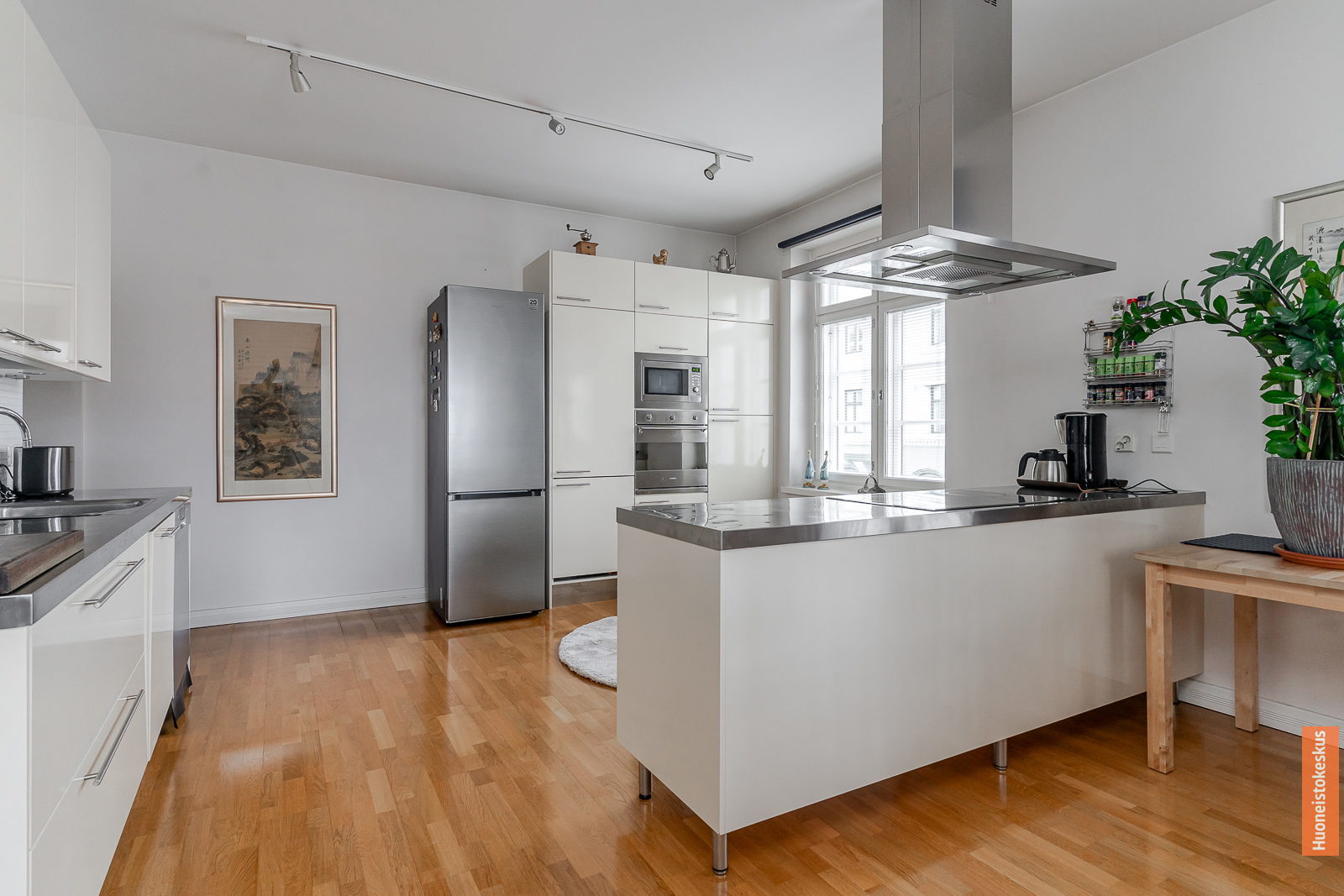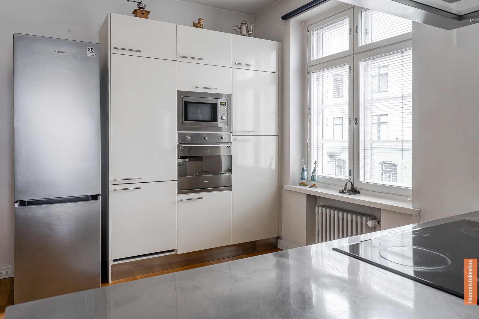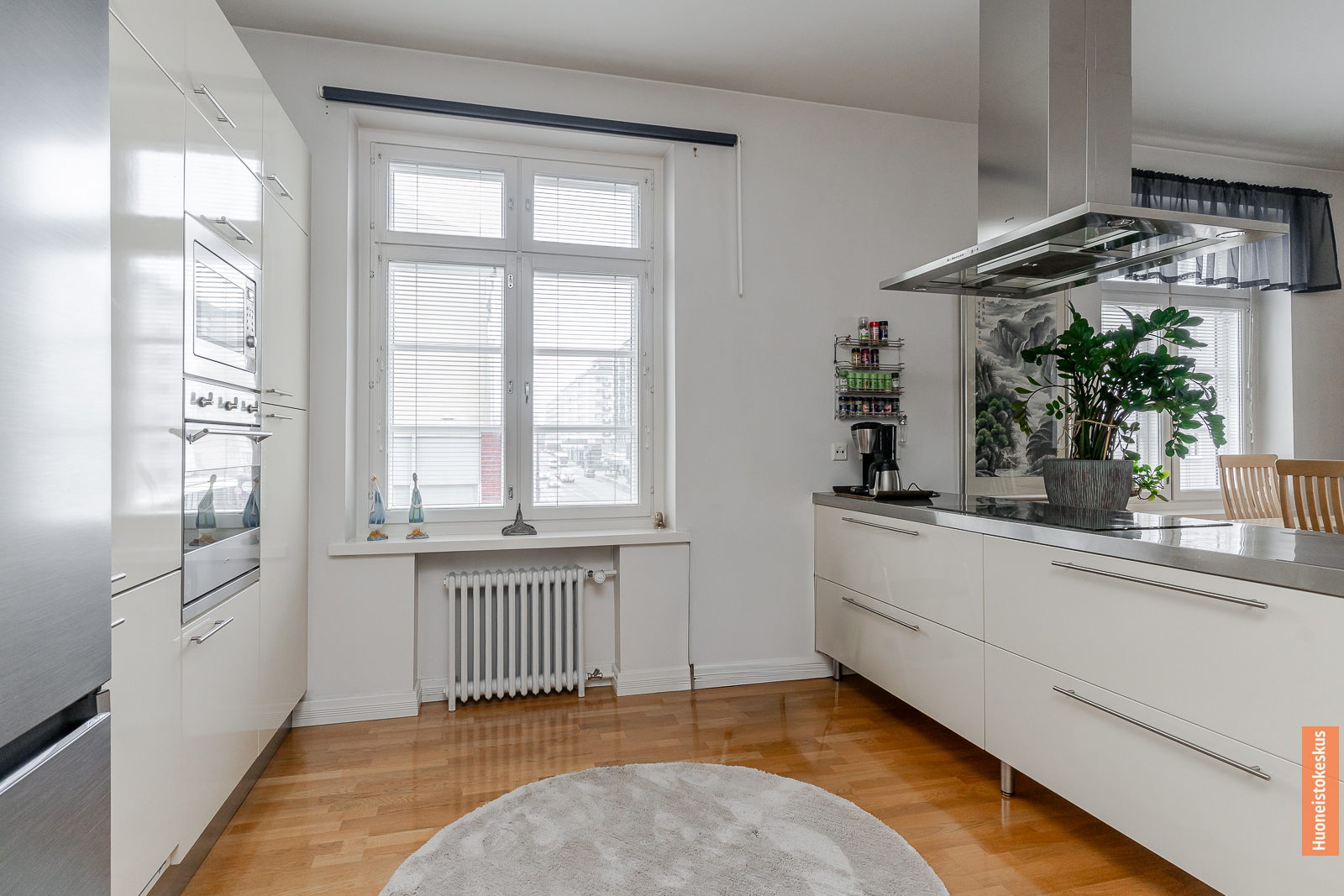 Kodikas ja avara keittiö on arjen unelma ja täällä on tilaa kokkailla. Ison ruokailutilan ikkunat kehystävät upeat näkymät aina Kauppatorille saakka. Tila kutsuu kokkaamaan, kokoontumaan isollakin porukalla ja nauttimaan kaupungin tunnelmasta omassa rauhassa.