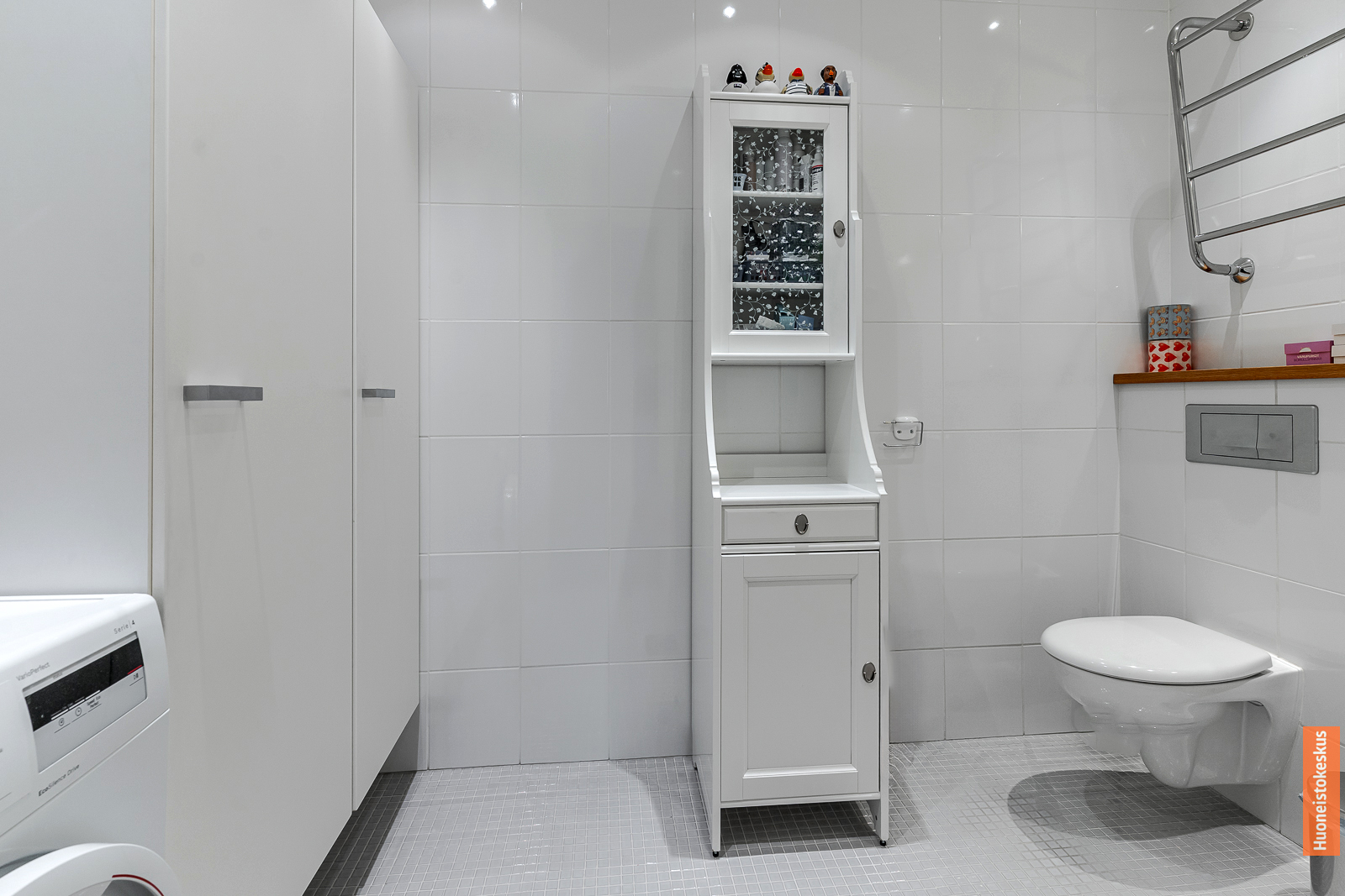 | WC-tilojen kuvaus | Lukumäärä: 1, Peilikaappi, wc-istuin, allaskaappi, pesukoneliitäntä, bidee-suihku, lattialämmitys ja pesukone, seinät (Kaakeli), lattiat (Laatta) |