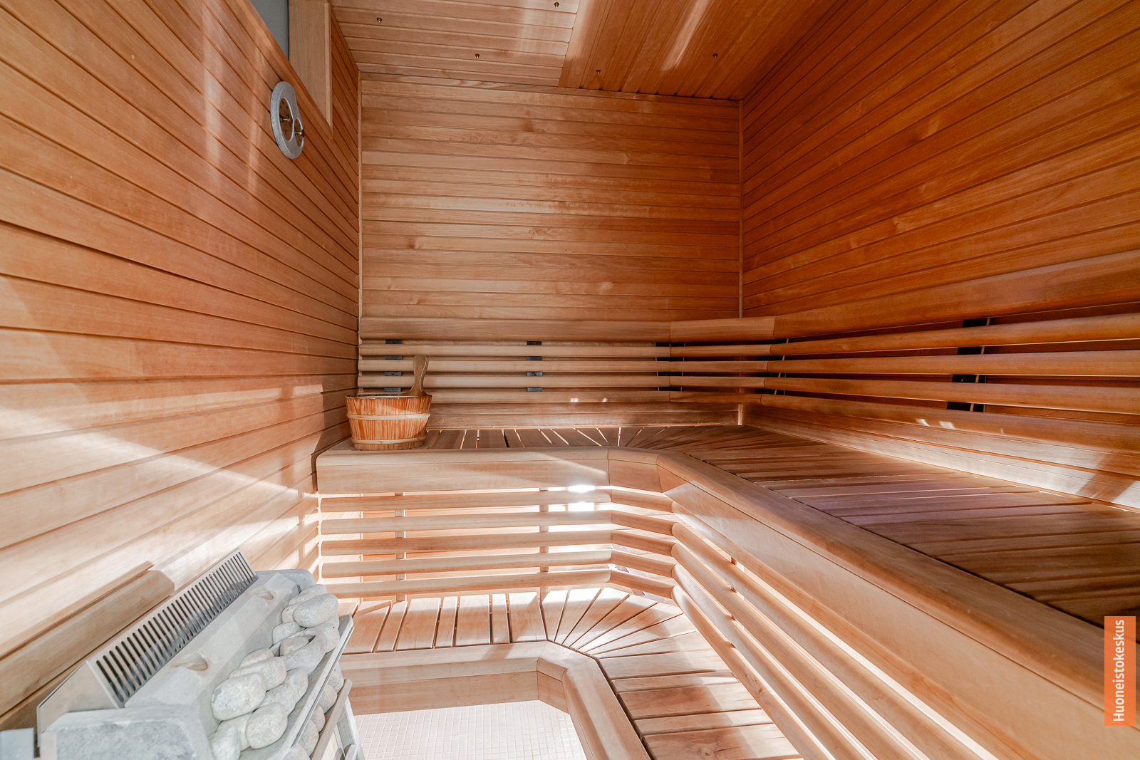 | Saunan kuvaus | Seinät (puolipaneeli), lattiat (laatta), Sähkökiuas |