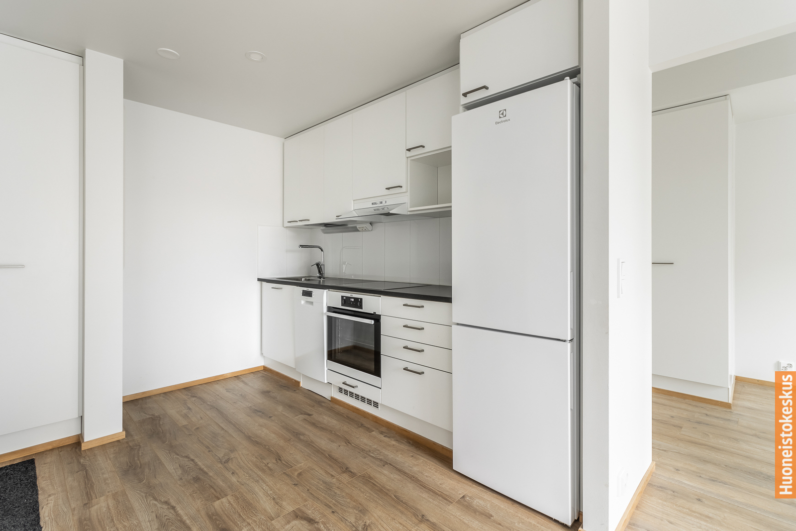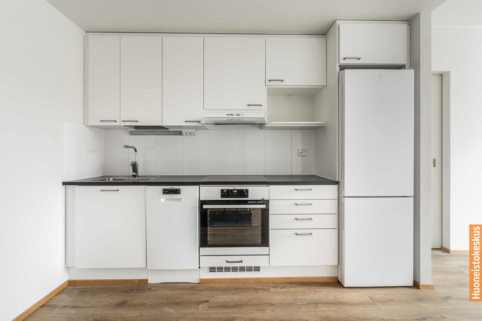 Liesi (erillisuuni, liesitaso), seinät (laatta ja maali), lattiat (laminaatti), astianpesukone, erillisuuni, jääkaappipakastin, liesituuletin ja kiinteät valaisimet, liesitaso |