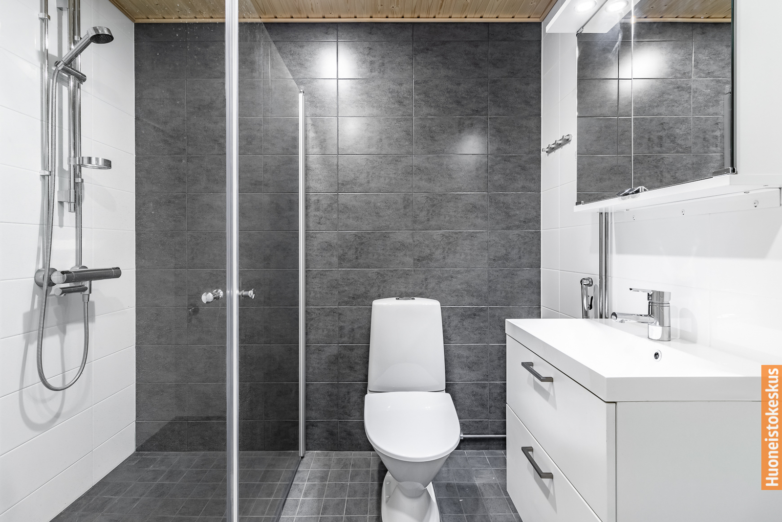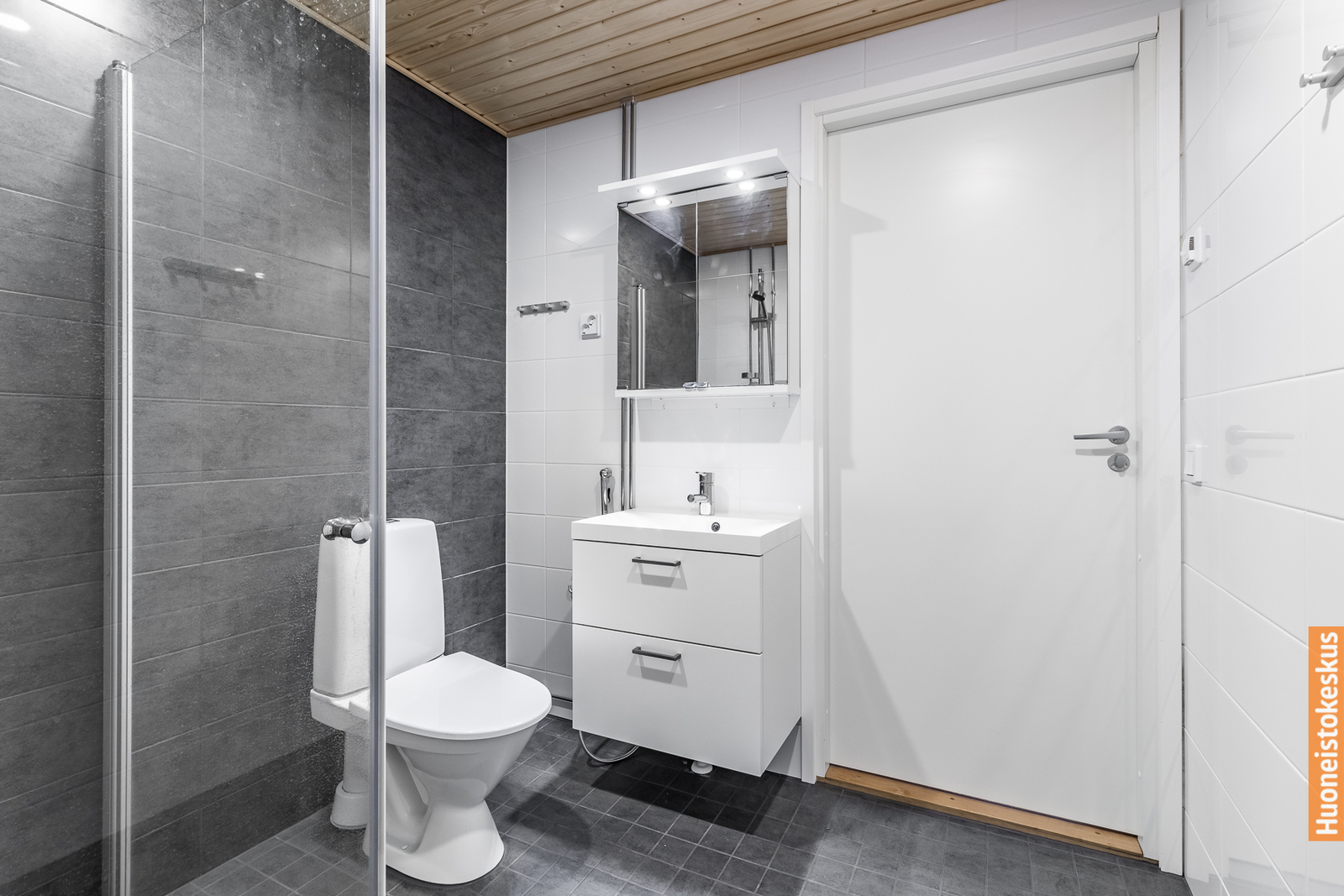 Lattialämmitys, peilikaappi, pesukoneliitäntä, suihku, suihkuseinä, wc-istuin ja kiinteät valaisimet, seinät (kaakeli), lattiat (laatta) |