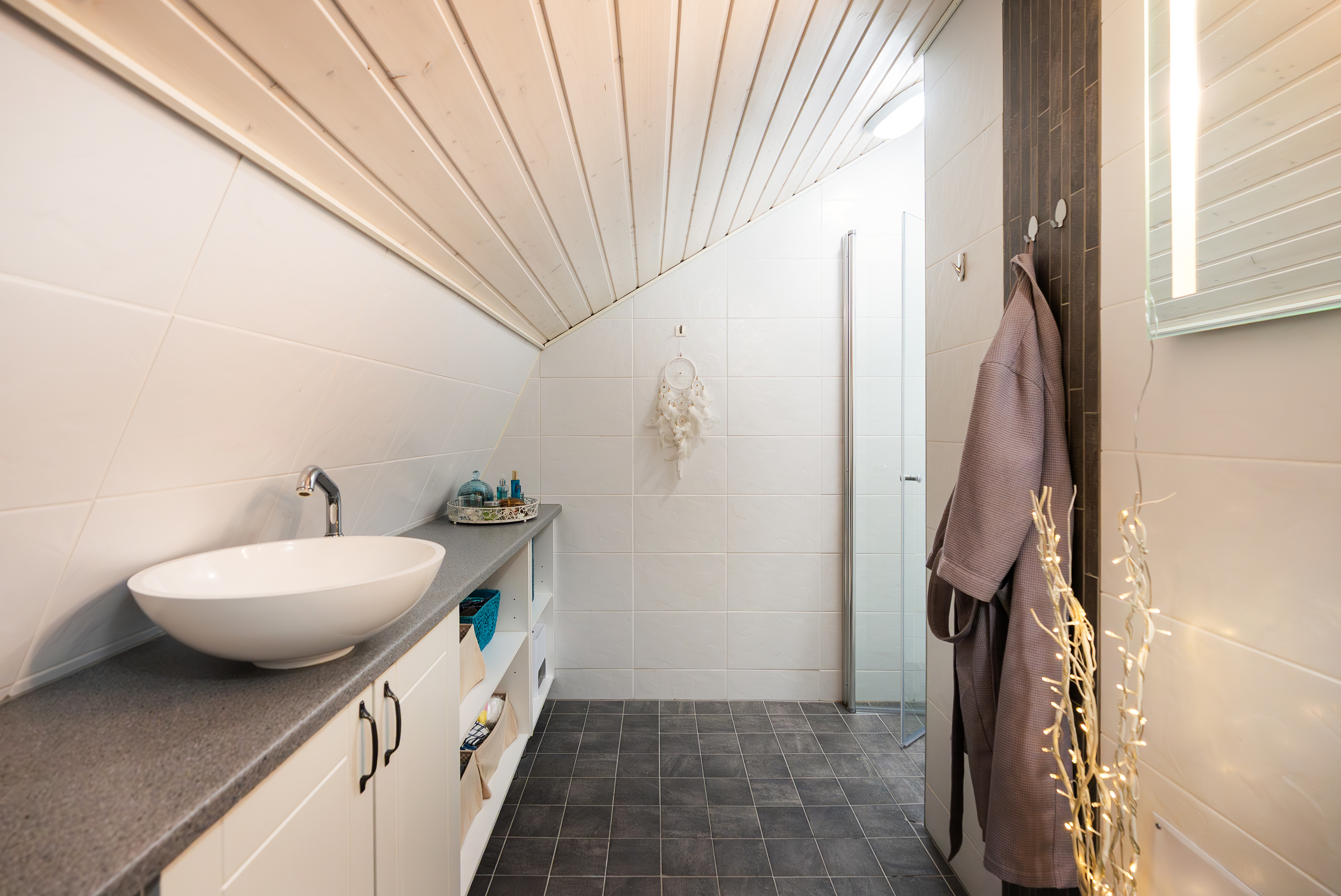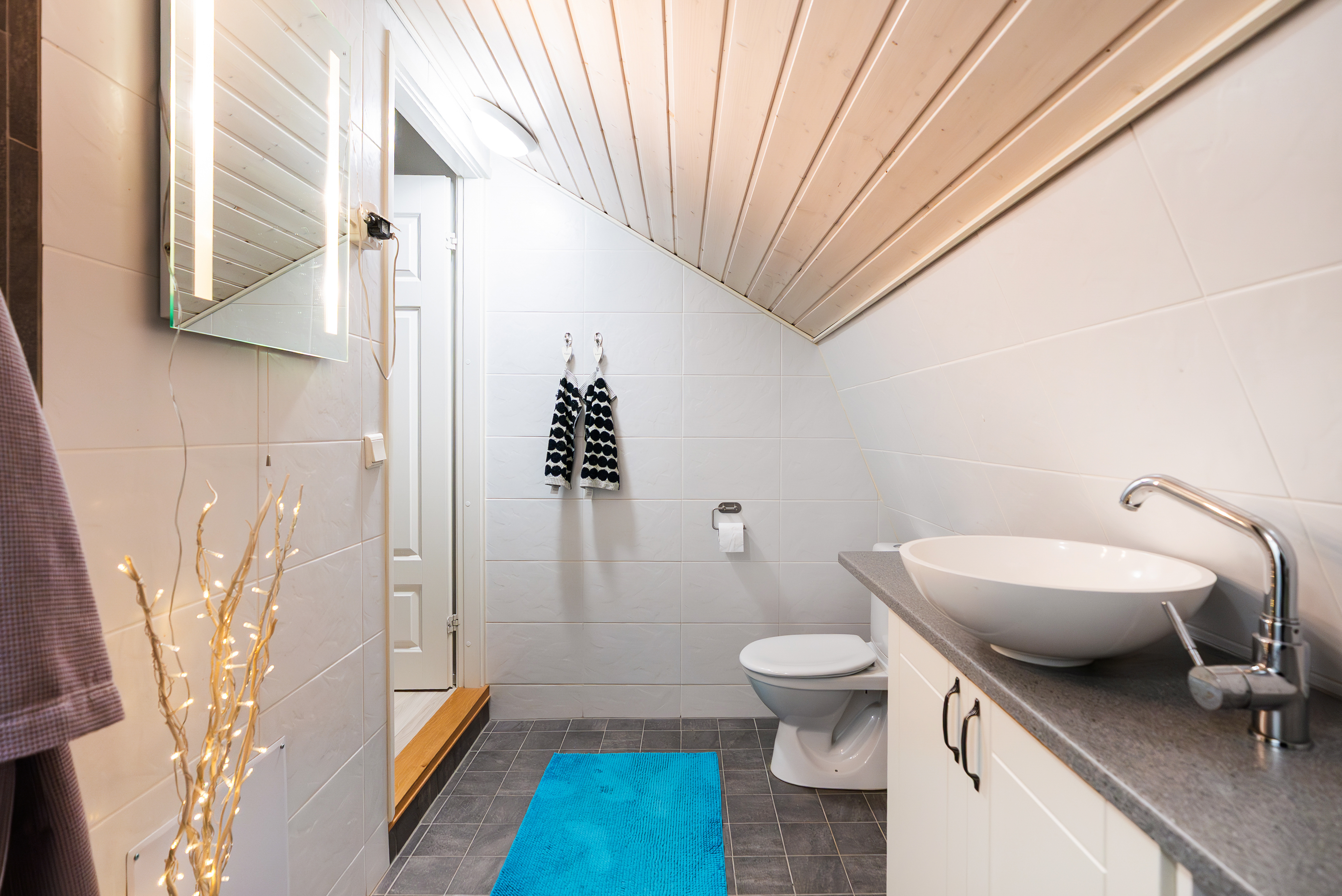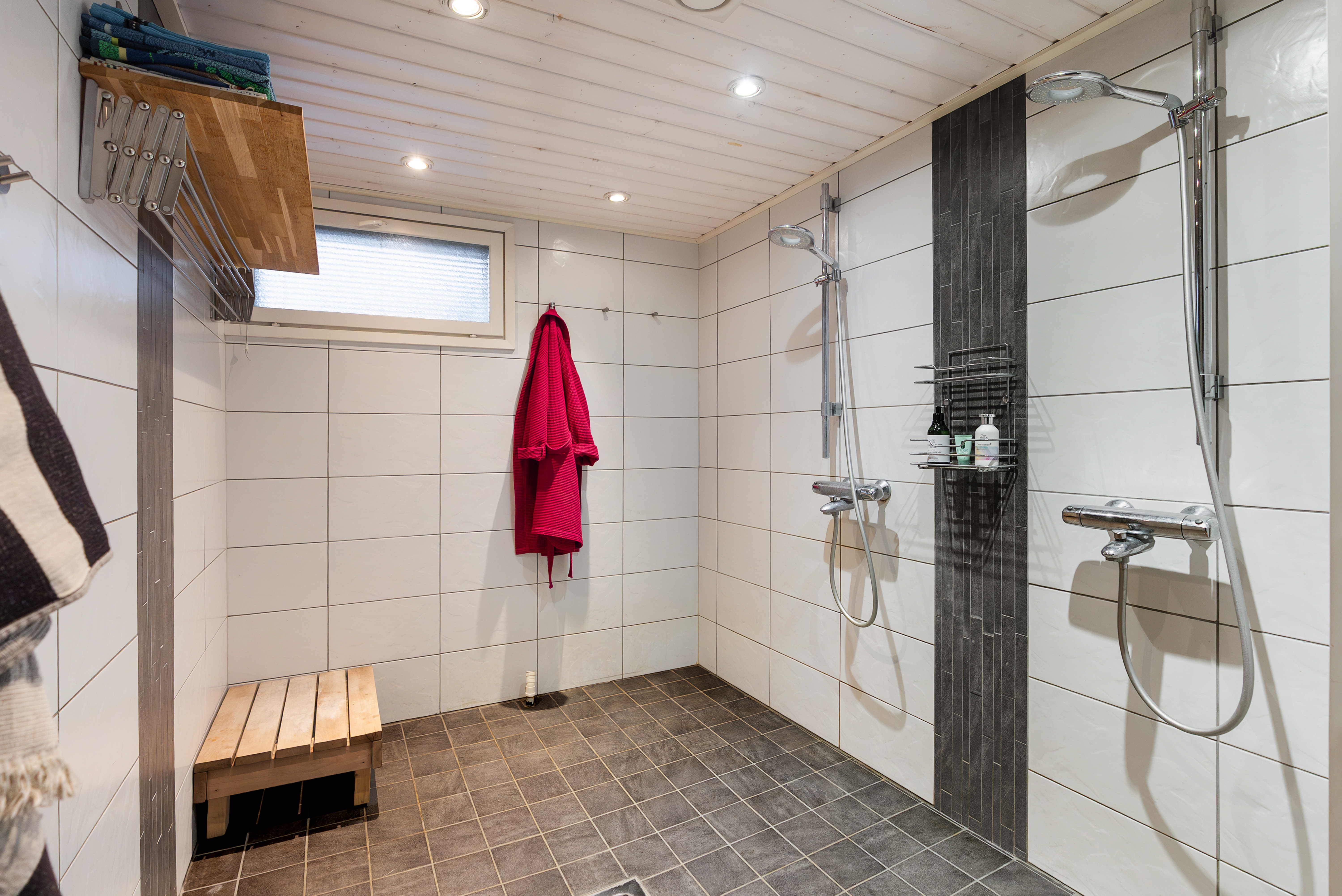 Suihku (yläkerrassa 1, kellarissa 2), peili, allaskaappi ja wc-istuin, seinät (kaakeli), lattiat (laatta) |