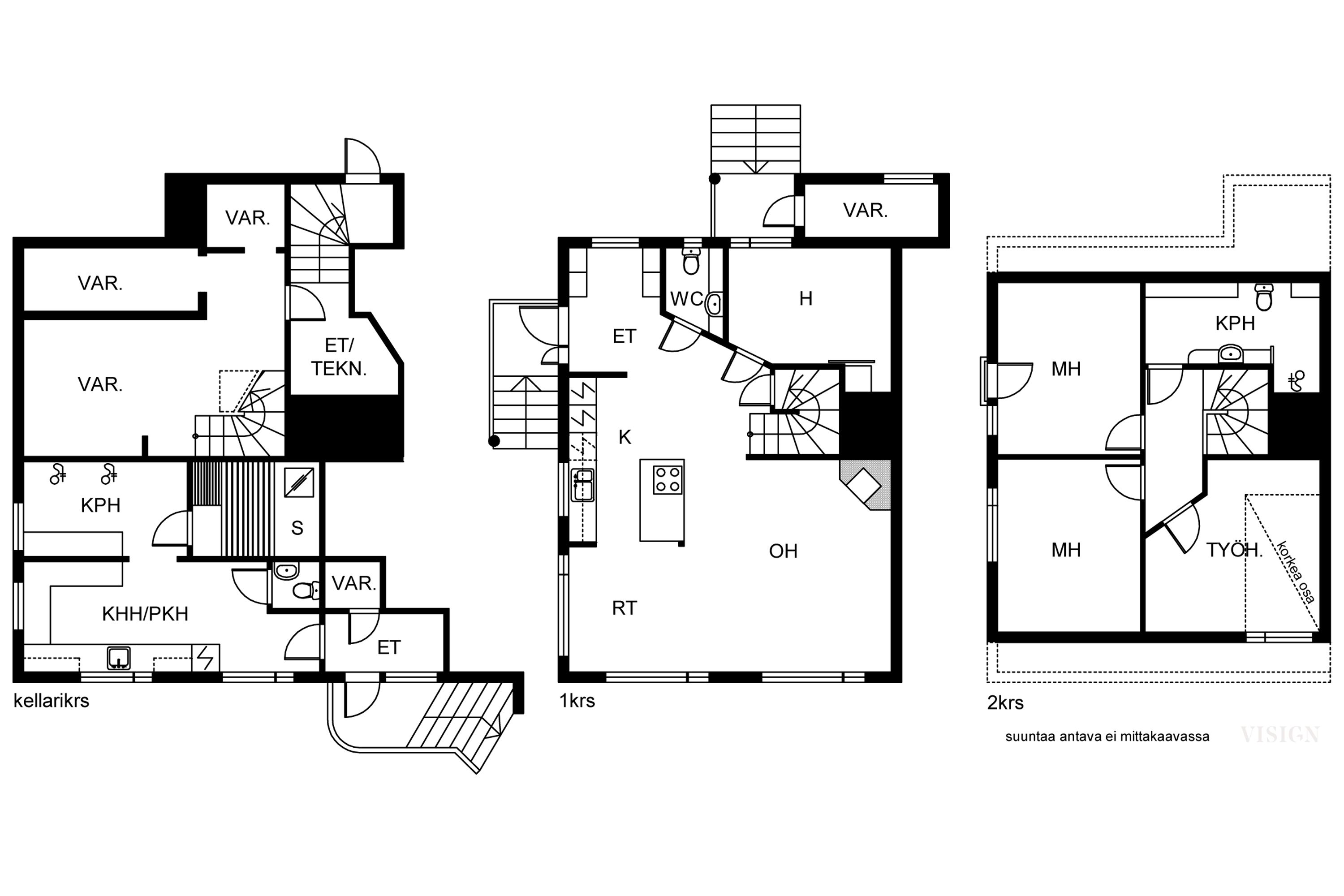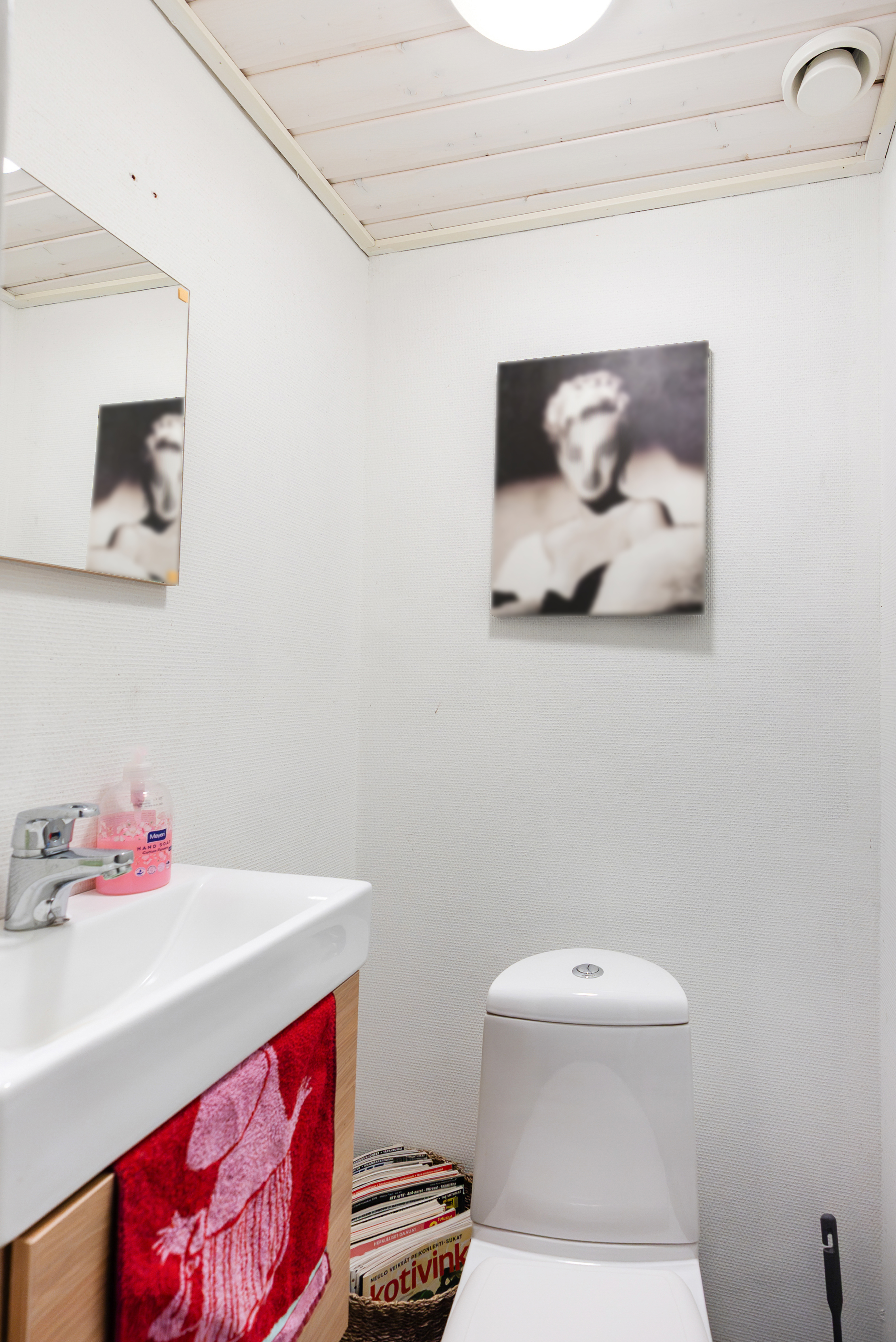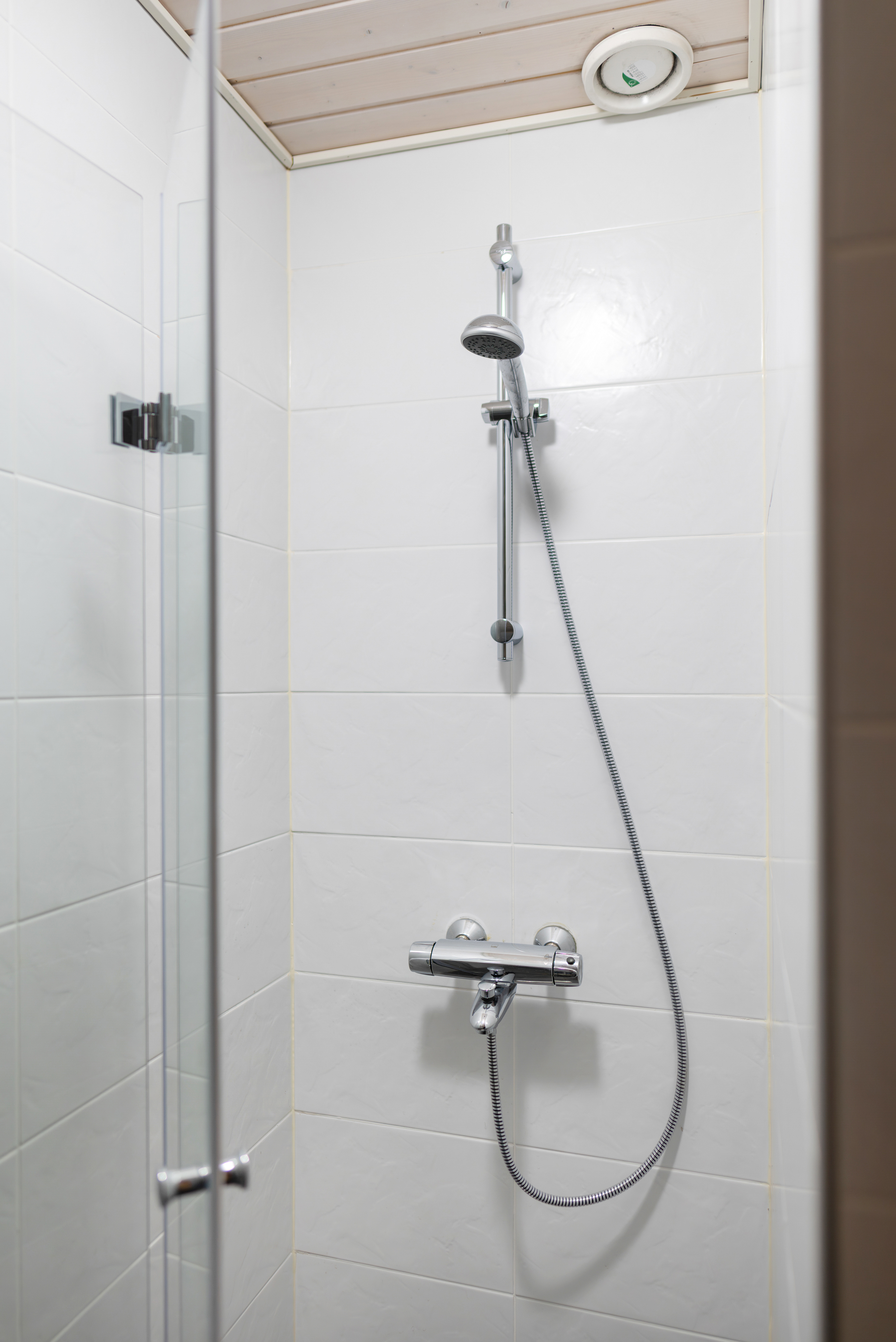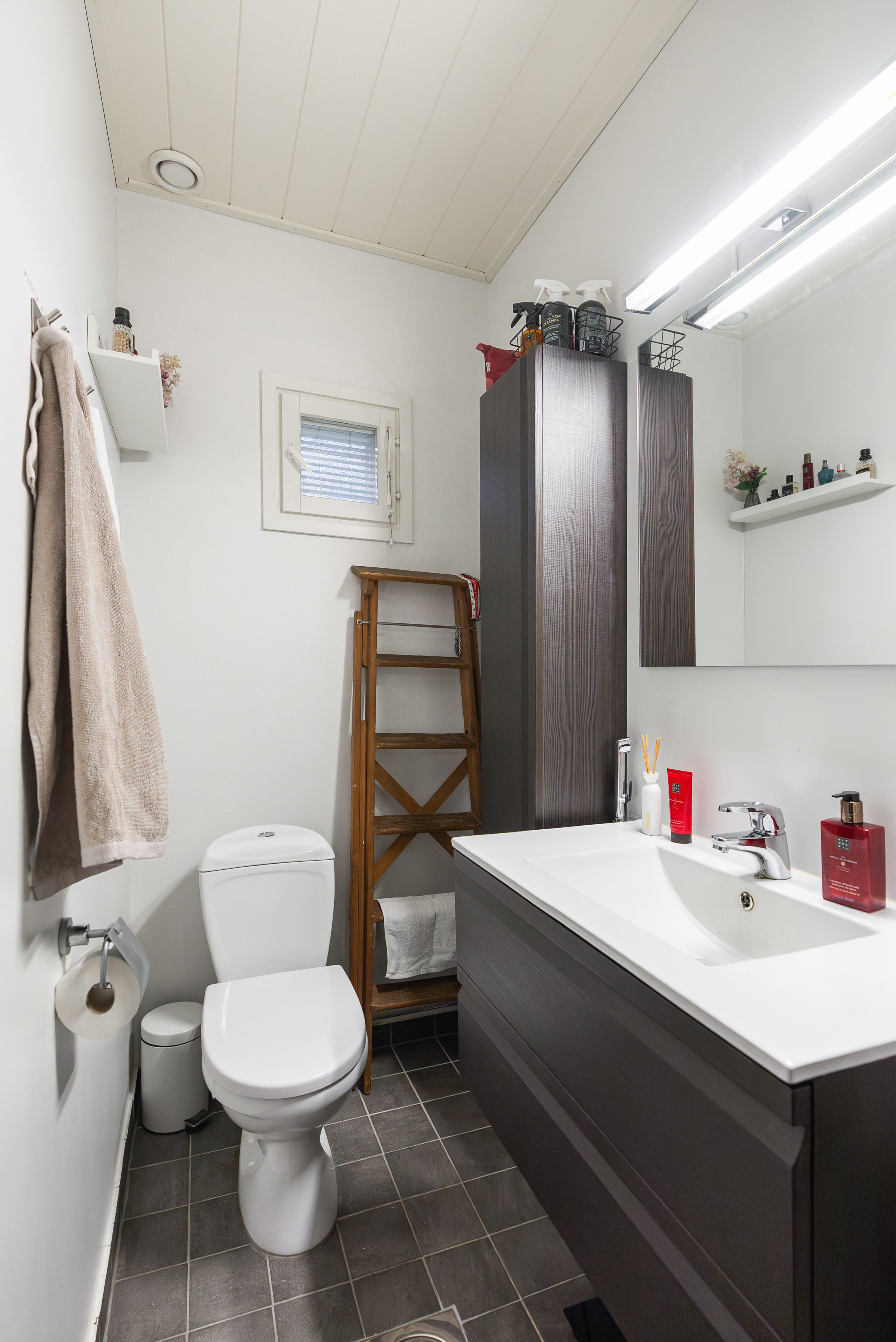 Suihku (yläkerrassa 1, kellarissa 2), peili, allaskaappi ja wc-istuin, seinät (kaakeli), lattiat (laatta) |