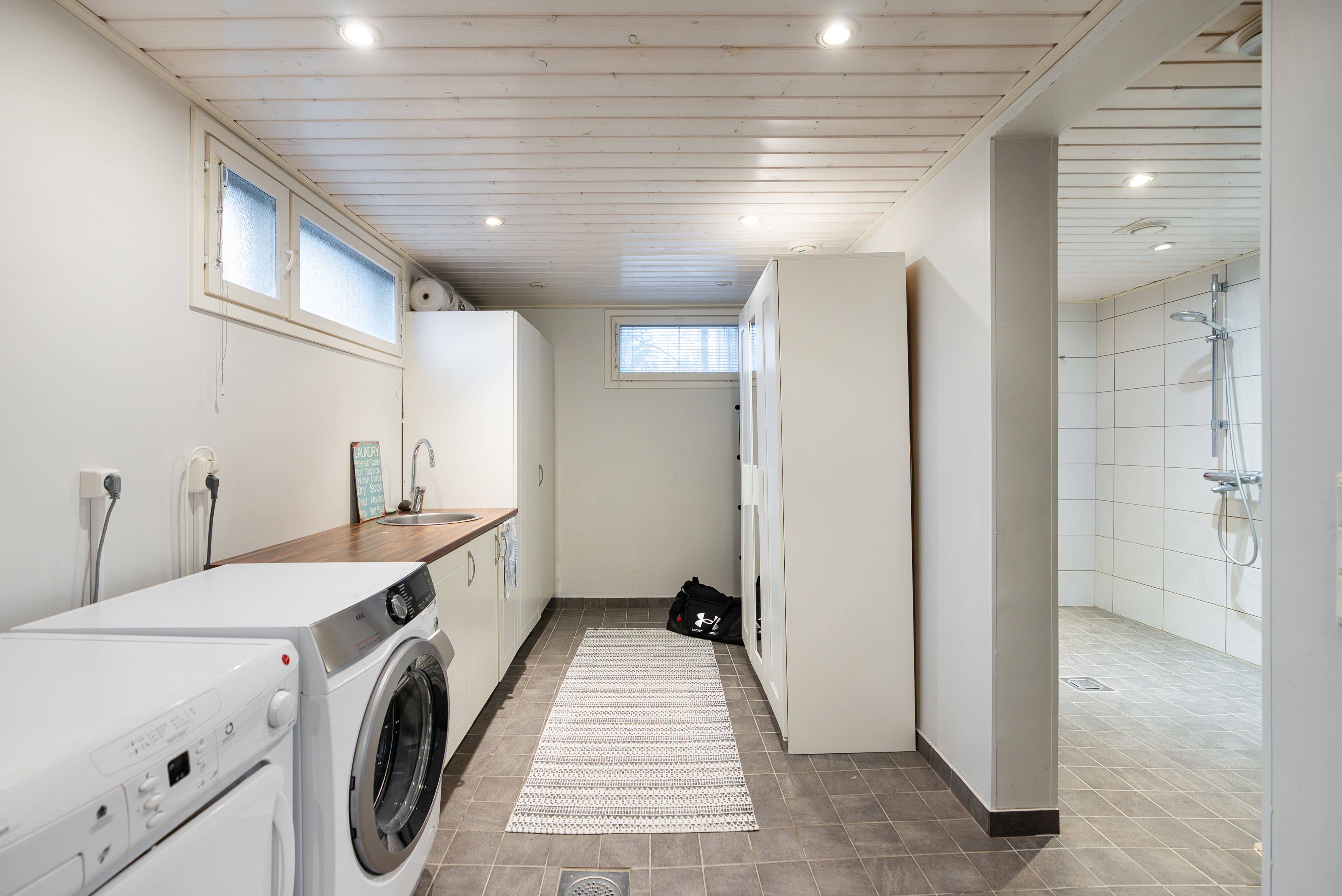 Pesukoneliitäntä, pesuallas, pöytätaso ja pyykkikaapit, lattiat (laatta) |