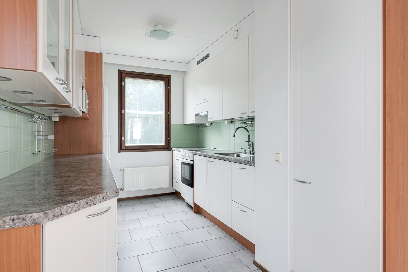 | Keittiön kuvaus | Liesi (Keraaminen liesi), työtasot (laminaatti), seinät (laatta ja maali), lattiat (laatta), liesituuletin, jääkaappipakastin ja astianpesukone, Puustellin keittiö |