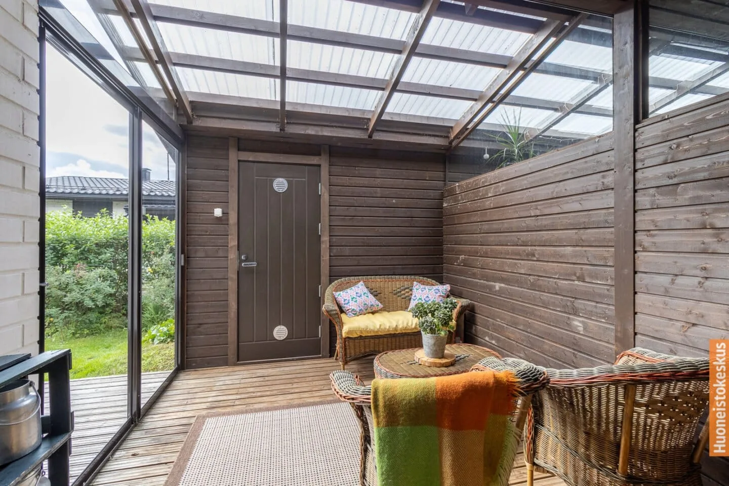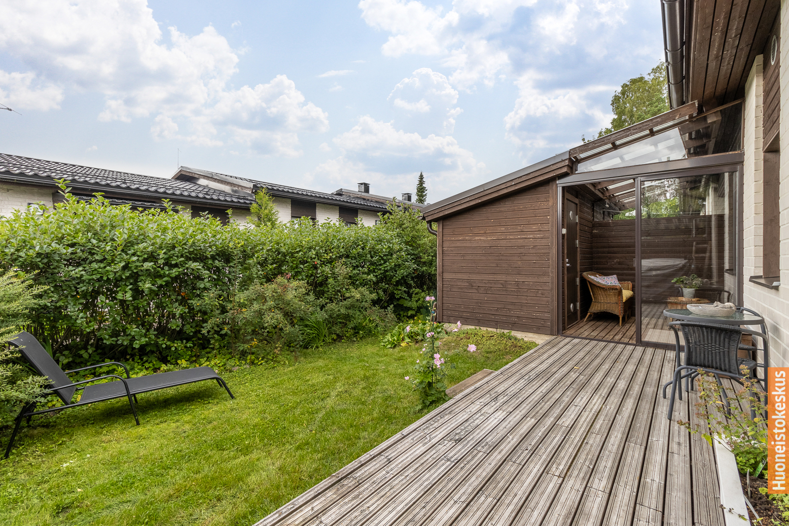 Viihtyisällä saunaosastolla rentoudut päivän päätteeksi, ja sieltä on suora pääsy lasitetulle ja katetulle terassille – täydellinen paikka vilvoitella saunan jälkeen tai viettää aikaa ympäri vuoden.