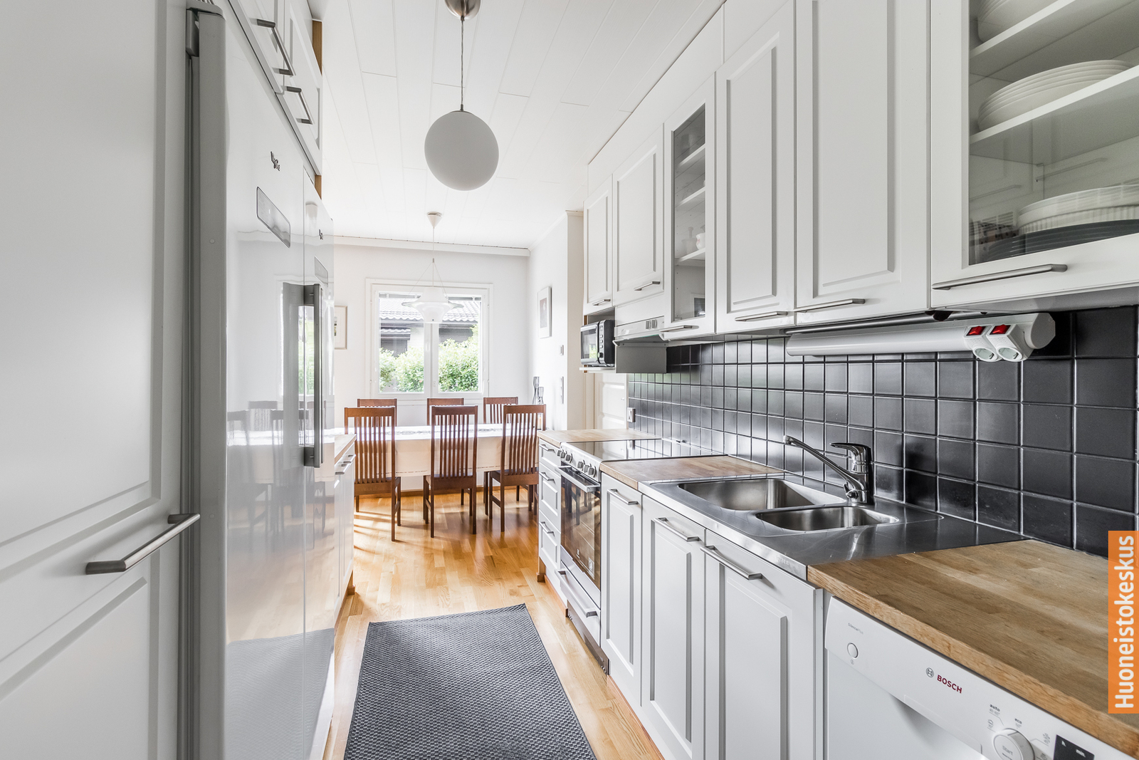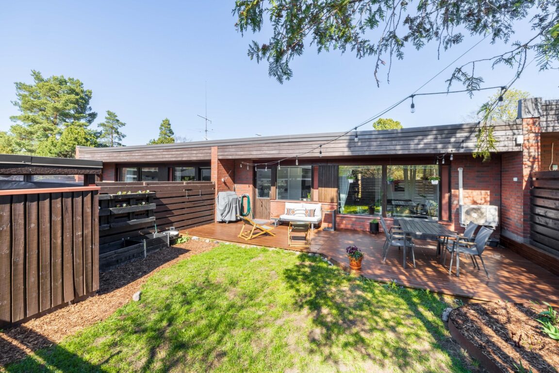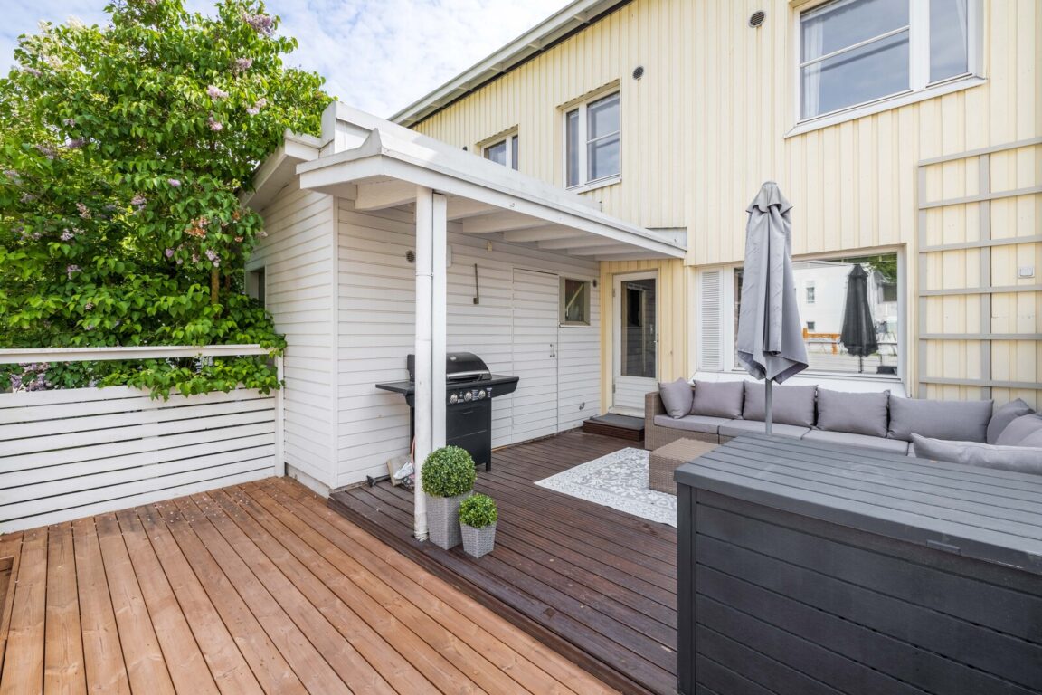 Keittiö hurmaa reilulla kaappi- ja laskutilallaan, ja se yhdistyy sujuvasti ruokailutilaan ja tilavaan olohuoneeseen. Olohuoneesta avautuu käynti suojaisalle takapihalle, jossa voit nauttia auringosta, grillauksesta tai viherpeukalopuuhista.