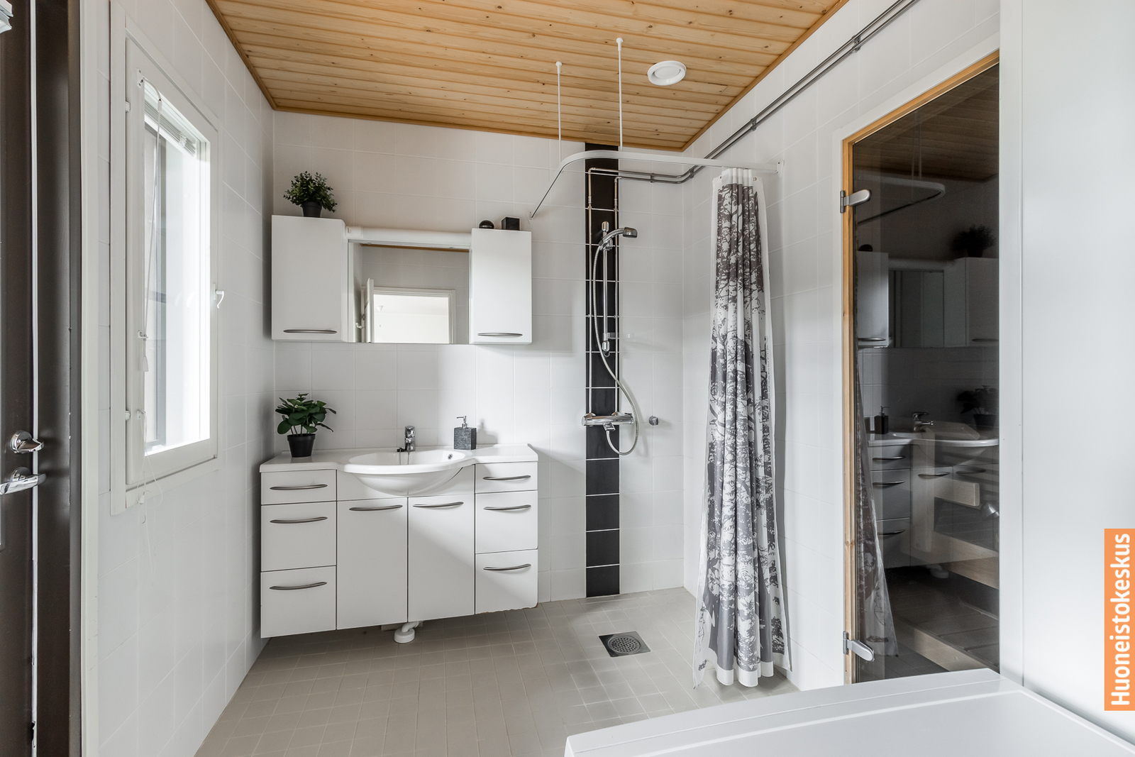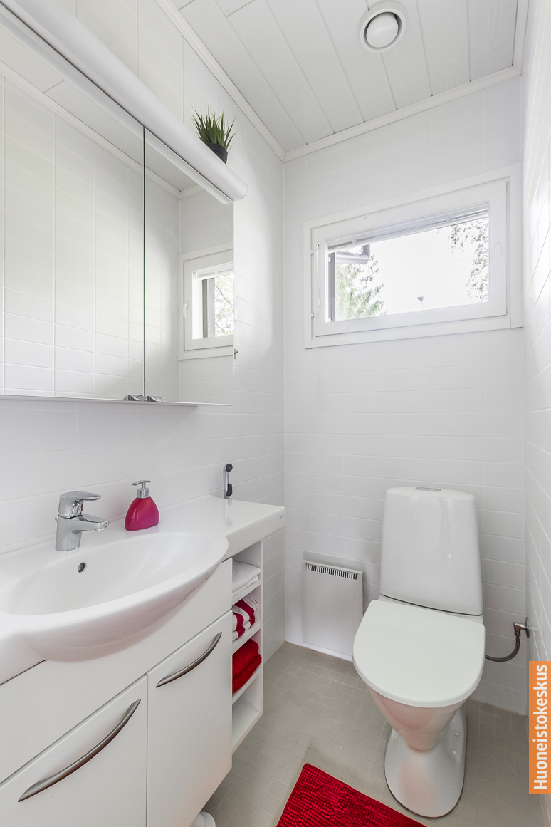 | Kylpyhuoneen kuvaus | Pesukoneliitäntä, allaskaappi, lattialämmitys, peilikaappi ja suihku, seinät (kaakeli), lattiat (laatta) |