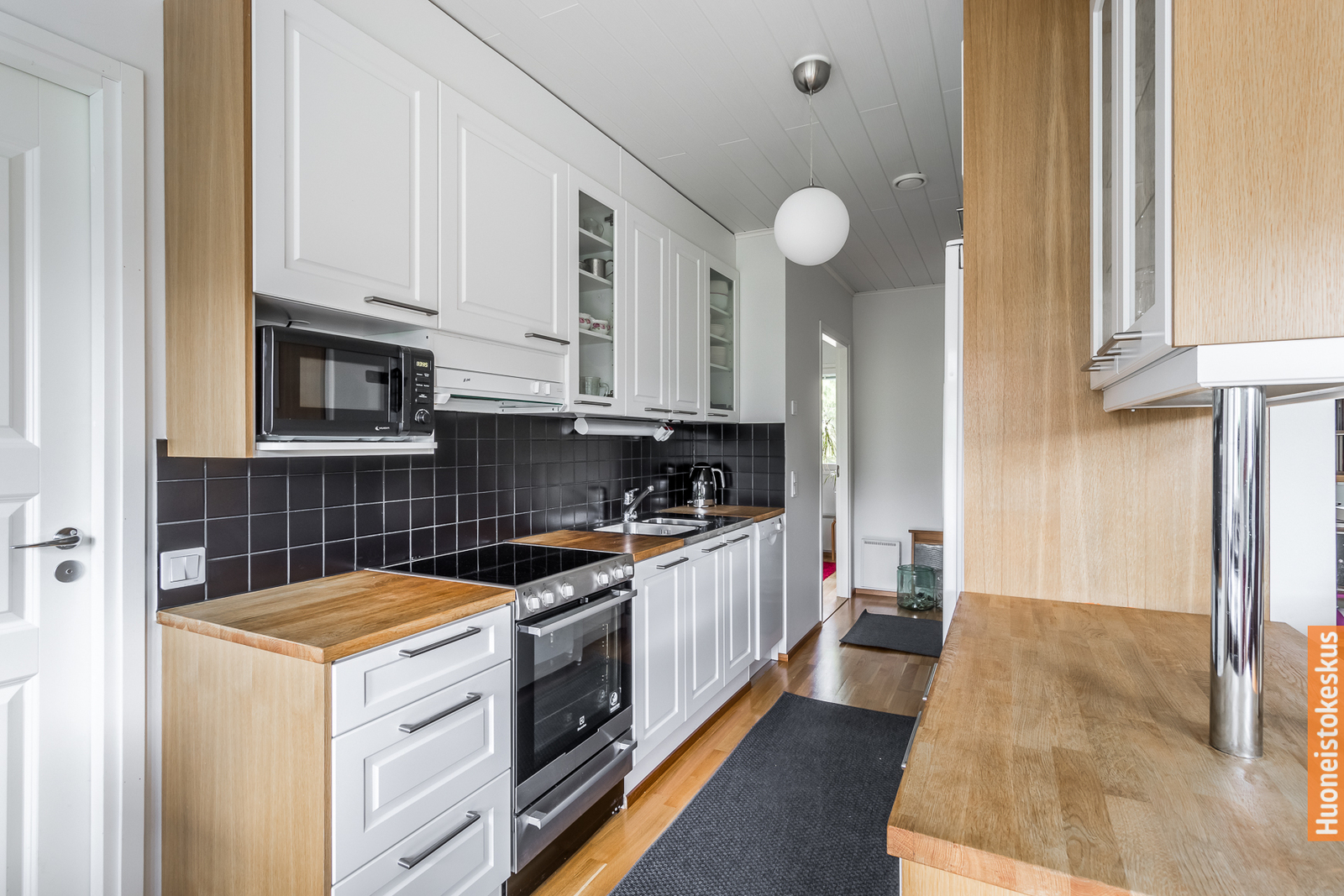 | Keittiön kuvaus | Liesi (Keraaminen liesi), työtasot (puu), seinät (maali), lattiat (parketti), jääkaappi, erillinen pakastin, astianpesukone ja liesituuletin / hormi |