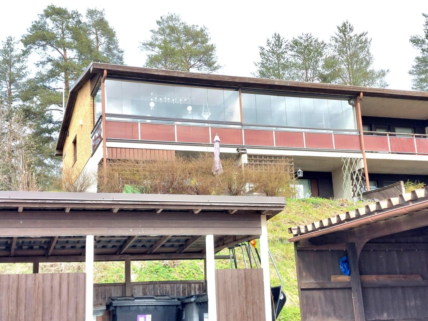 Keittiö ja olohuone ovat avointa tilaa, josta pääset n.15 m2 lasitetulle parvekkeelle, josta upeat näkymät. Ei näköyhteyttä toisiin taloihin. Parvekkeen lisäksi suojaisa oleskelupiha.