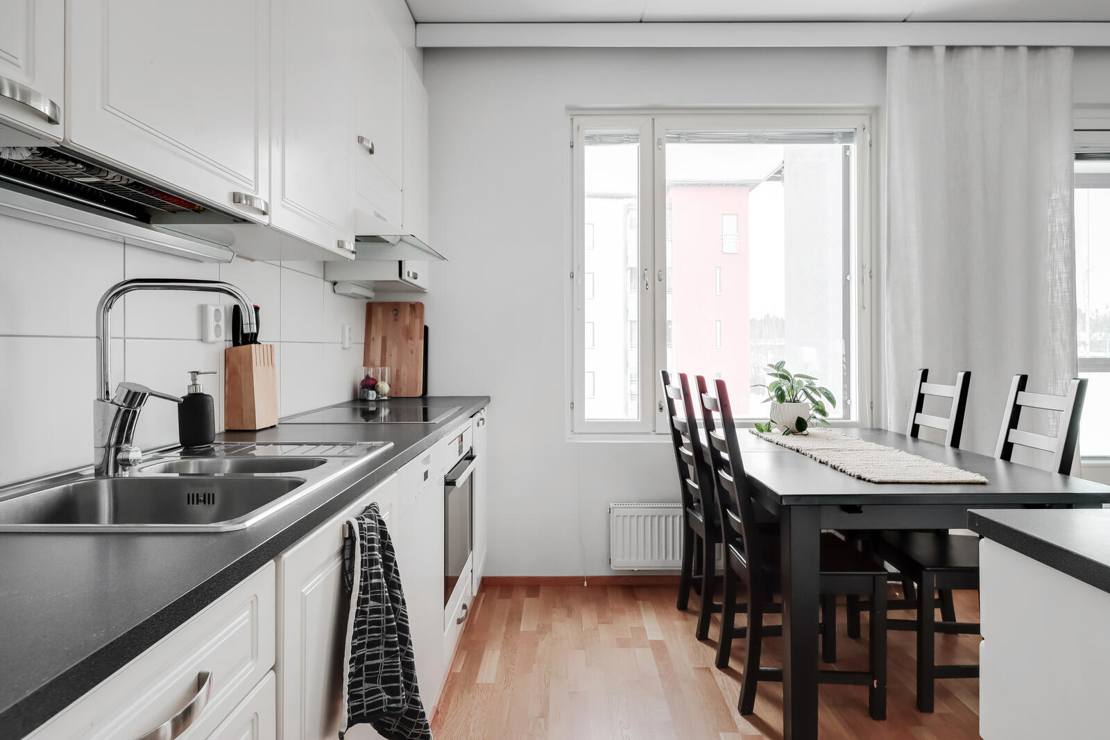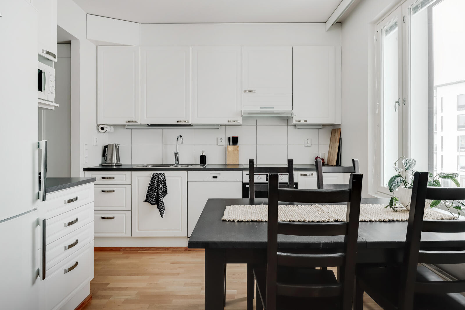 Liesi (Keraaminen liesi), työtasot (laminaatti), seinät (laatta ja maali), lattiat (parketti), astianpesukone, jääkaappipakastin, liesituuletin ja kiinteät valaisimet |