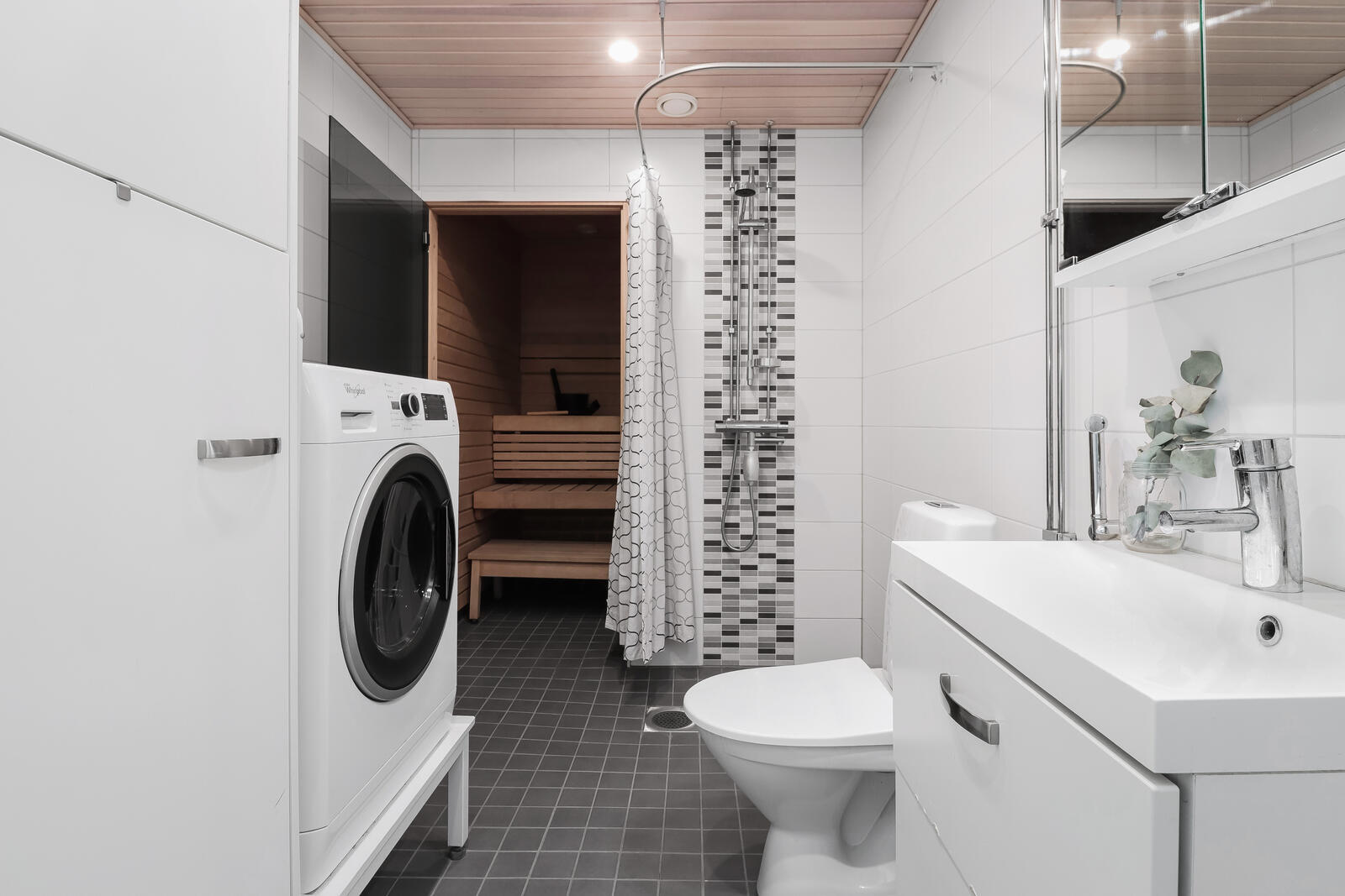 Lattialämmitys, suihku, wc-istuin, pesukoneliitäntä ja kiinteät valaisimet, seinät (kaakeli), lattiat (laatta) |