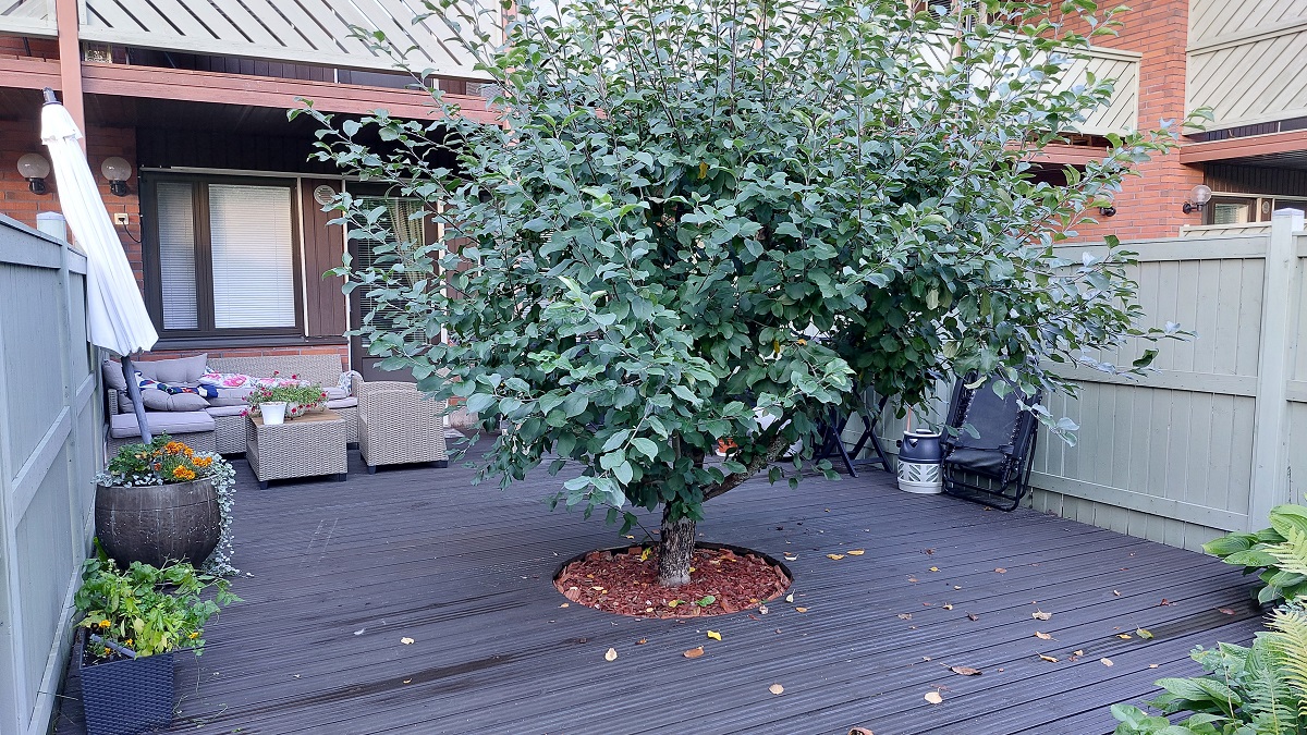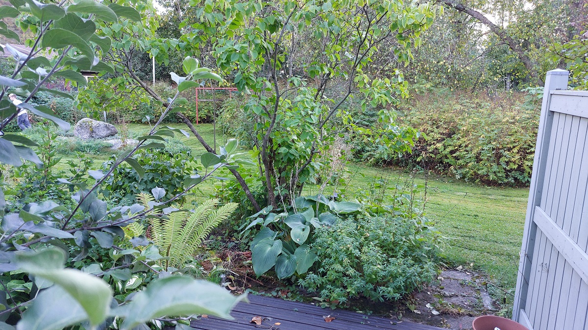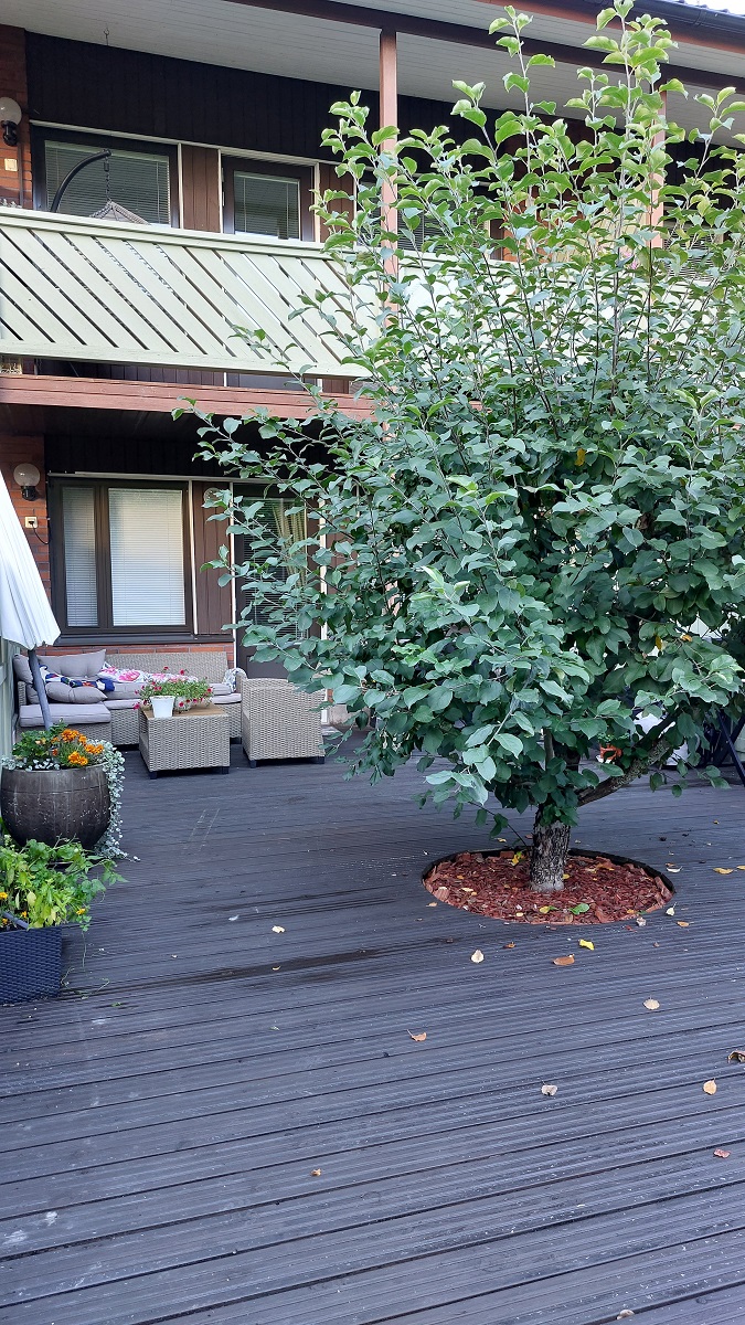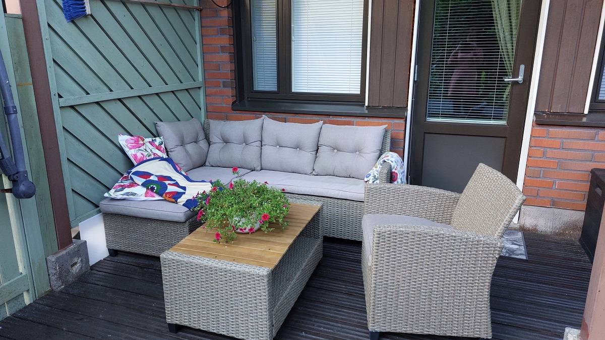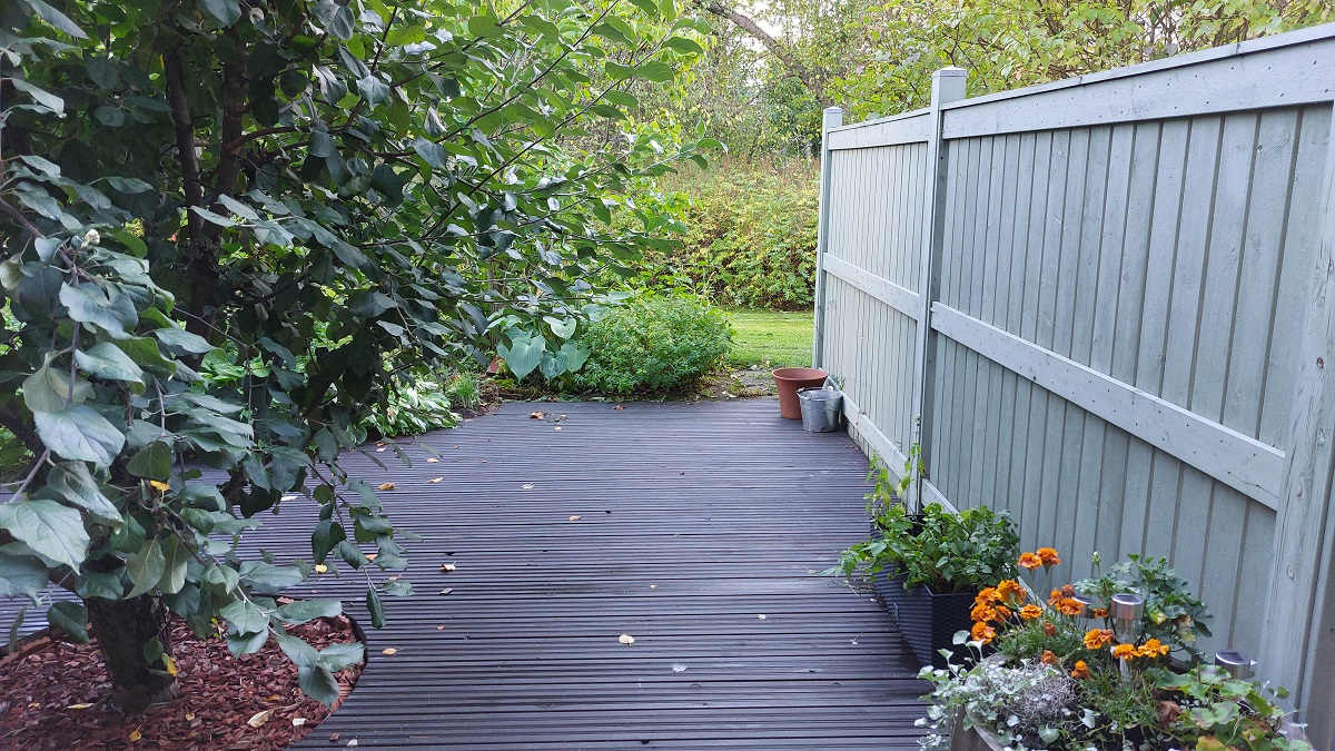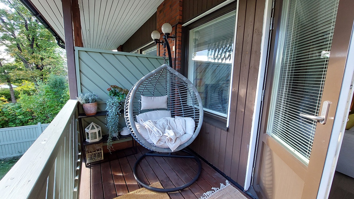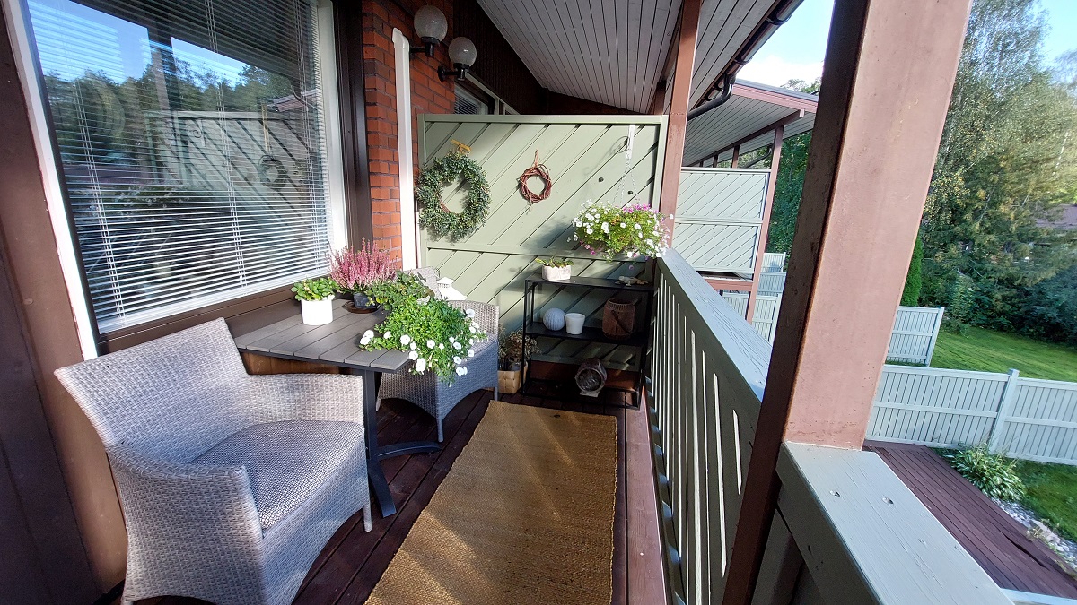 Parvekkeelta on kaunis näkymä omalle puutarhamaiselle takapihalle.