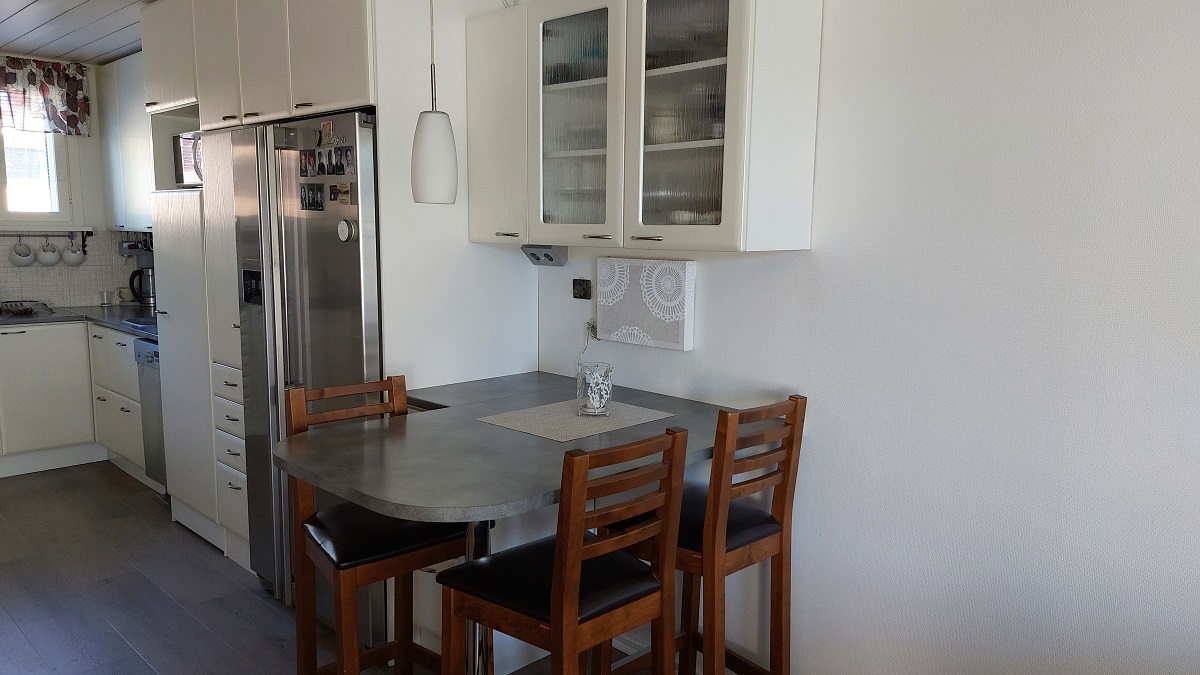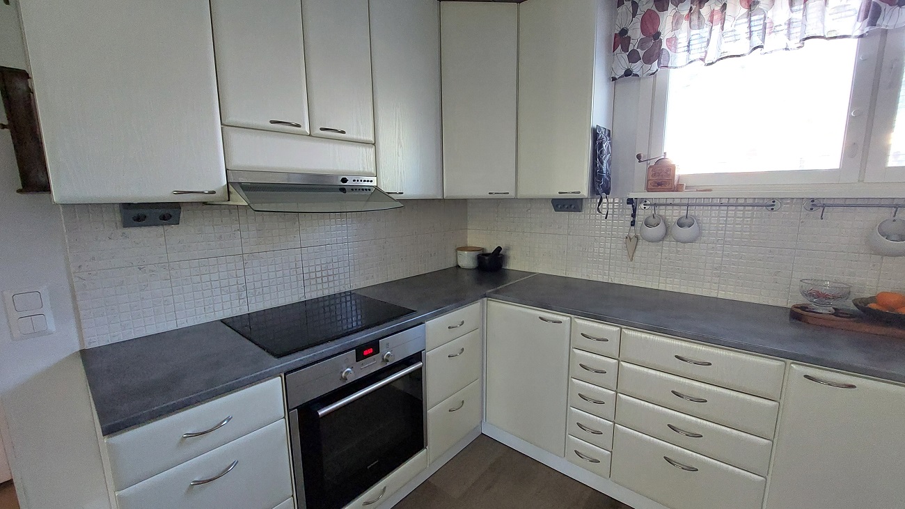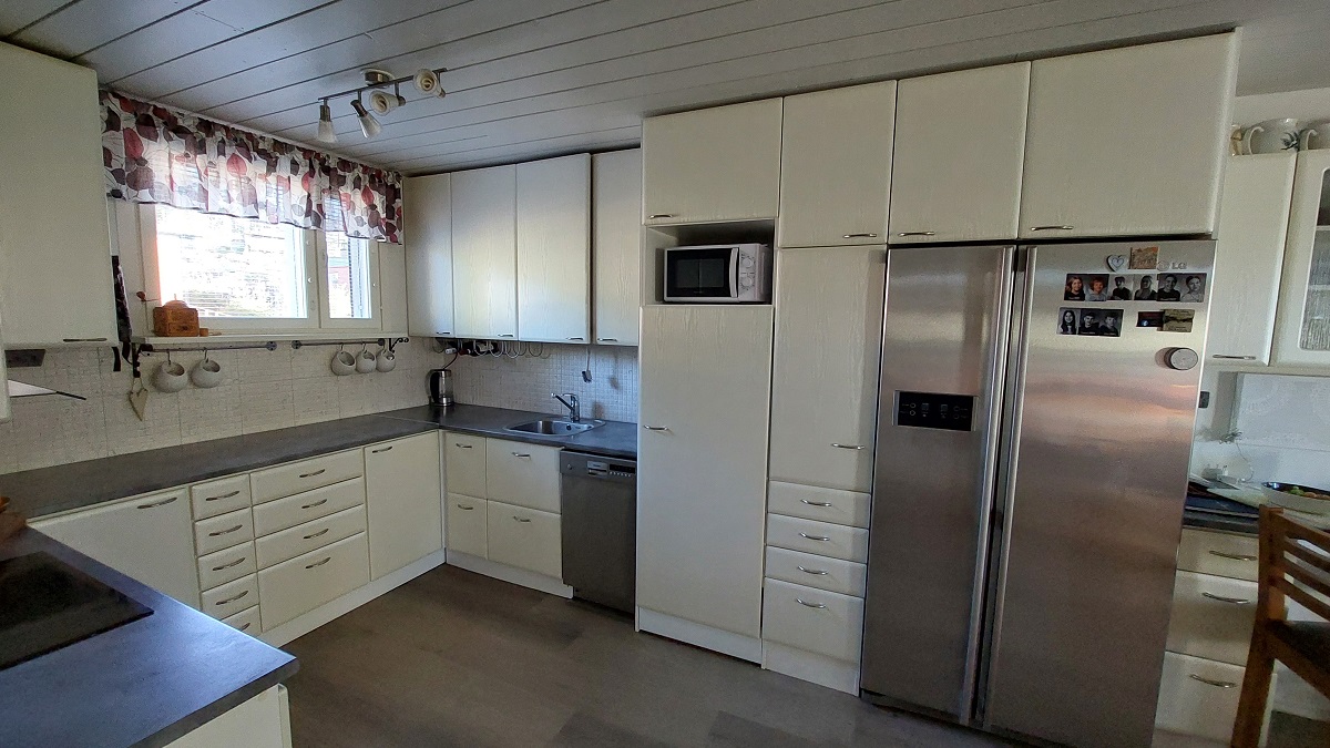 Liesi (Induktioliesi), työtasot (laminaatti), seinät (maali), lattiat (vinyyli ja vinyylilankku), jääkaappi, liesi, liesituuletin, astianpesukone ja erillisuuni |