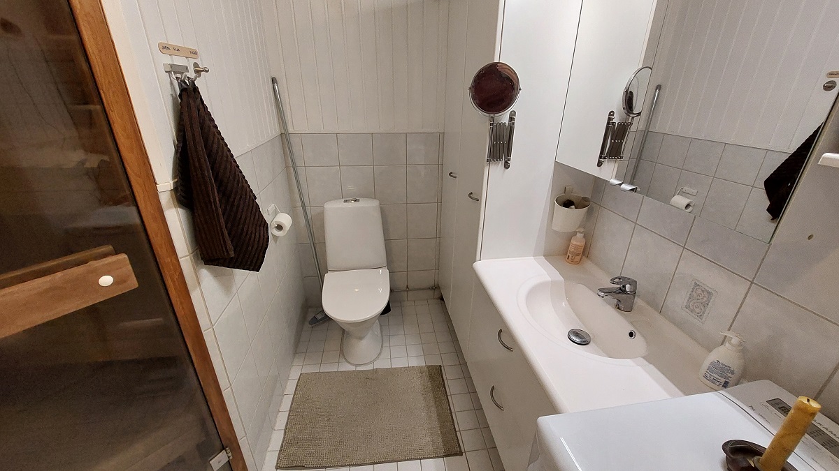 Suihku, wc-istuin, pesuallas, bidee-suihku, lattialämmitys, pesukoneliitäntä ja peilikaappi, seinät (kaakeli), lattiat (laatta) |