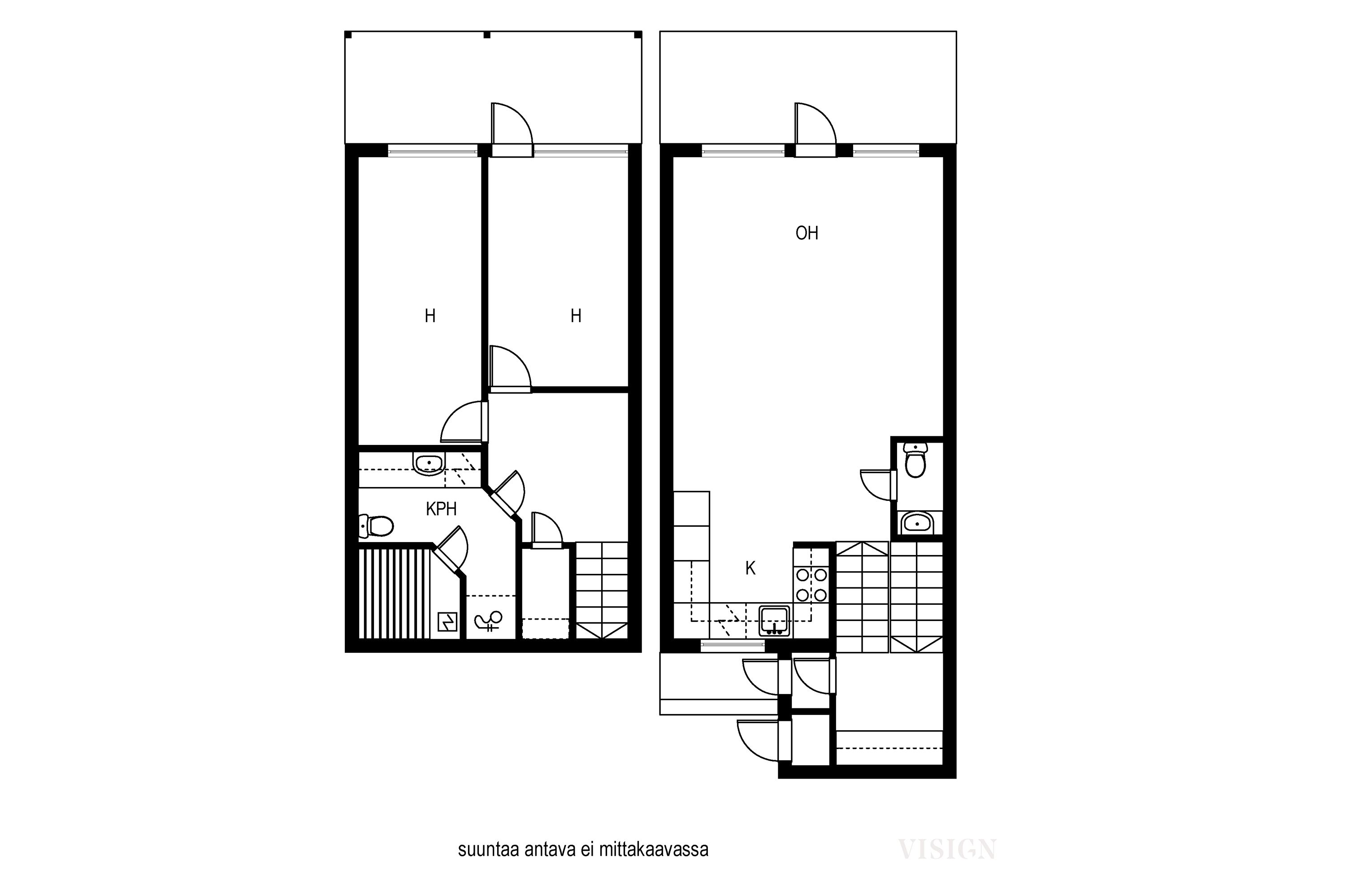 Pieniä muutoksia, mm. keittiöstä poistettu yksi väliseinä, samoin alakerrassa toisen makuuhuoneen yksi väliseinä ja kaapisto poistettu |