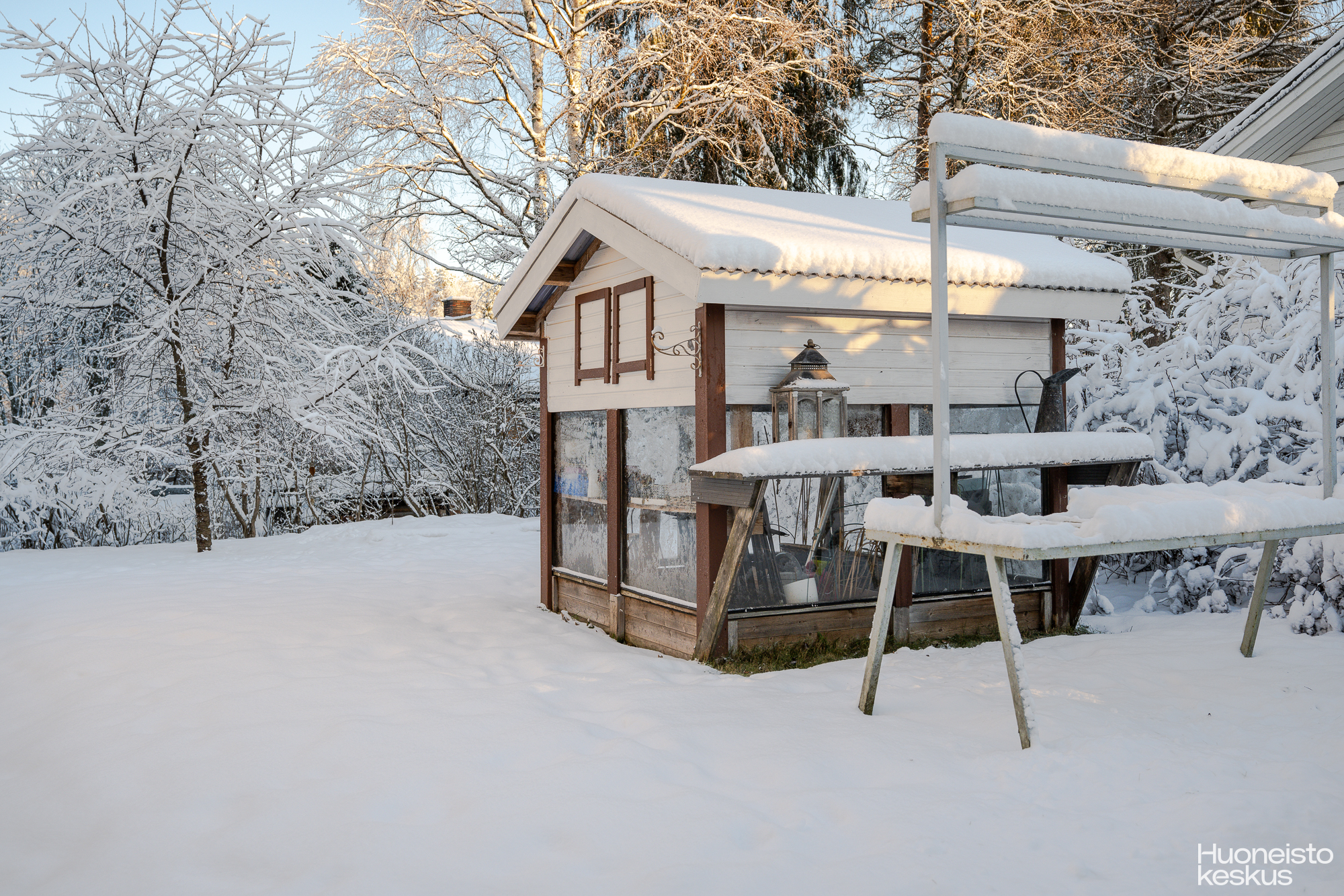 | Muuta kauppaan kuuluvaa | Istutukset, kasvihuone, jätesäiliöt, lämminvesivaraaja, matontamppausteline, pyykinkuivausteline, sälekaihtimet/rullaverhot, verhotangot |