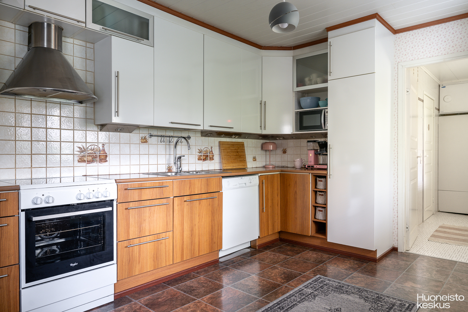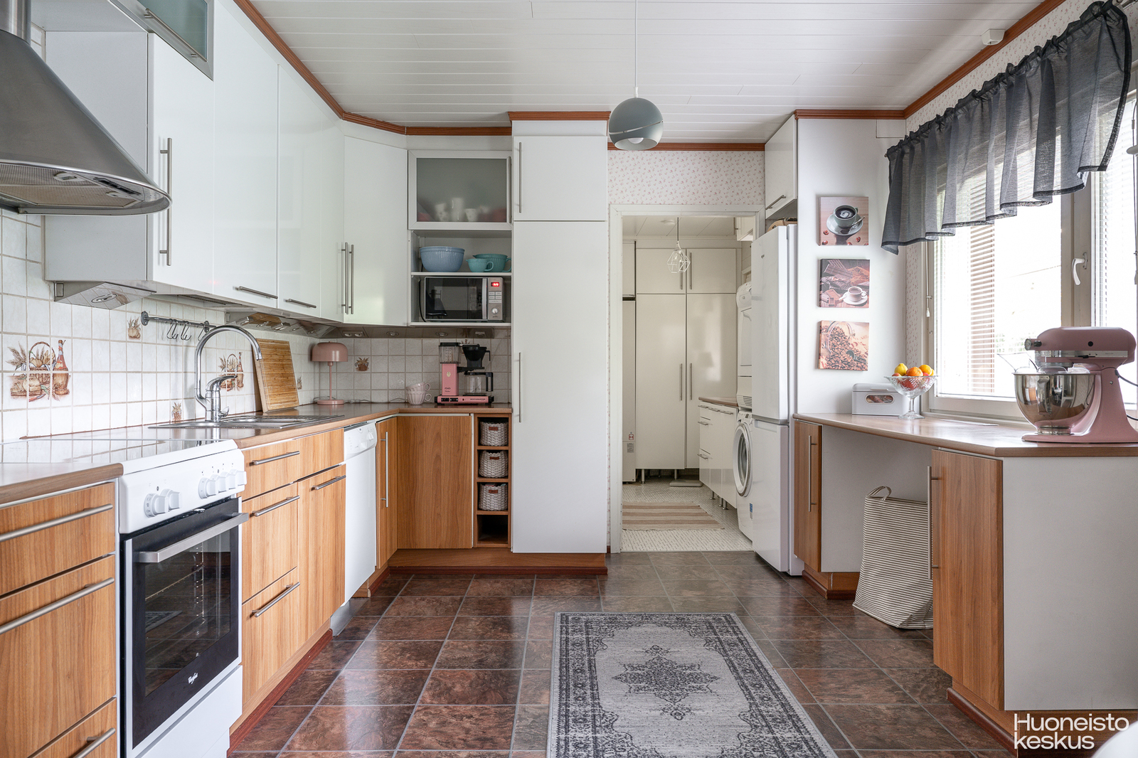 | Keittiön kuvaus | Liesi (Keraaminen liesi), työtasot (laminaatti), seinät (tapetti), lattiat (laminaatti), astianpesukone, liesituuletin, jääkaappipakastin ja kiinteät valaisimet |
