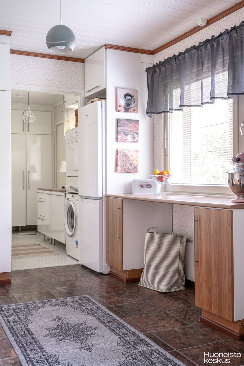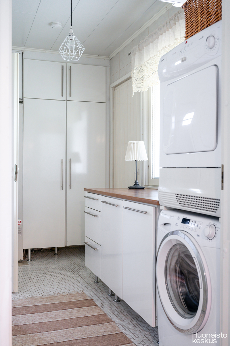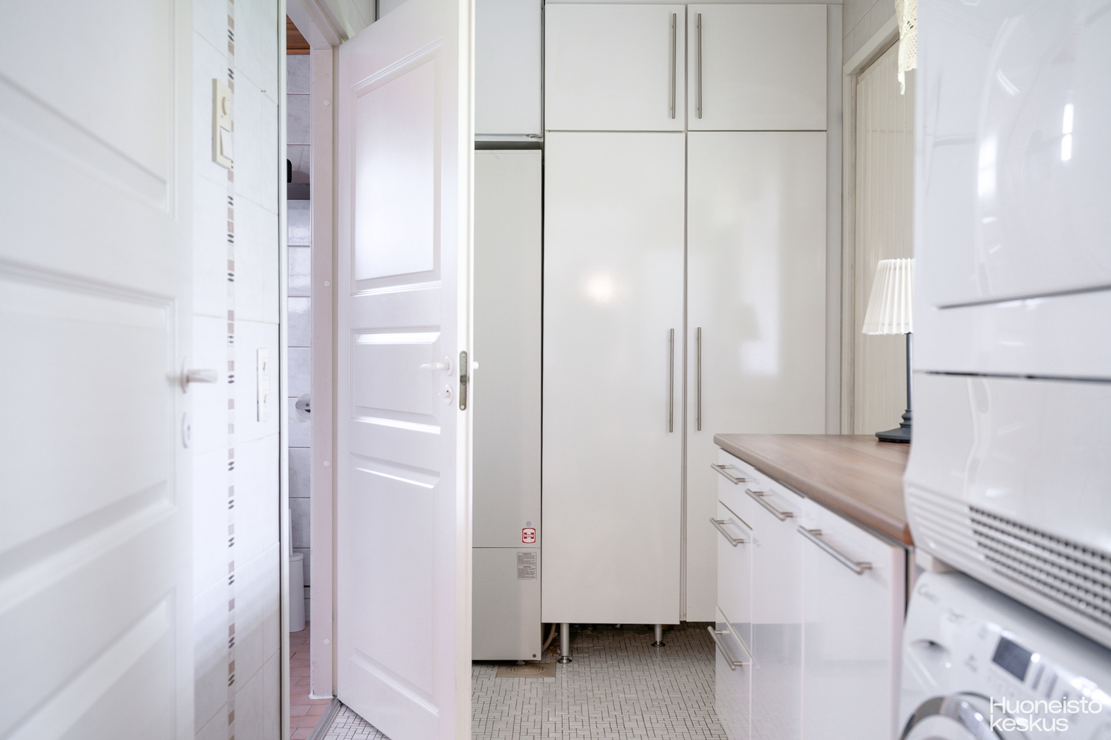 | Kodinhoitohuoneen kuvaus | Lattiakaivo, pyykkikaapit, lattialämmitys, pesukoneliitäntä, pöytätaso ja tila pesutornille, lattiat (laatta), seinät (kaakeli) |