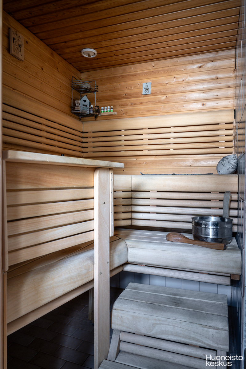 | Saunan kuvaus | Seinät (puu), lattiat (laatta), Sähkökiuas |