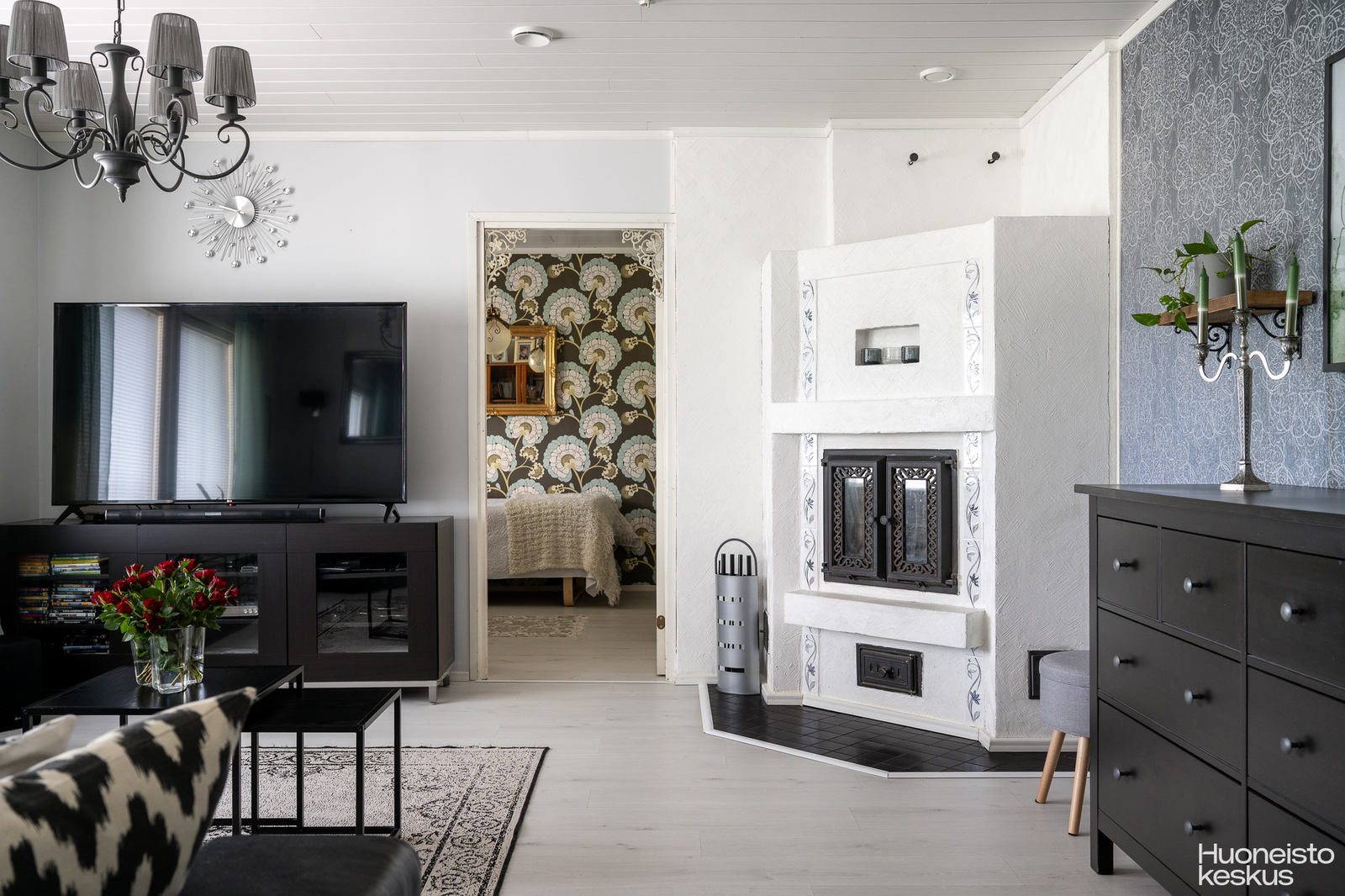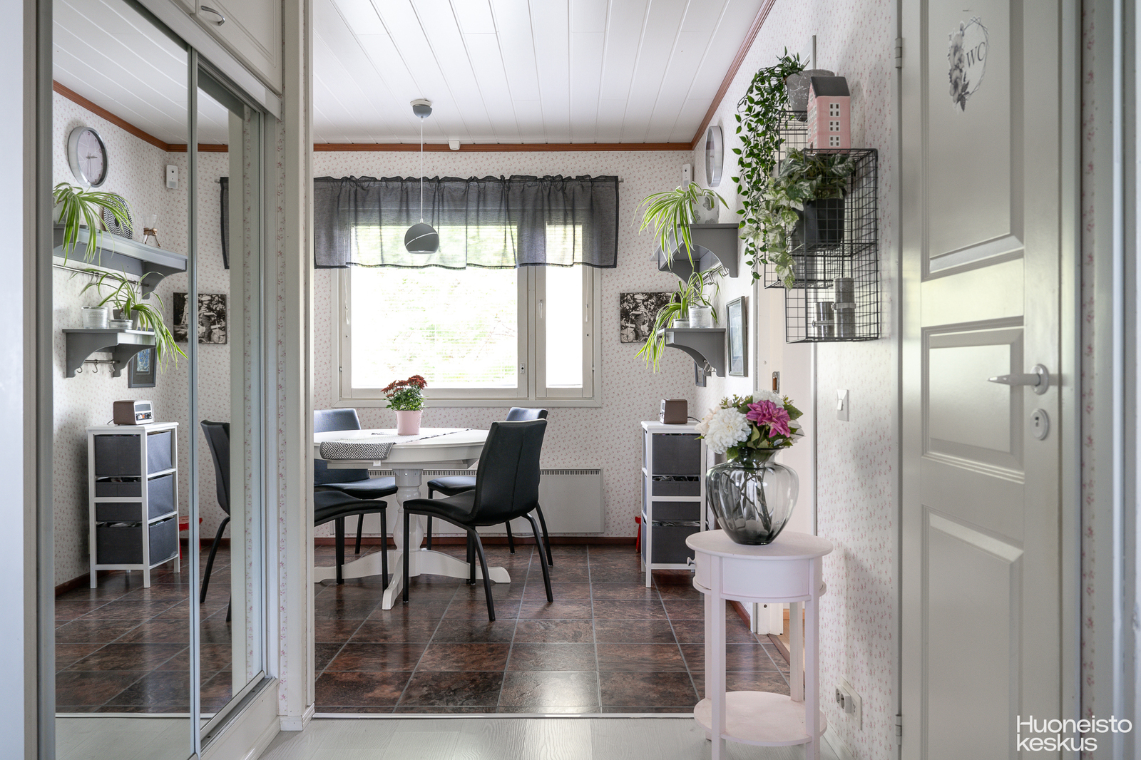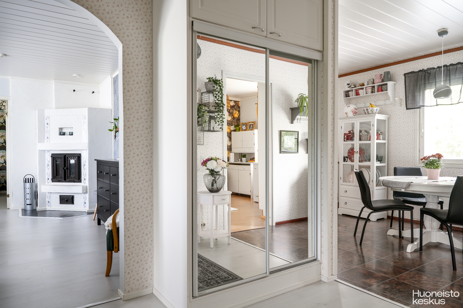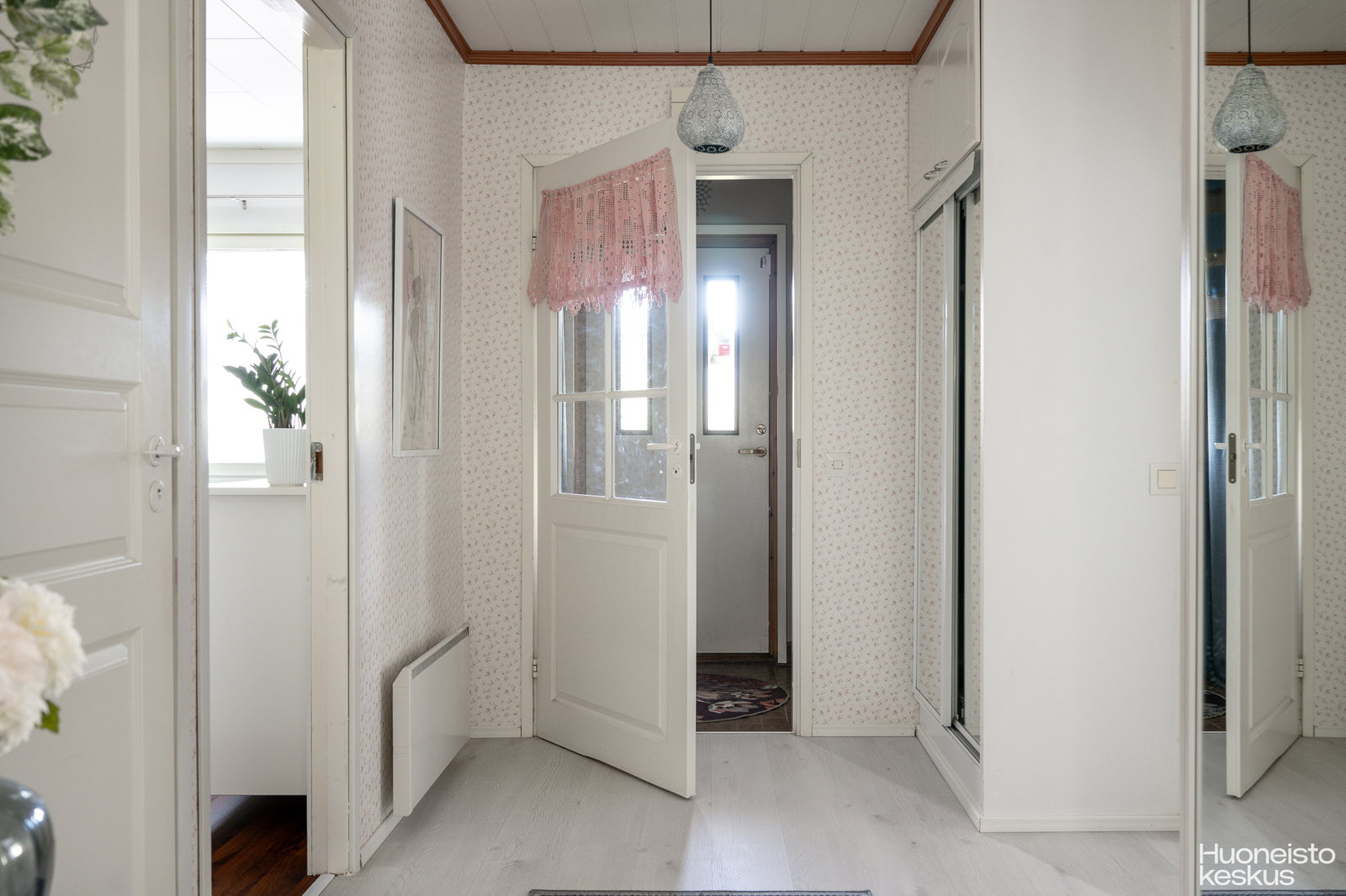 Kodin pohjaratkaisu on käytännöllinen ja soveltuu monenlaisiin elämäntilanteisiin. Kolme toisistaan erillään olevaa makuuhuonetta, kaksi wc:tä ja erillinen keittiö tuo arkeen toimivuutta. Kodinhoitohuoneessa on paljon kaappi- ja laskutilaa sekä kulku suoraan ulos. Ulkoleikeistä mukaan tarttuneet hiekat ja kurat eivät siis päädy joka paikkaan. Olohuoneessa on varaava takka, joka lämmittää talon talvisin.