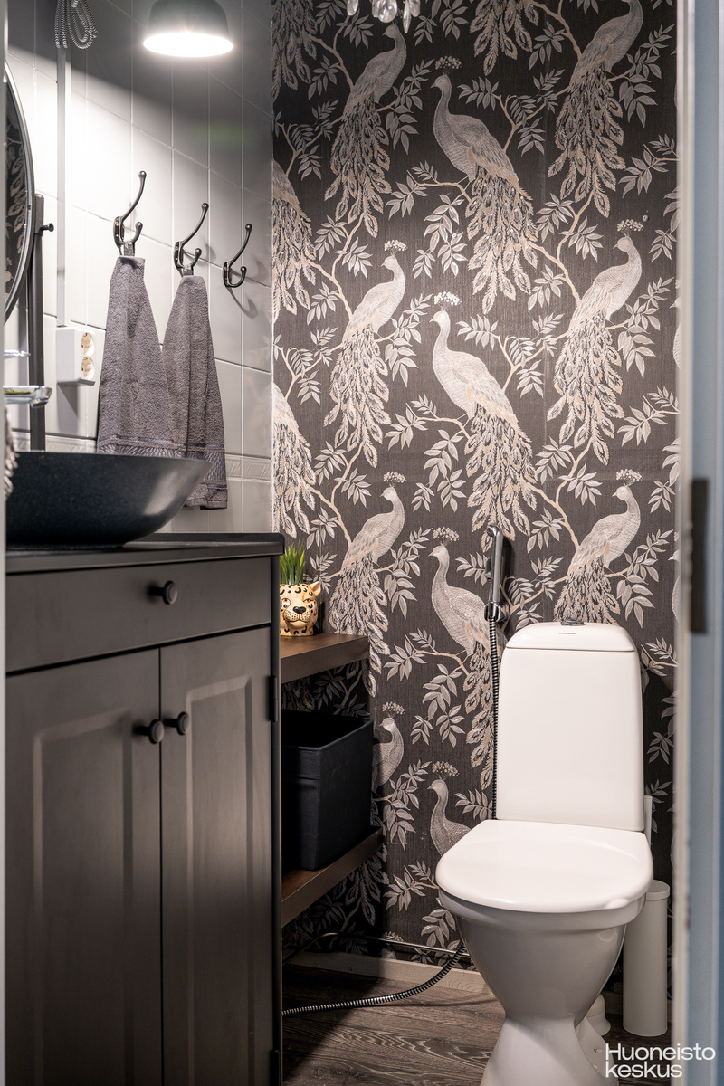 | Kylpyhuoneen kuvaus | Allaskaappi, wc-istuin, lattialämmitys, suihku ja peili, seinät (kaakeli), lattiat (laatta) |