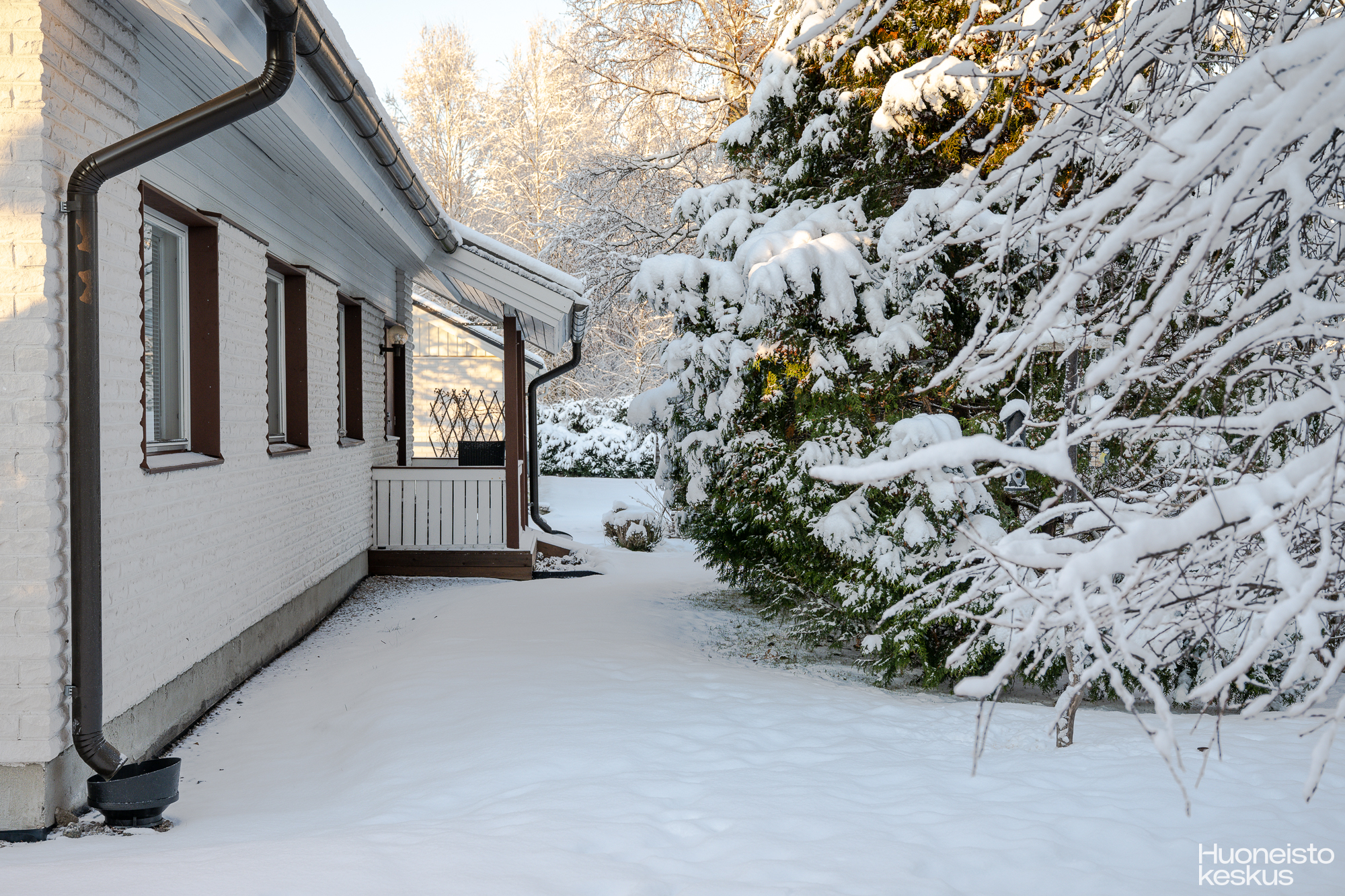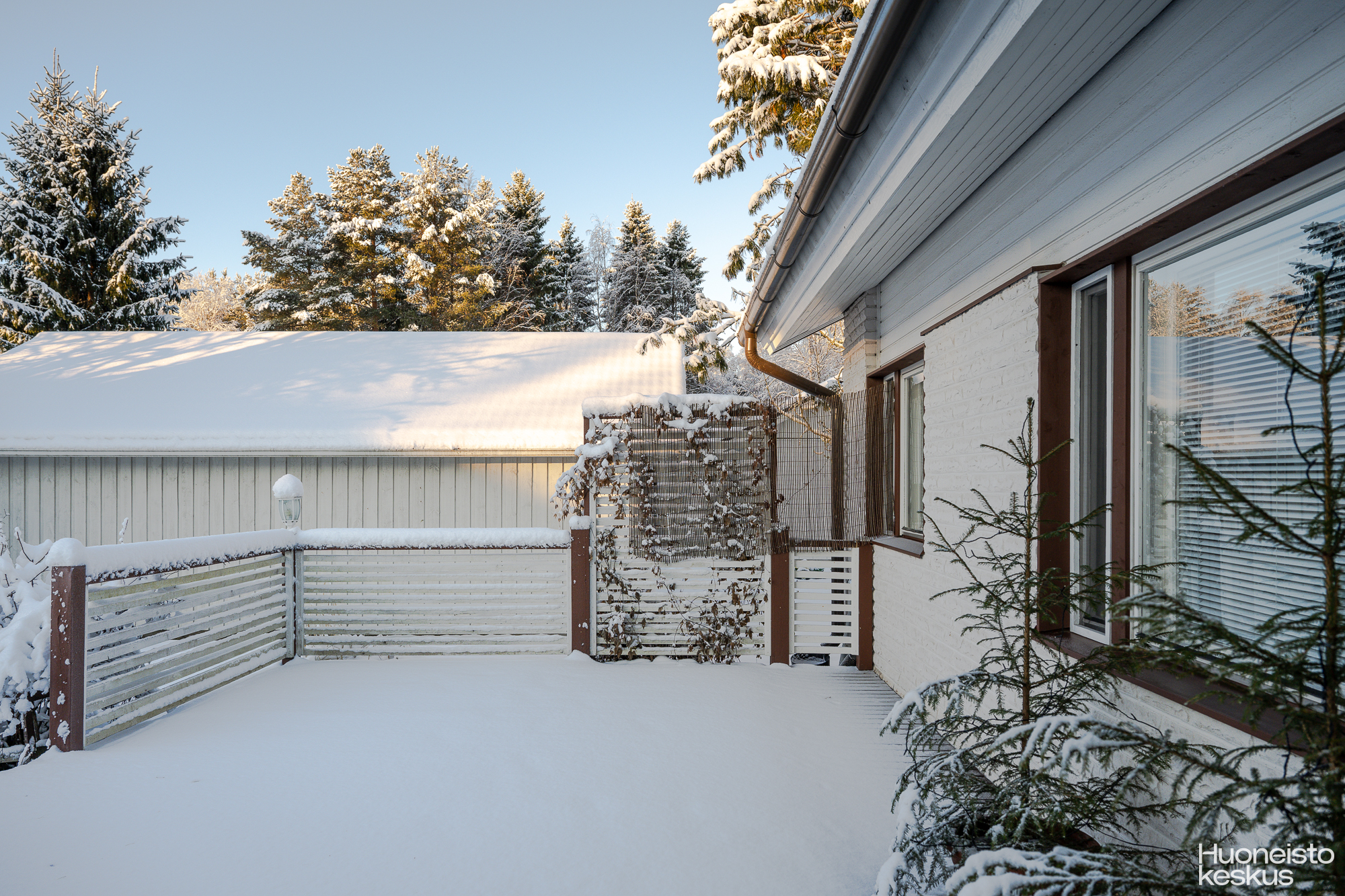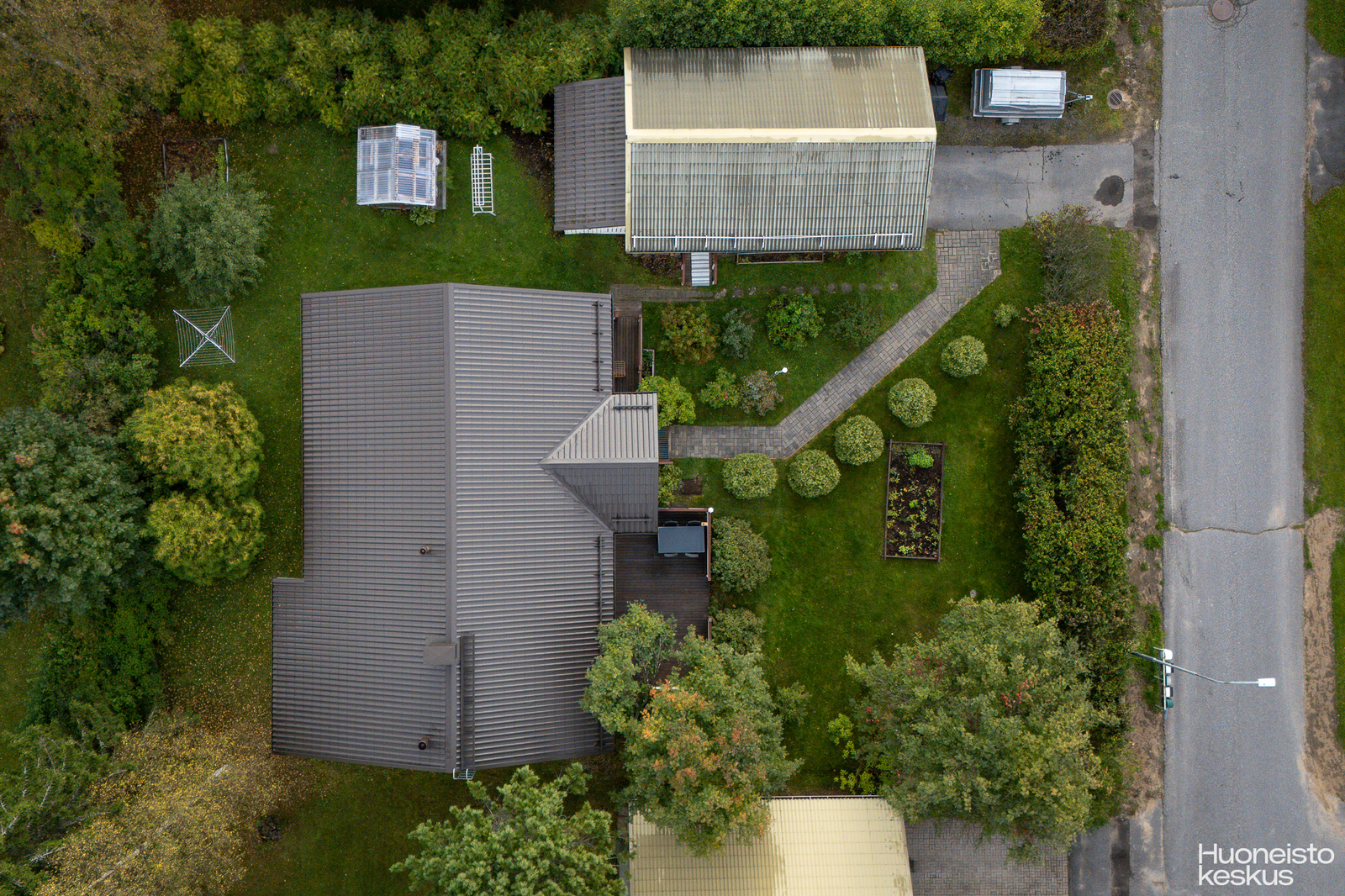 Pihassa on tilava puolilämmin autotalli, varasto sekä oma kasvihuone. Etupihalla on tilava terassi, jossa voi nauttia kesäpäivästä vaikka grillijuhlien merkeissä. Marja-aronia-aita tuo yksityisyyttä ja suojaa. Ruusupensaat tuoksuvat läpi kesän huumaavina.