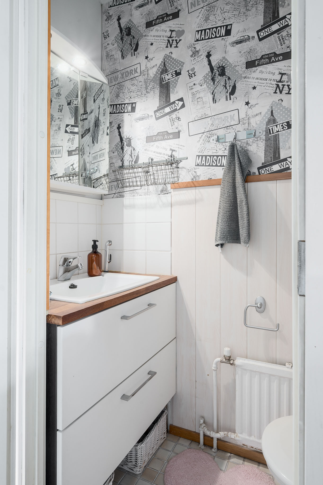 Lukumäärä: 1, WC-istuin ja bidee-suihku, seinät (Puolipaneeli ja tapetti), lattiat (Laatta) |