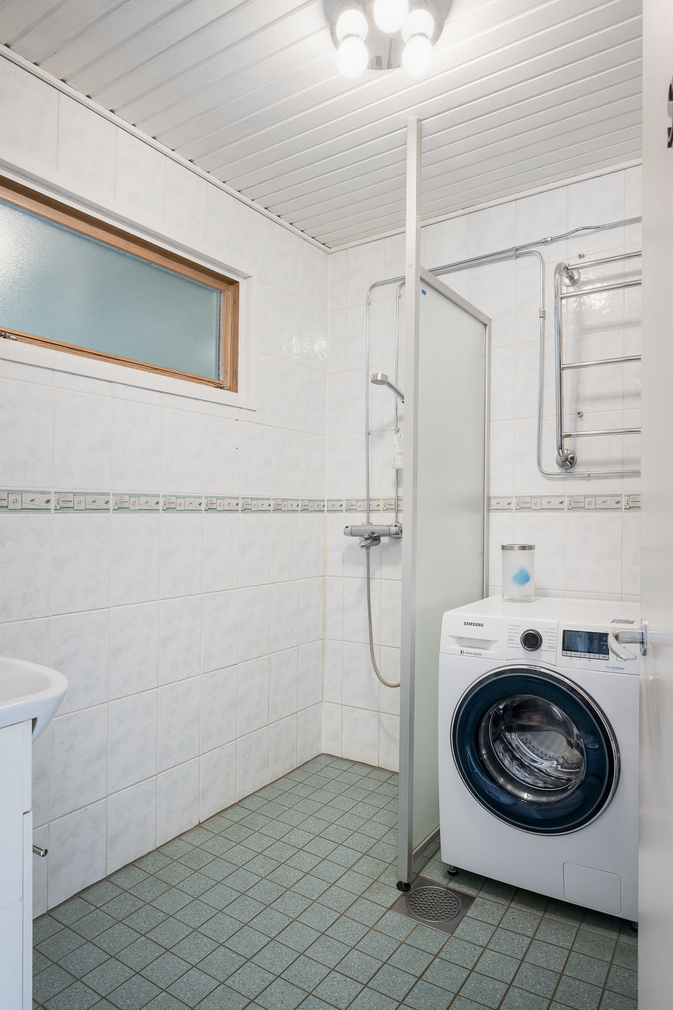 Suihku, pesukoneliitäntä ja lattialämmitys, seinät (kaakeli), lattiat (laatta) |