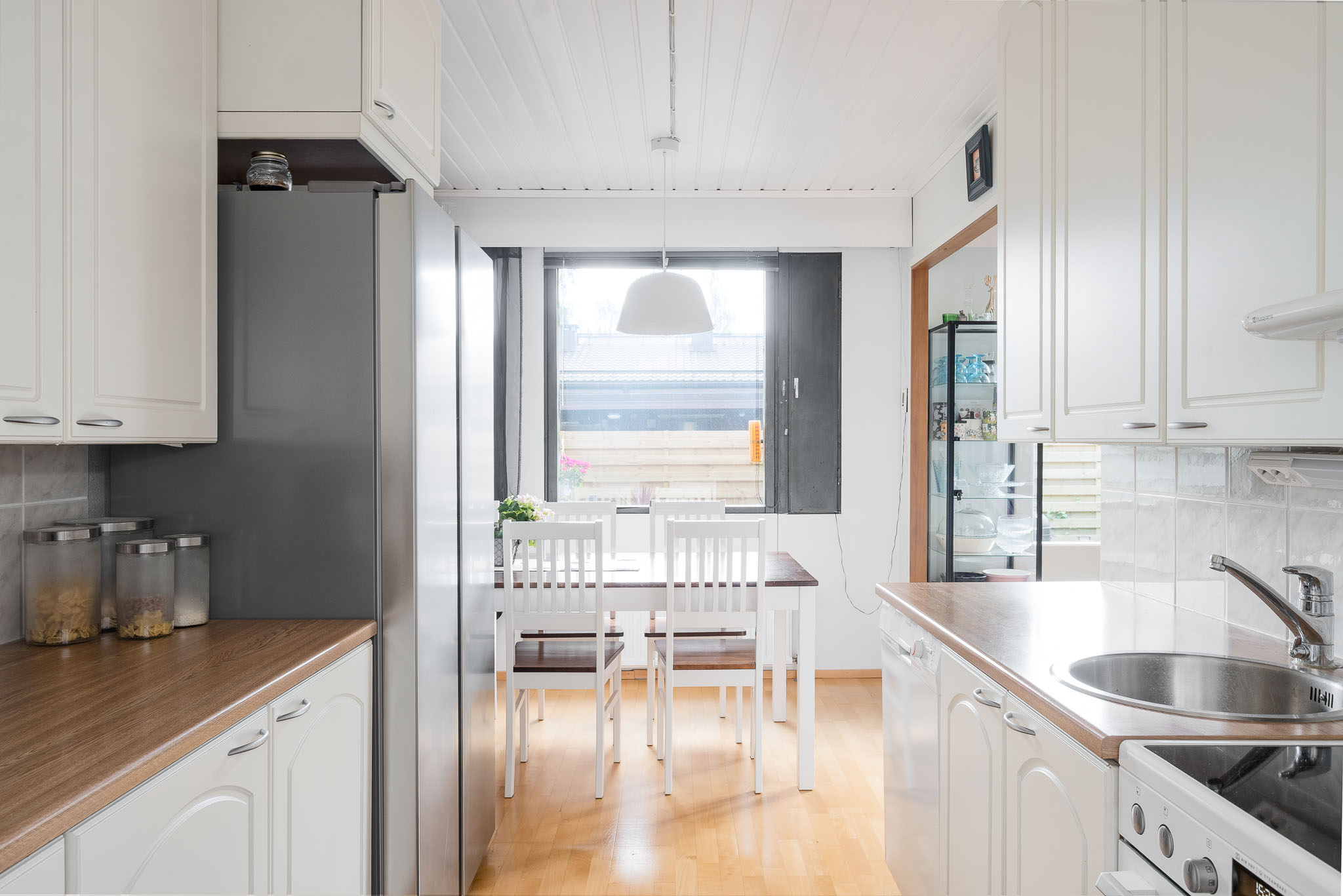 Liesi (Keraaminen liesi), seinät (maali), lattiat (parketti), jääkaappipakastin, astianpesukone ja liesituuletin |