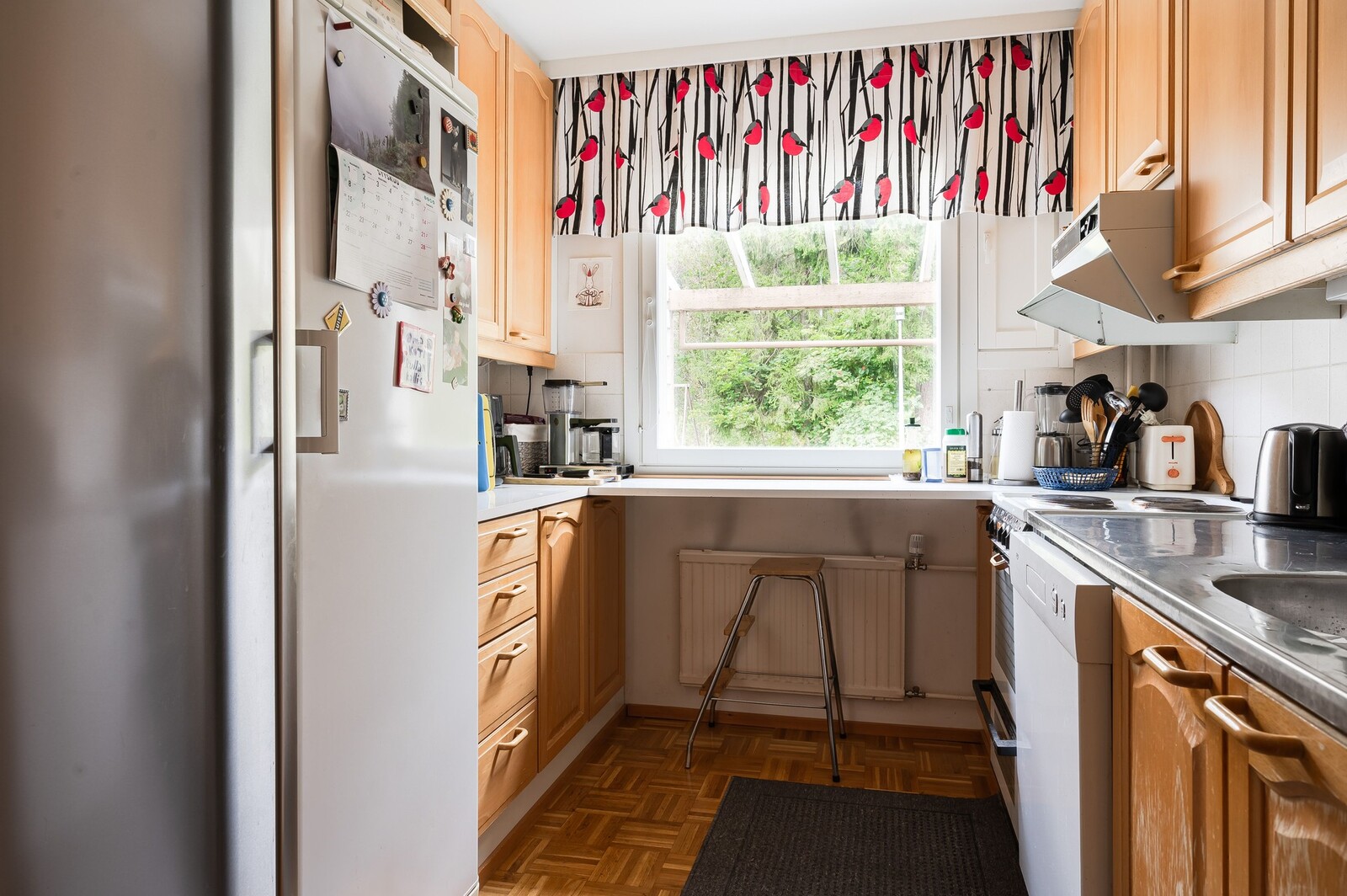 | Keittiön kuvaus | Liesi (sähköliesi), seinät (tapetti ja puolipaneeli), lattiat (parketti), astianpesukone, jääkaappi, liesi, erillinen pakastin ja liesituuletin |