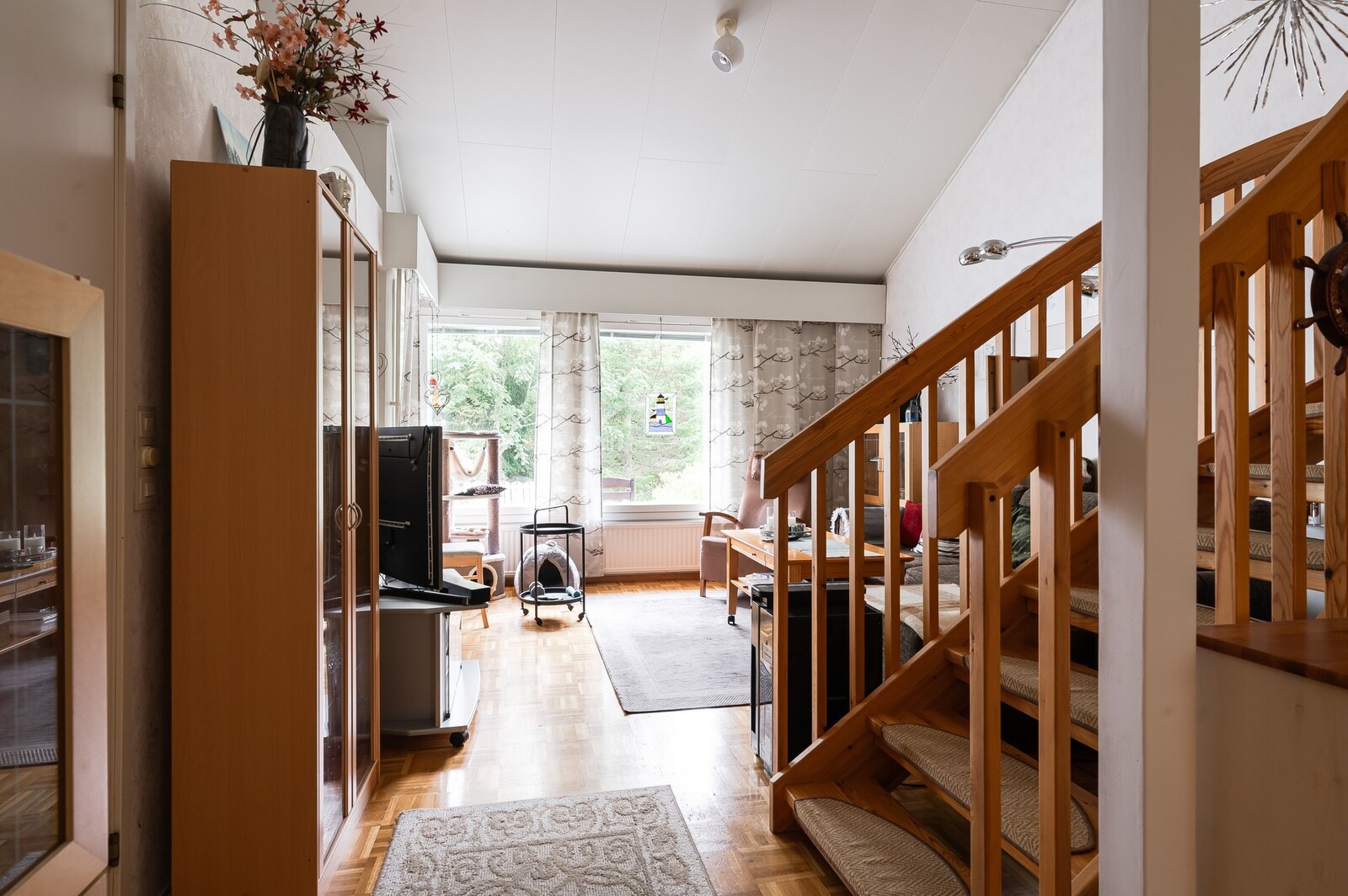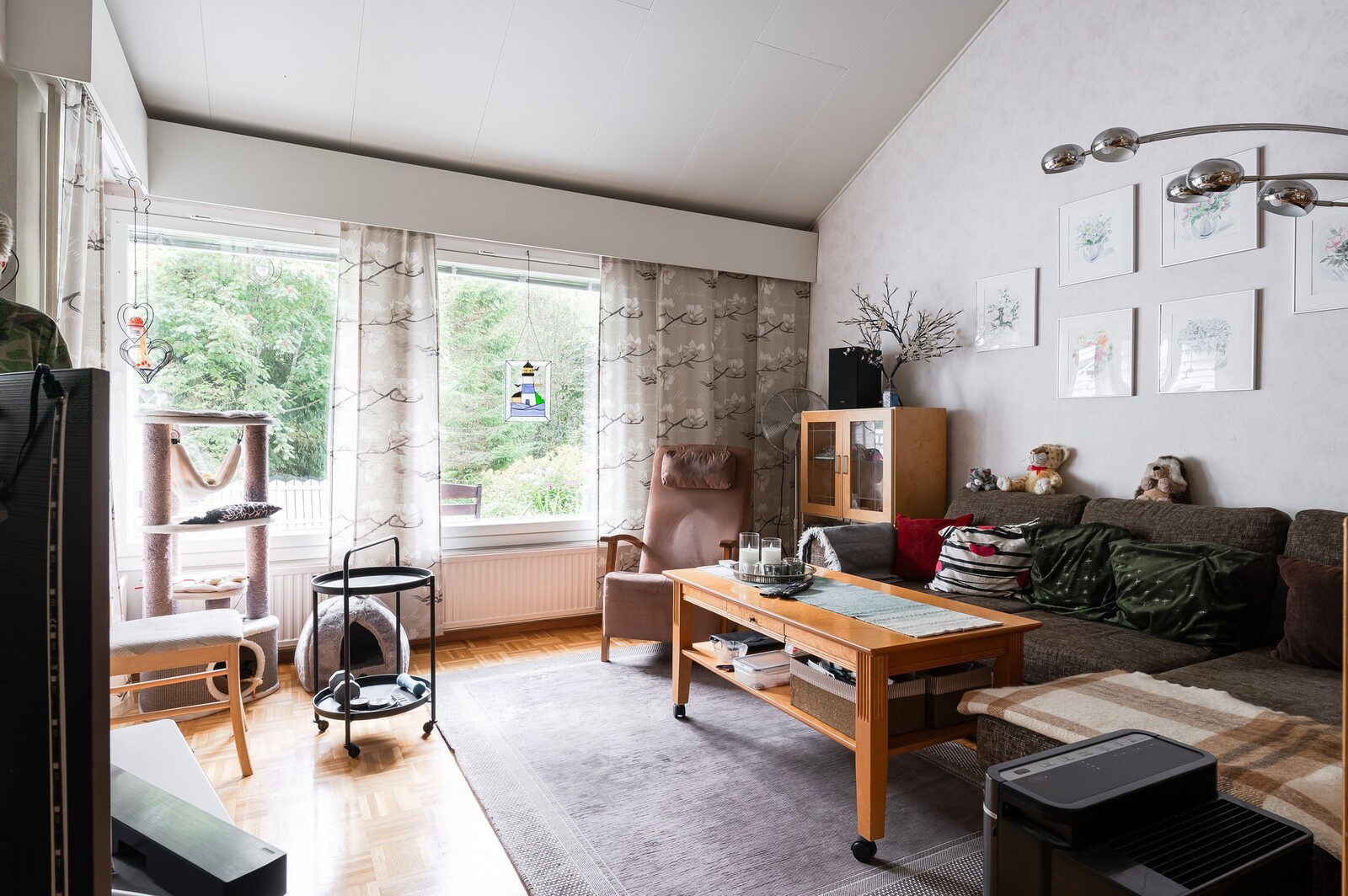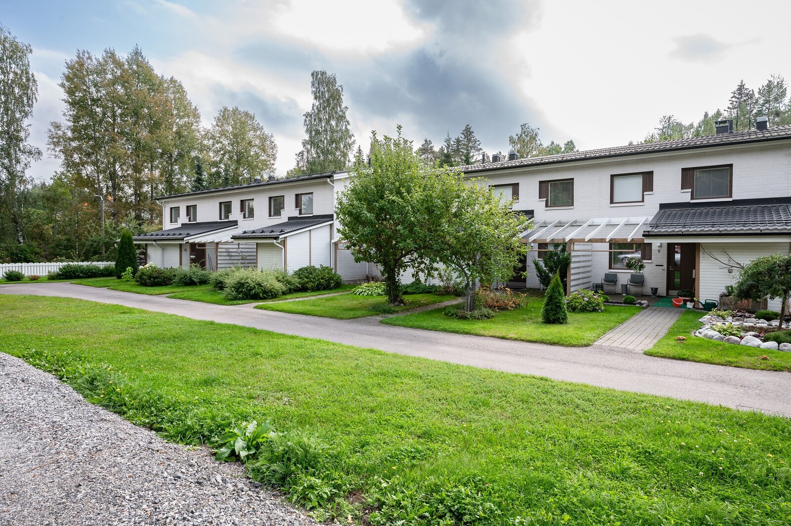 Tilava (89,5 m2) ja siisti rivitalokolmio rauhallisella sijainnilla metsän reunassa. Terassi ja piha ovat metsän suuntaan. Asumismukavuutta lisää 2 erillis-wc:tä. Asunnon kylpyhuone on remontoitu noin 2004 ja sauna 2021. Yhtiöllä on oma tontti ja remontit laajasti tehty. Edullinen hoitovastike, vain 3,20 eur/m2. Varaa oma esittelyaikasi kohteen välittäjältä.