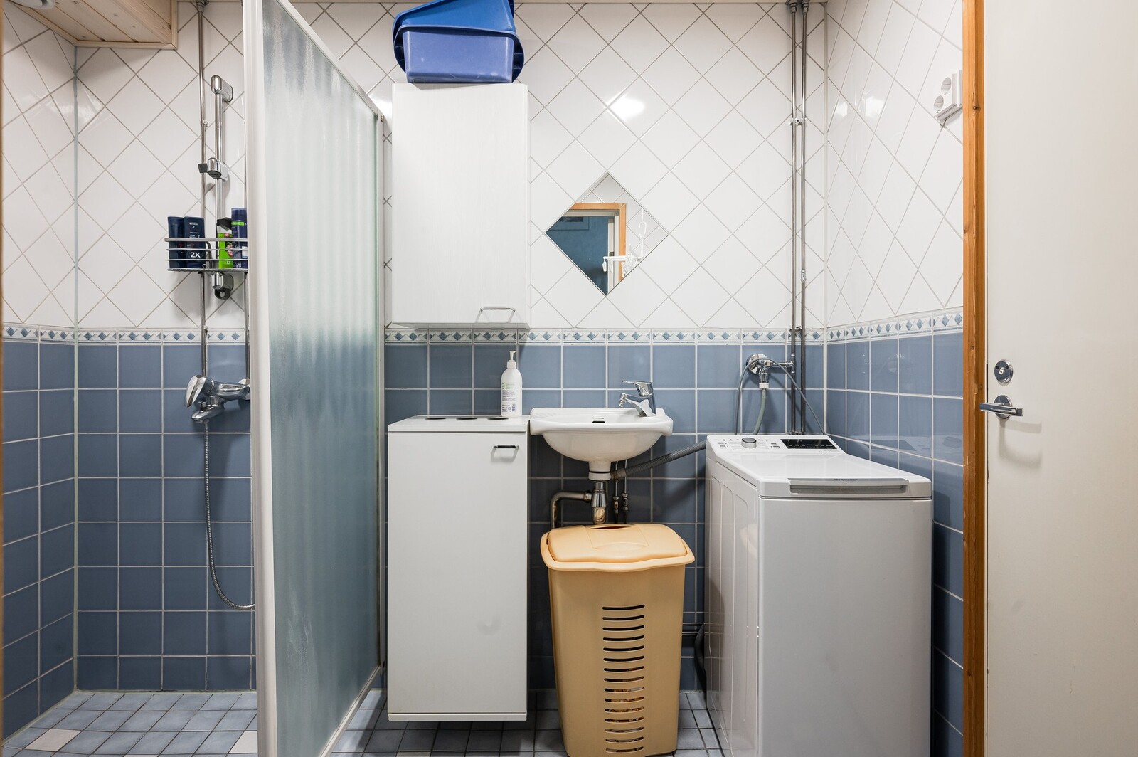 | Kylpyhuoneen kuvaus | Pesukoneliitäntä, suihku ja lattialämmitys, seinät (kaakeli), lattiat (laatta) |
