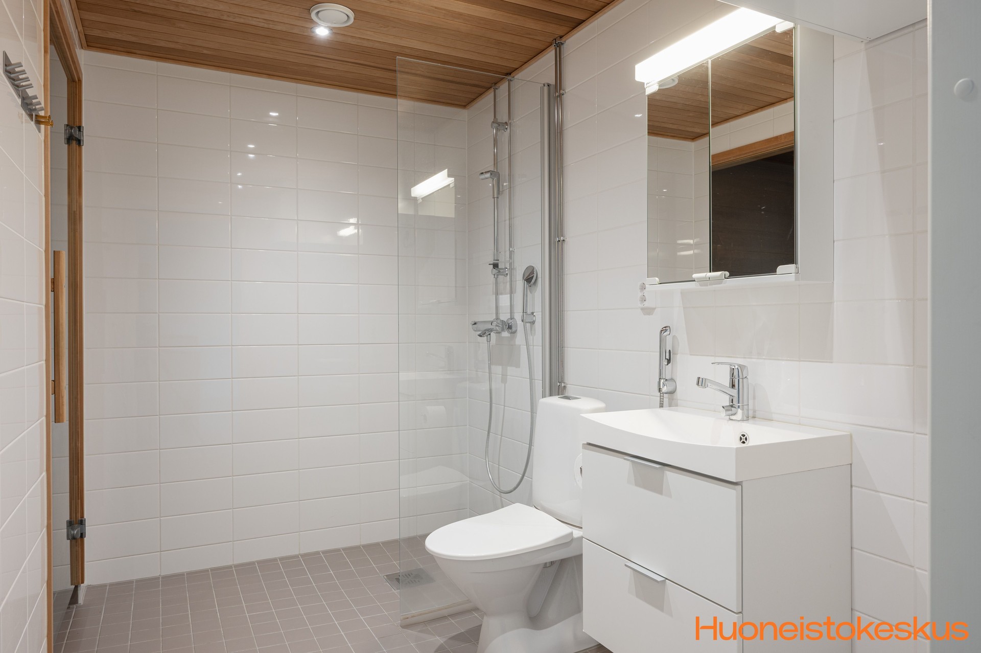| Kylpyhuoneen kuvaus | WC-istuin, suihku, suihkuseinä, pesukoneliitäntä, lattialämmitys, peilikaappi, pesuallas ja allaskaappi, seinät (kaakeli), lattiat (laatta) |