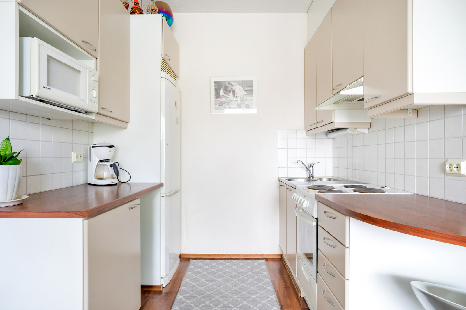 | Keittiön kuvaus | Liesi (sähköliesi), työtasot (laminaatti), seinät (laatta ja maali), lattiat (laminaatti), liesi, jääkaappipakastin, liesituuletin ja kiinteät valaisimet |