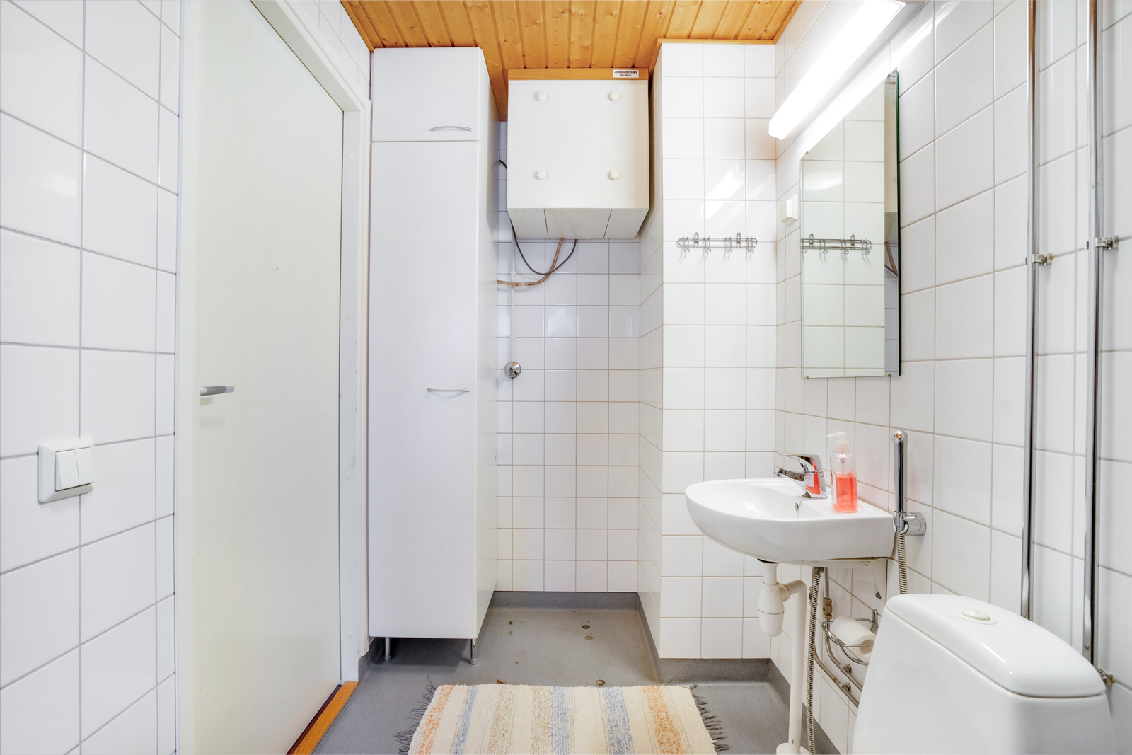 | Kylpyhuoneen kuvaus | Peili, suihku, wc-istuin, allaskaappi, pesukoneliitäntä ja kiinteät valaisimet, seinät (kaakeli), lattiat (muovimatto) |