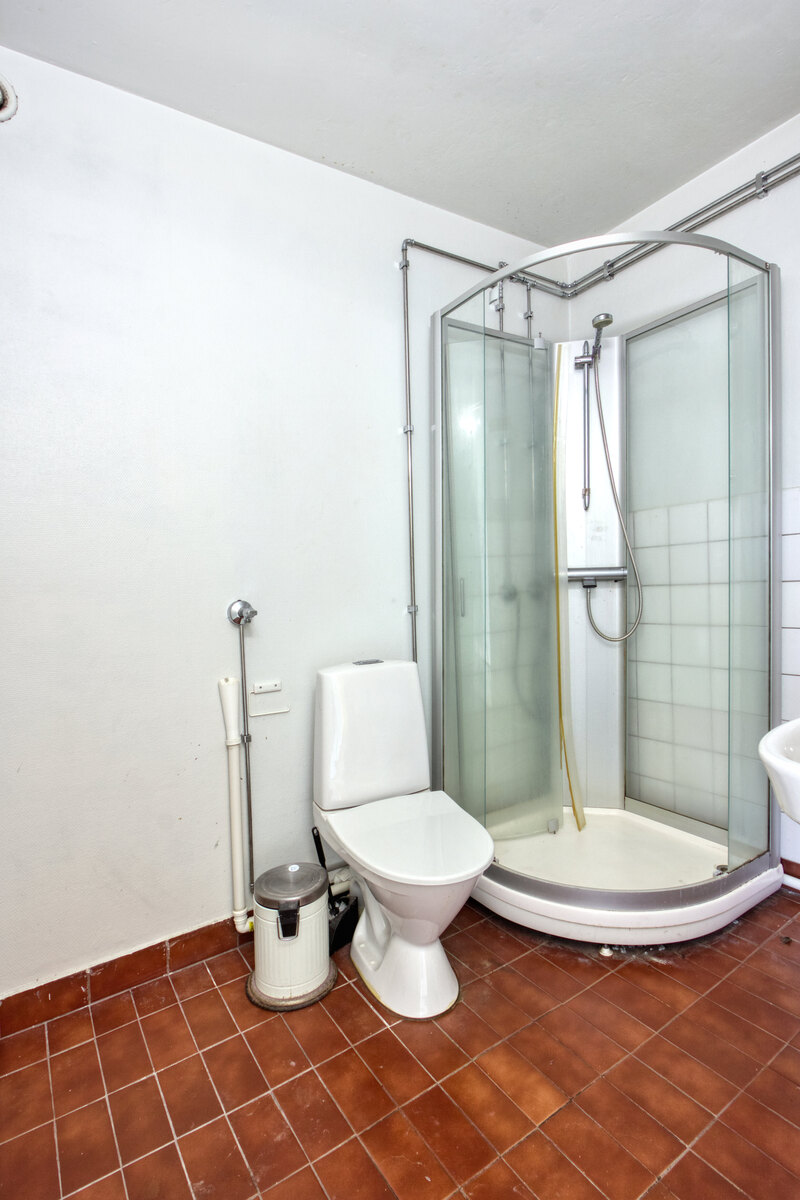Suihku, wc-istuin ja kiinteät valaisimet, seinät (lasikuitutapetti), lattiat (laatta), Katto maalattu. |