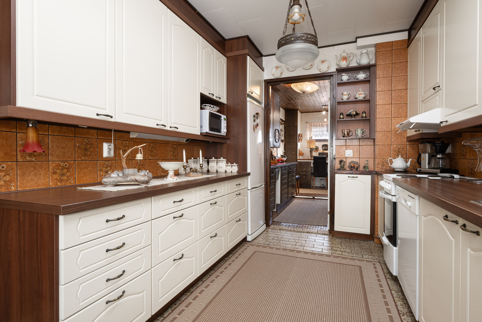 Liesi (sähköliesi), työtasot (laminaatti), seinät (laatta), lattiat (laatta), jääkaappipakastin, liesi, astianpesukone ja kiinteät valaisimet, liesituuletin / hormi |